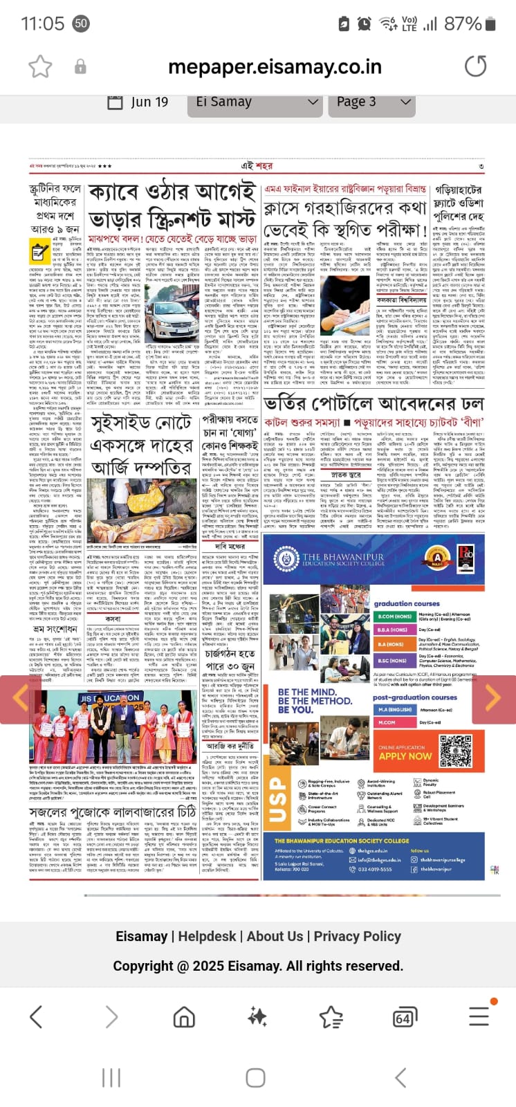 Admission 2025–26 advertisement of The Bhawanipur Education Society College featured in TOI, Sanmarg & Ei Samay