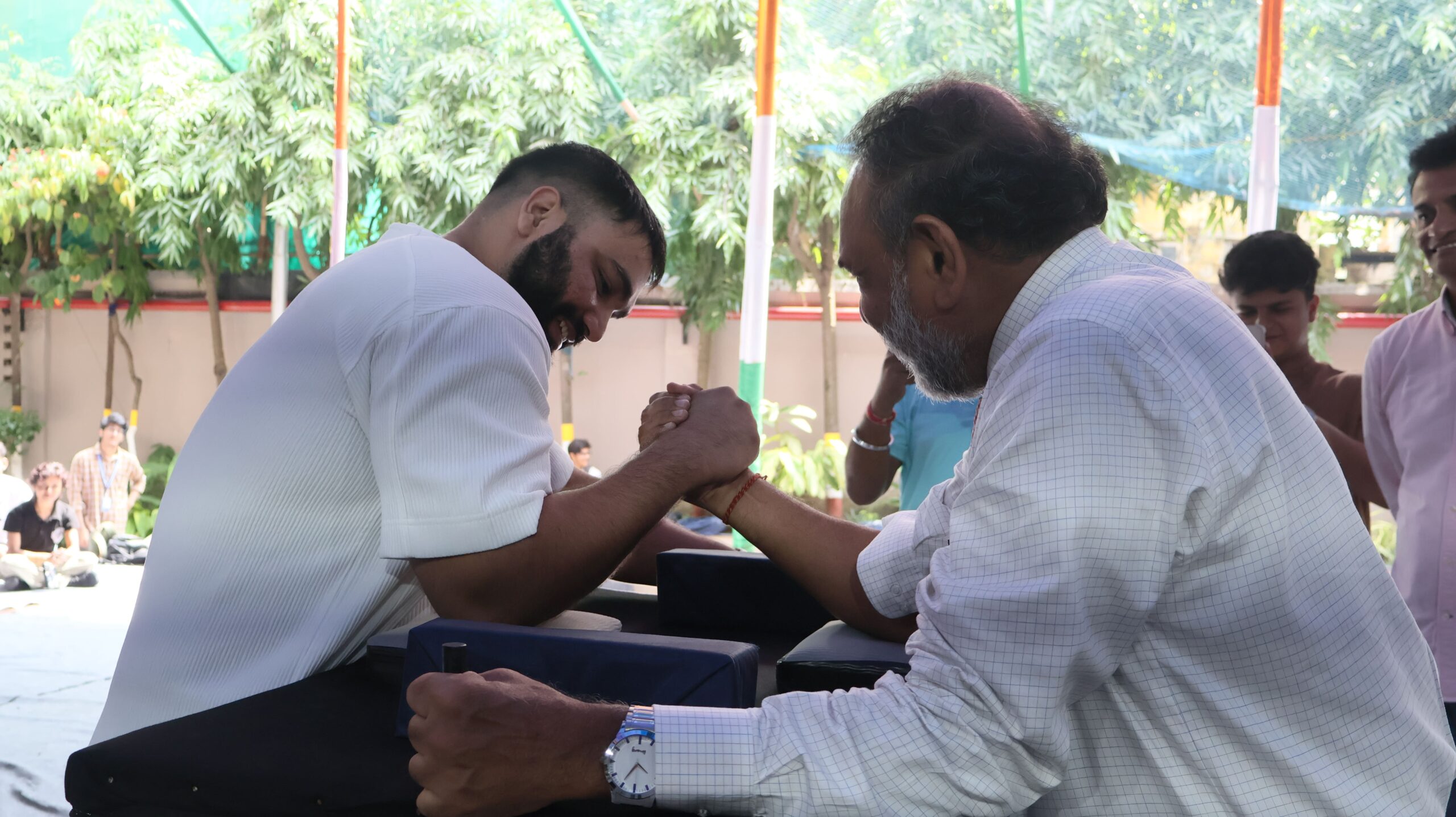 The tournament witnessed enthusiastic participation, with the turf filled with students eager to cheer for their favourites and watch who would finally claim the top spots. The event began with the Rector and Dean of Student Affairs, Prof. Dilip Shah, taking the stage and motivating the participants with his words. This was followed by a friendly arm-wrestling match between Prof. Shah and David Khan, in which Prof. Shah emerged victorious — much to the delight of the crowd.