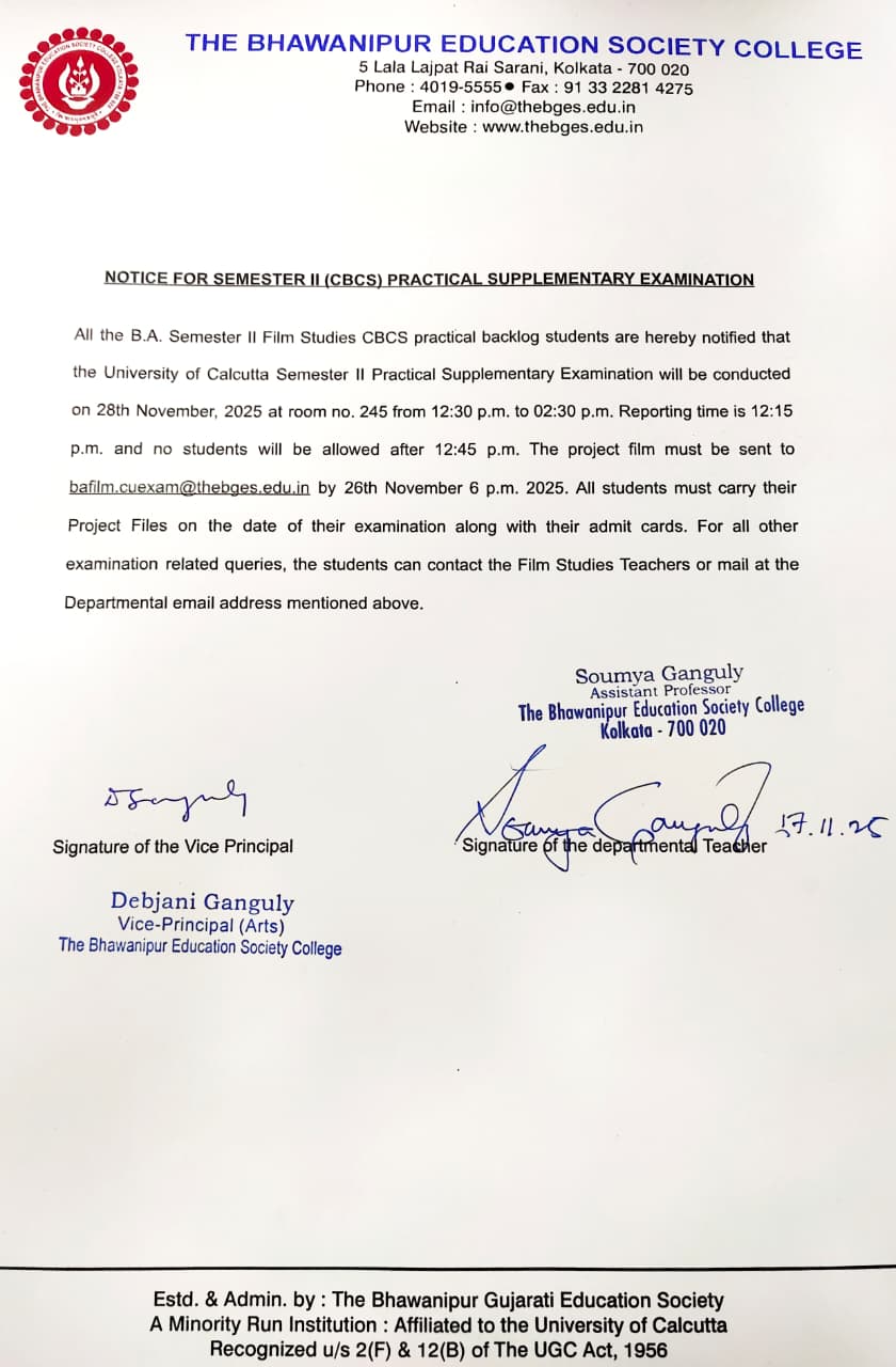 This is for the information of all concerned that as per the directive of the University of Calcutta, the Practical Exam 2025, of Semester II, (under CBCS sys.) for different subjects of B.A. courses will be conducted by the College. The schedule of the examinations are given below: