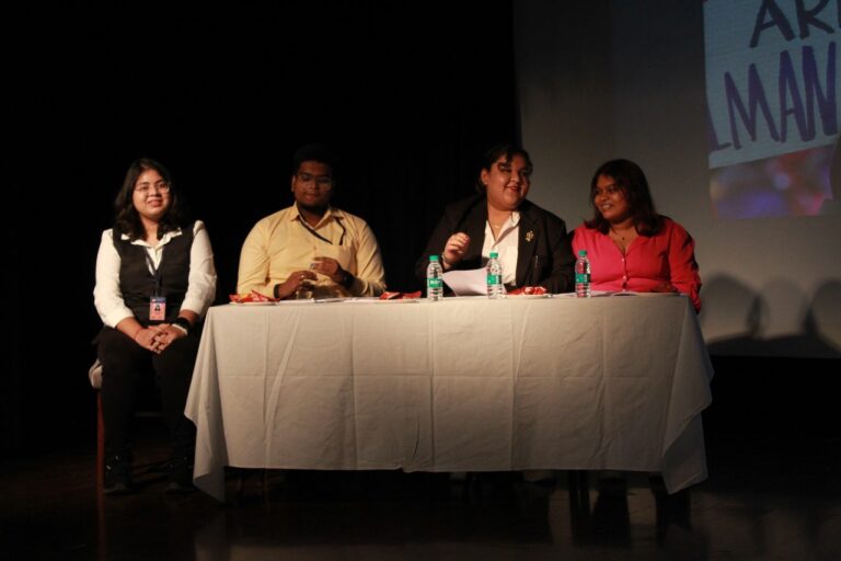 The second paper presentation began at around 12:30 P.M. on the theme “Impact of Culture on GenZ,” which had 4 participating teams. The event proceeded after the felicitation of the judge, Mrs Champa Srinivasan, by the students. The sub-topics which the participants chose to present their papers on were “Beyond the Sarees: From Ghunghat to Graduation”; “GenZ Unbound By Old Standards’’; “Understanding Generation Z: Cultural and Behavioural Trends”; and “Love’s Labour Lost: Gen Z’s Crusade to Normalise LGBTQIA+ in Indian Culture”. The thoughts presented in all three sub-topics were as per the theme and hence caught the attention of the audience towards the changing norms that are evolving with time. The Technical Session 2 that followed had a different theme of “Climate Change and Youth”. The session presented esteemed panel members such as Ms Shital Bavishi, Ms Etee Bajaj and Ms Arundhati Sen who the students felicitated. Ms Shital Bavishi is a lawyer by education and Life Insurance and Mutual Fund professional whose love for the environment made her shift to being a full-time environmentalist. By founding BEEJUM, she promotes practices like waste management, food cultivation and slow fashion. Being President of the West Bengal Organic Farming Council in the WICCI and co-founder of PARIVARTAN, she collaborates on green initiatives and promotes sustainable living through an exhibition event. Her commitment to advocacy shines through her actions and words earning her accolades like the Green Influencer of the Year 2021, Devi Award 2021, Rising Star Award 2022, Brand Queen Award 2023, MASA Woman Excellence Award 2024 and Women of Influence Award 2024. Panel member Ms Etee Bajaj has a background in CFA that allows her to blend her financial acumen with her commitment to sustainability. As the chair of the Climate Change vertical of YI-CII Kolkata, she spearheads various initiatives aimed at combating climate change and fostering environmental stewardship among youth such as leading tree plantation projects, mangrove plantation in the Sunderbans, rejuvenating ponds in rural and urban areas. She is a staunch advocate against plastic usage, a promoter of veganism and a proponent of waste management, segregation and climate change who inspires others to take meaningful steps towards a more sustainable future. The third speaker, Ms Arundhati Sen is currently a Chief Strategy and Partnership Officer at Garbage Free India and has over 20 years of leadership experience through her notable positions at Indian Express, ABP and CK Birla Hospitals. She specialises in driving business growth, brand strategy, integrated marketing and sustainable communication across diverse industries, including healthcare, hospitality, media and FMCG. Her achievements also include successful hospital launches and impactful marketing campaigns. The student moderator for Technical Session 2 was Aniket Dasgupta, a 2nd Year B.Com student and the representative of the Reporting vertical of the Expressions Collective. The major discussions of this session were the ways to reduce carbon footprints and how mass media is responsible for waste generation. One of the questions raised by the moderator was who is Generation Z responsible for safeguarding the environment to which the panellists advised the youth to shift to veganism because animal farming is a major cause of pollution, consume less content on the internet, save water by promoting bucket bath and maintain a zero waste lifestyle. They suggested that change begins from home, thus changing ourselves is the first step to changing the world which was an eye-opener for the listeners.