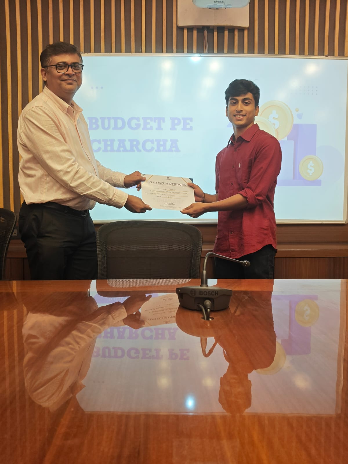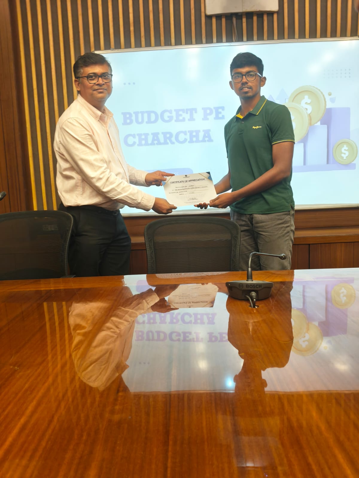 The second and final round of the seminar began when the top four participants, namely Varun Mahato, Indrashis Chatterjee, Swadhin Paul and Sourashis Mullick, were called in for a group discussion. All four participants were given four different topics, and they were allowed two minutes to prepare their pointers. The first topic was “What is your key takeaway from Budget 2025?” followed by the second topic “What impact will the received tax slab and increased rebate have on the economy?”. The third participant had to speak on the topic “Does this budget put politics over economics? Has BJP tried to create an election narrative for Delhi and Bihar elections with this budget to take to the people?” while the last topic for the day was “Which sectors according to you are the heroes of this year’s budget and why?”.