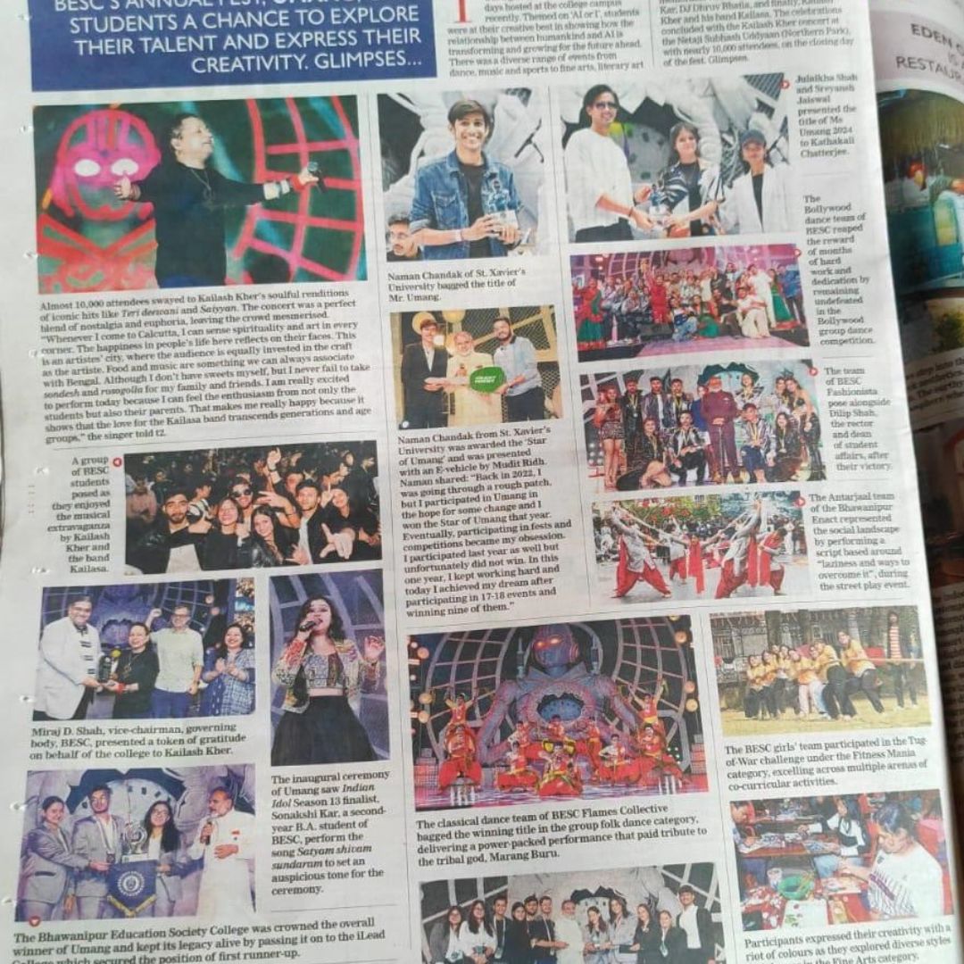 The Telegraph Edugraph featured Communiqué 2025 of The Bhawanipur Education Society College, highlighting its theme “The Alchemy of Manifestation” and celebrating outstanding student participation across literary and public-speaking events.