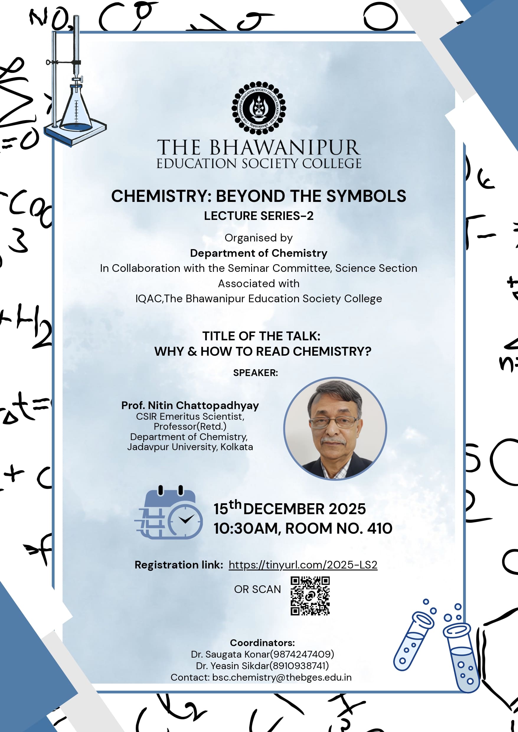 The Lecture Series–2, titled “Chemistry: Beyond the Symbols”, was organized by the Department of Chemistry, The Bhawanipur Education Society College, in collaboration with the Seminar Committee, Science Section, and associated with IQAC, The BES College. The lecture “Why & How to Read Chemistry?” was delivered by Prof. Nitin Chattopadhyay, CSIR Emeritus Scientist and former Professor of Chemistry, Jadavpur University, Kolkata.