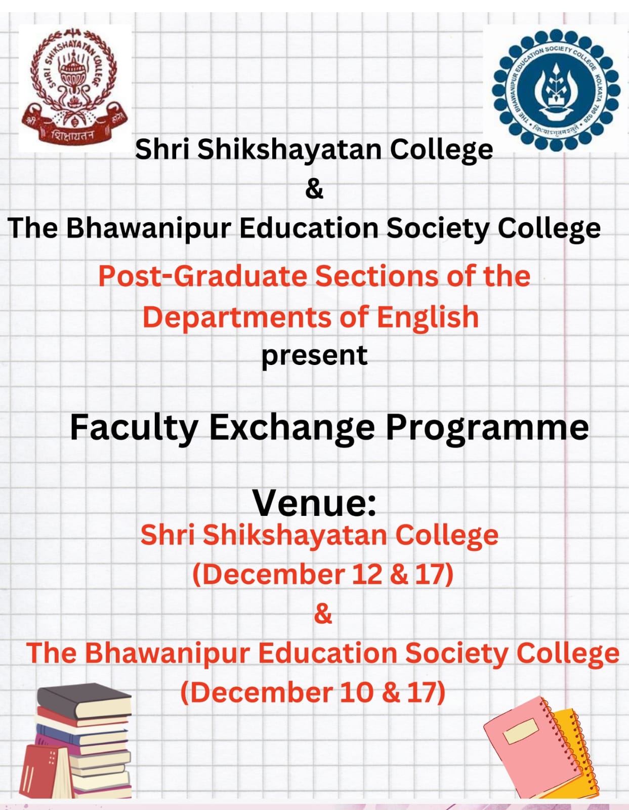 A Faculty Exchange Programme between The Bhawanipur Education Society College and Shri Shikshayatan College was successfully completed in December 2024. A MOU signed between the two PG English departments called for this activity. During their visits to Shri Shikshayatan College, Dr. Jashomati Ghose( 12th December 2024) and Dr. Souraja Tagore (17th December 2024) delivered special lectures to the PG English Semester 1 students. The Bhawanipur Education Society College hosted two special lectures by Professor Baidehi Mukherjee (10th Dec 2024) and Dr. Debnita Chakravarti (17th December 2024) for PG Semester 1 students. In the coming days, the departments look forward to more such collaborations.