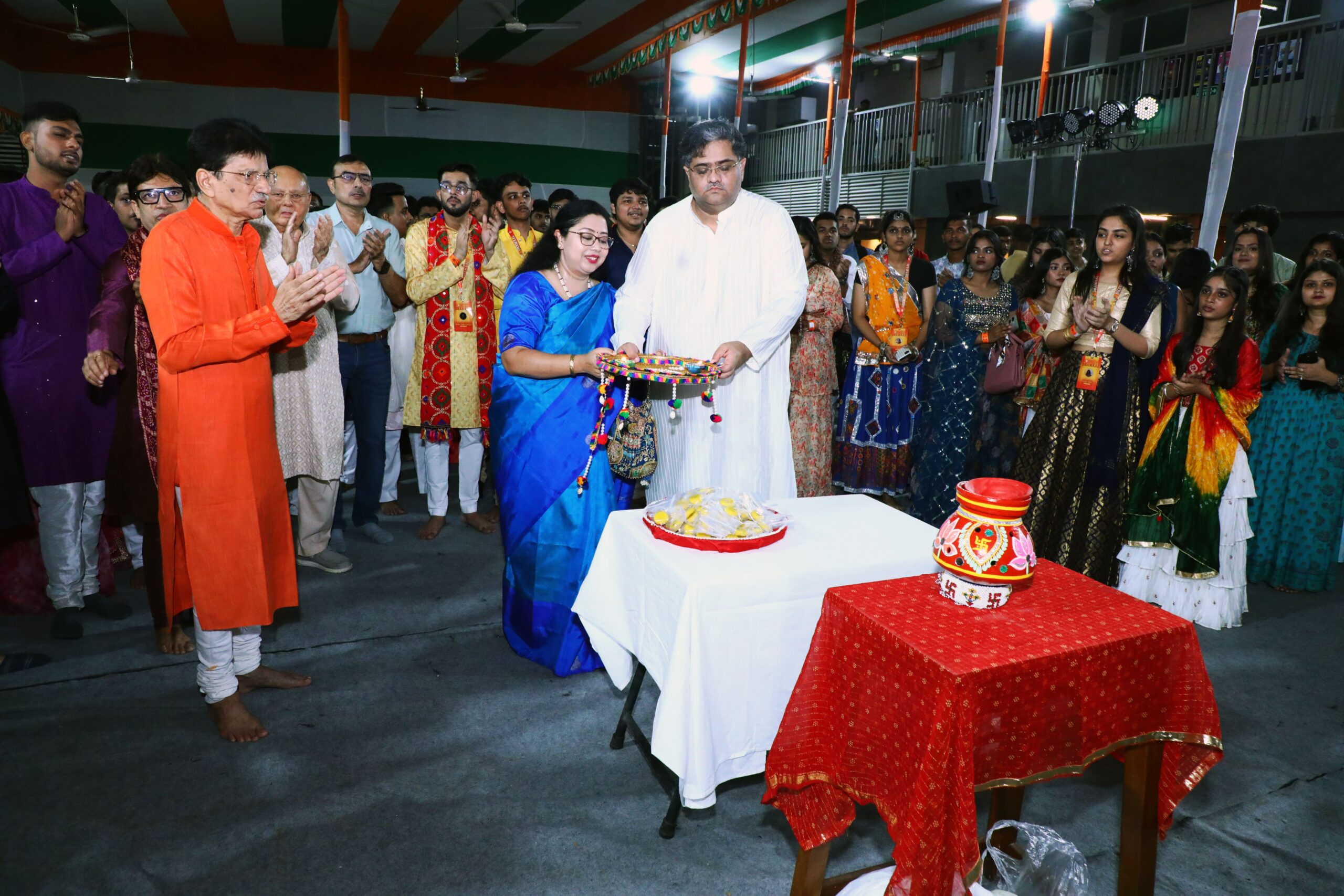 The celebrations then shifted to the pulsating beats of Garba and Dandiya Raas, with dancers dressed in dazzling traditional Gujarati attire. Their synchronized moves and infectious energy invited everyone present to join the circle of rhythm and joy. A special round was hosted for the college management, who were soon joined by students, turning the turf into a sea of swirling colors and uncontainable enthusiasm.