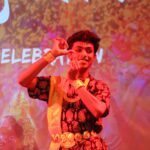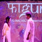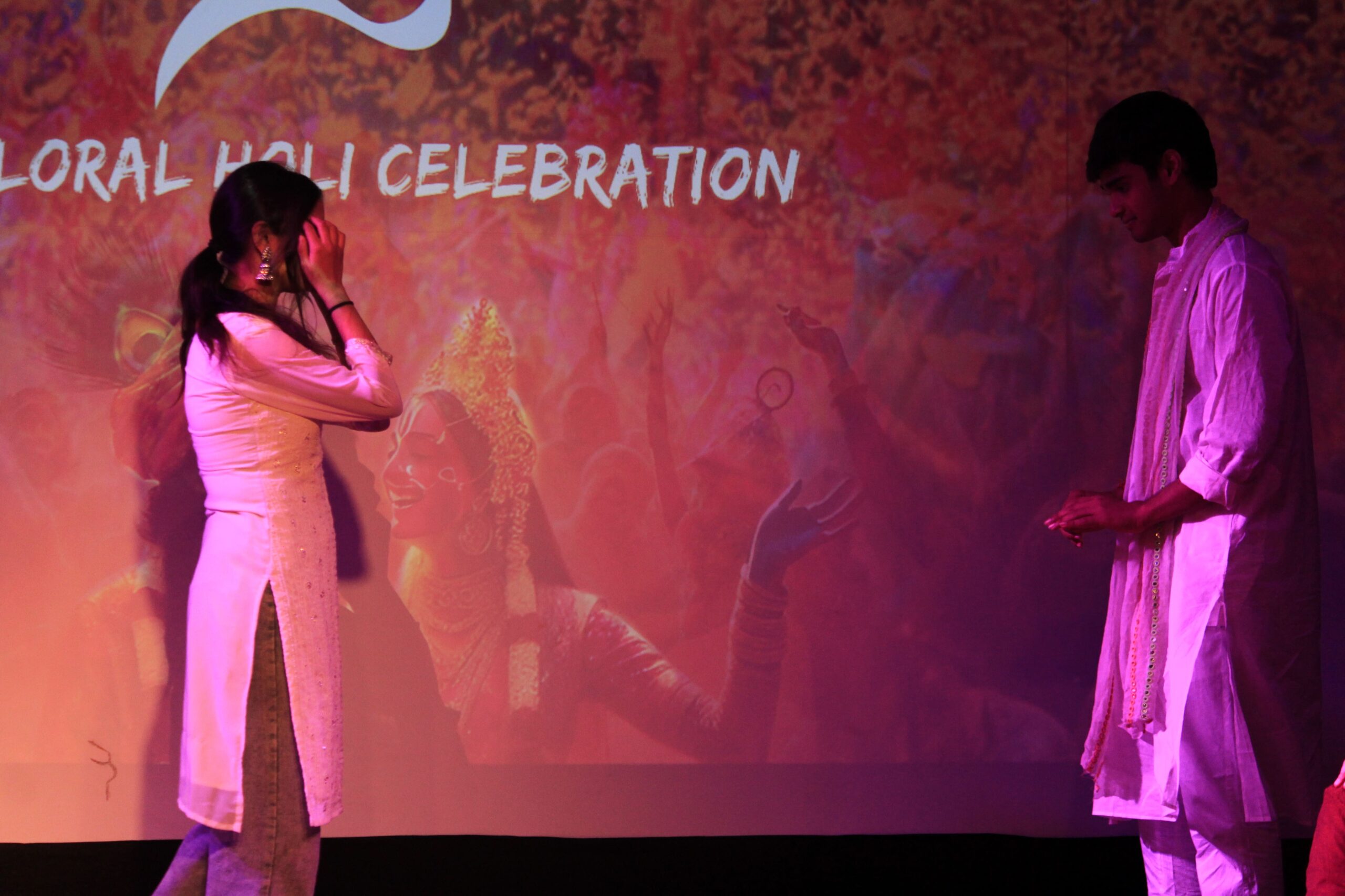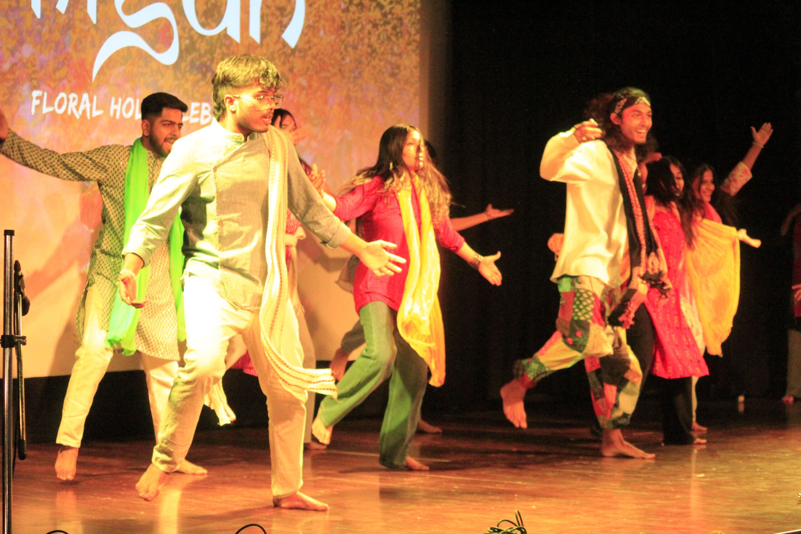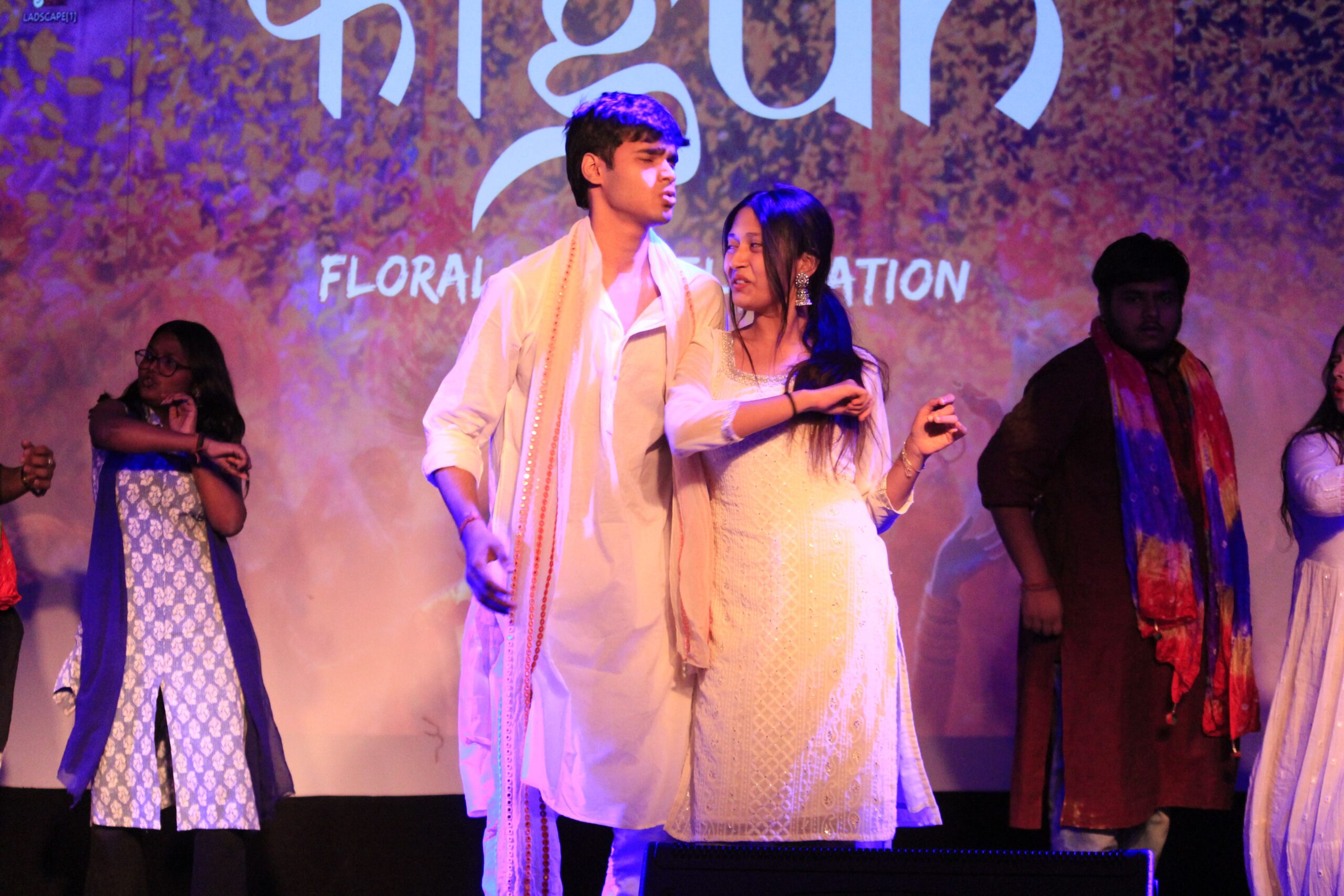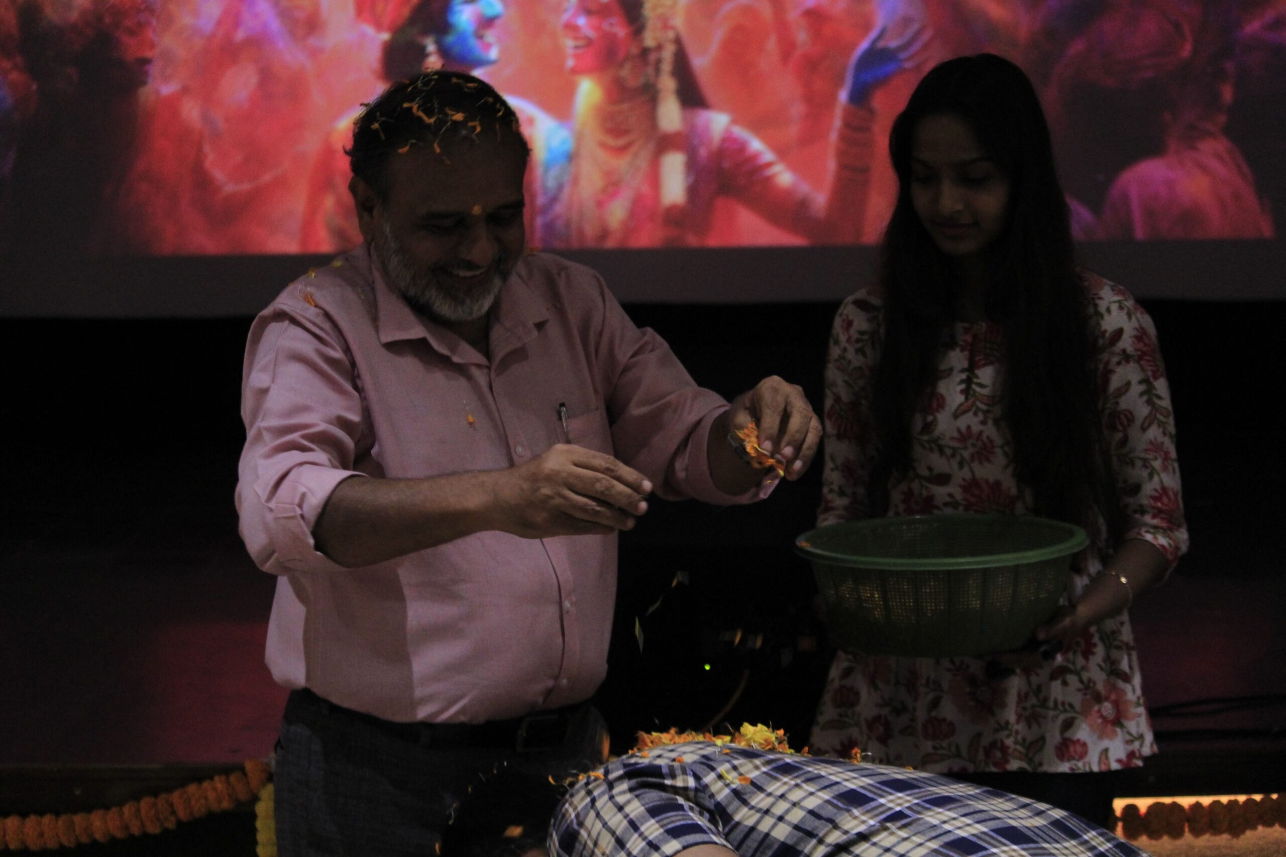 The event was kickstarted by members of the Crescendo Collective, who presented beautiful Hindi and Bengali renditions of songs capturing the essence of Holi encouraging the audience to sing along. Soon after, the Rector and Dean of Student Affairs, Prof. Dilip Shah, addressed the audience and acknowledged that the non-teaching staff are the institution’s backbone and unsung heroes without whom the college would not prosper or sustain itself. He took to the stage and invited non-teaching staff members in two rounds to felicitate them with a token of appreciation. The audience was further entertained by Aarohan, a team from the Enact Collective, who performed a playful skit that included lively dance performances to some of the most-loved Holi songs. The enthusiasm was infectious, as the audience couldn’t help but rise from their seats to join in and dance along. Adding another layer of fun, a retro Bollywood game had the audience guessing famous songs from just a tune, making them nostalgic for simpler times. Finally, the Western and Eastern teams of the Flames Collective concluded the event with spectacular dance performances that brought the spirit of Holi to life. Towards the end, student volunteers and guests came together to play “Phoolon Ki Holi”, joyfully tossing flower petals in the air and dancing tirelessly.