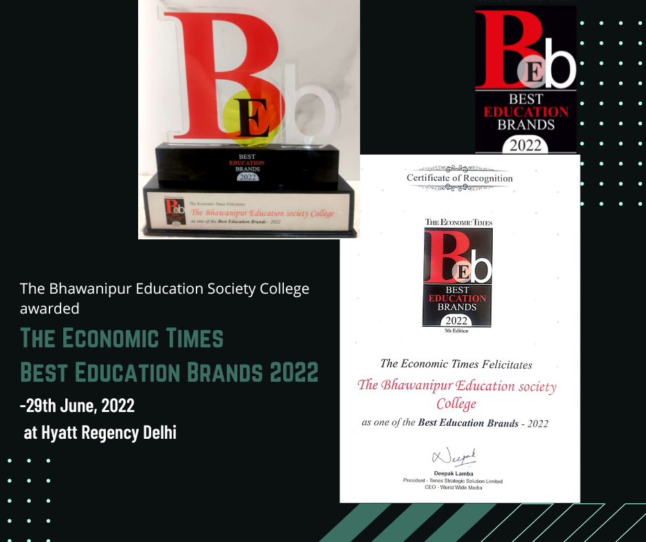 The Bhawanipur Education Society College has been honoured with the prestigious ‘Best Education Brand-2024’ award for the 5th consecutive year by The Economic Times and ET Edge part of the Times of India group at an award function held in Mumbai on 21st March 2024.