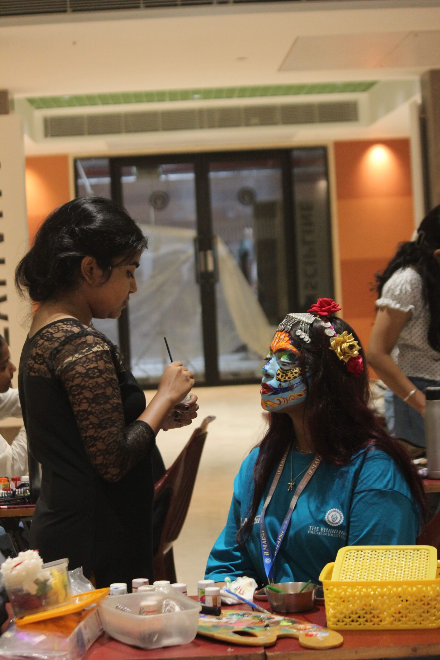 FACE PAINTING: This event took place in Valia Hall from 1:00 P.M. and was judged by Mili Mandal, who was felicitated by Dr. Vasundhara Mishra. Eight teams participated. Within 1 hour and 30 minutes, artists painted the faces of their models with boho-themed looks. Each team then explained their artwork.