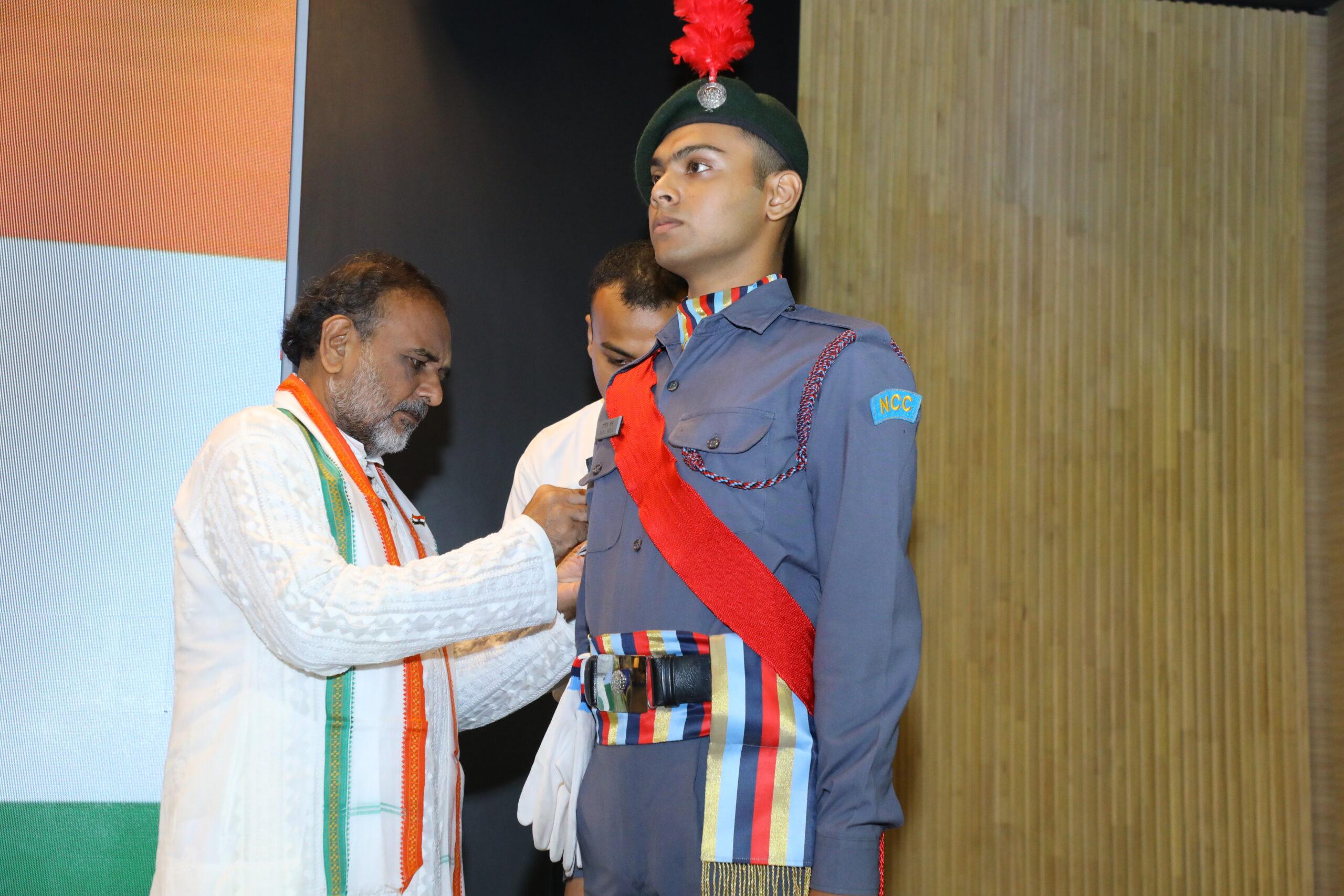 At the conclusion of this Grand Celebration, we witness Dean Professor Dilip Shah, Commander Vishnu Sharma, Subedar Bhawani Risal, Sergeant Bharat Bon Pun, and Mr. Aditya Raj congratulating the NCC Air wing students for their excellence and dedication at their Rank ceremony.