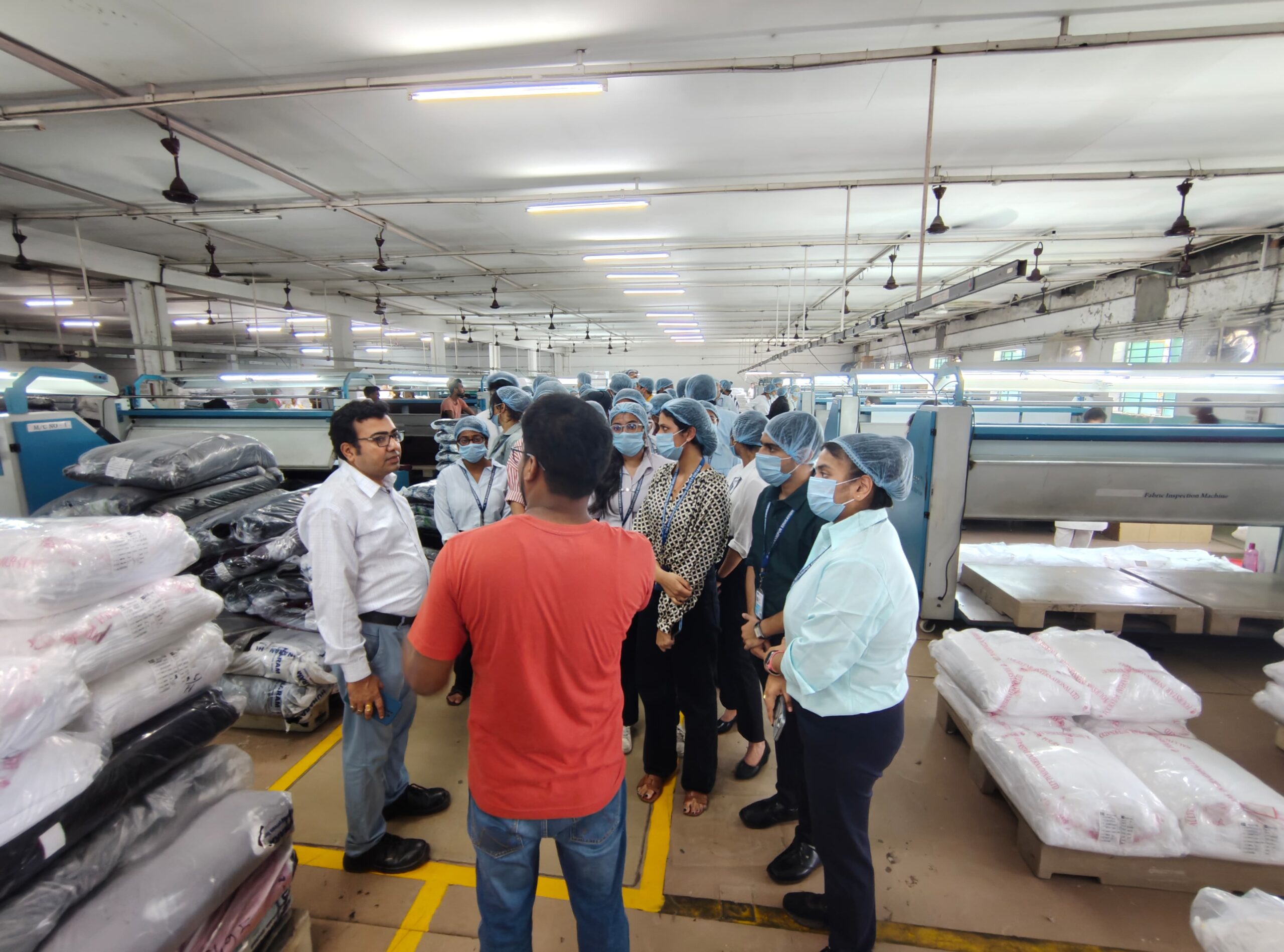 Students observed automation and manual operations in real-time, along with key quality assurance measures such as GSM testing, colorfastness evaluation, and shrinkage checks. Special emphasis was given to their women-centric workforce model, cost optimization strategies, and rebranding approach. The visit highlighted how manufacturing integrates HR, branding, and supply chain management.