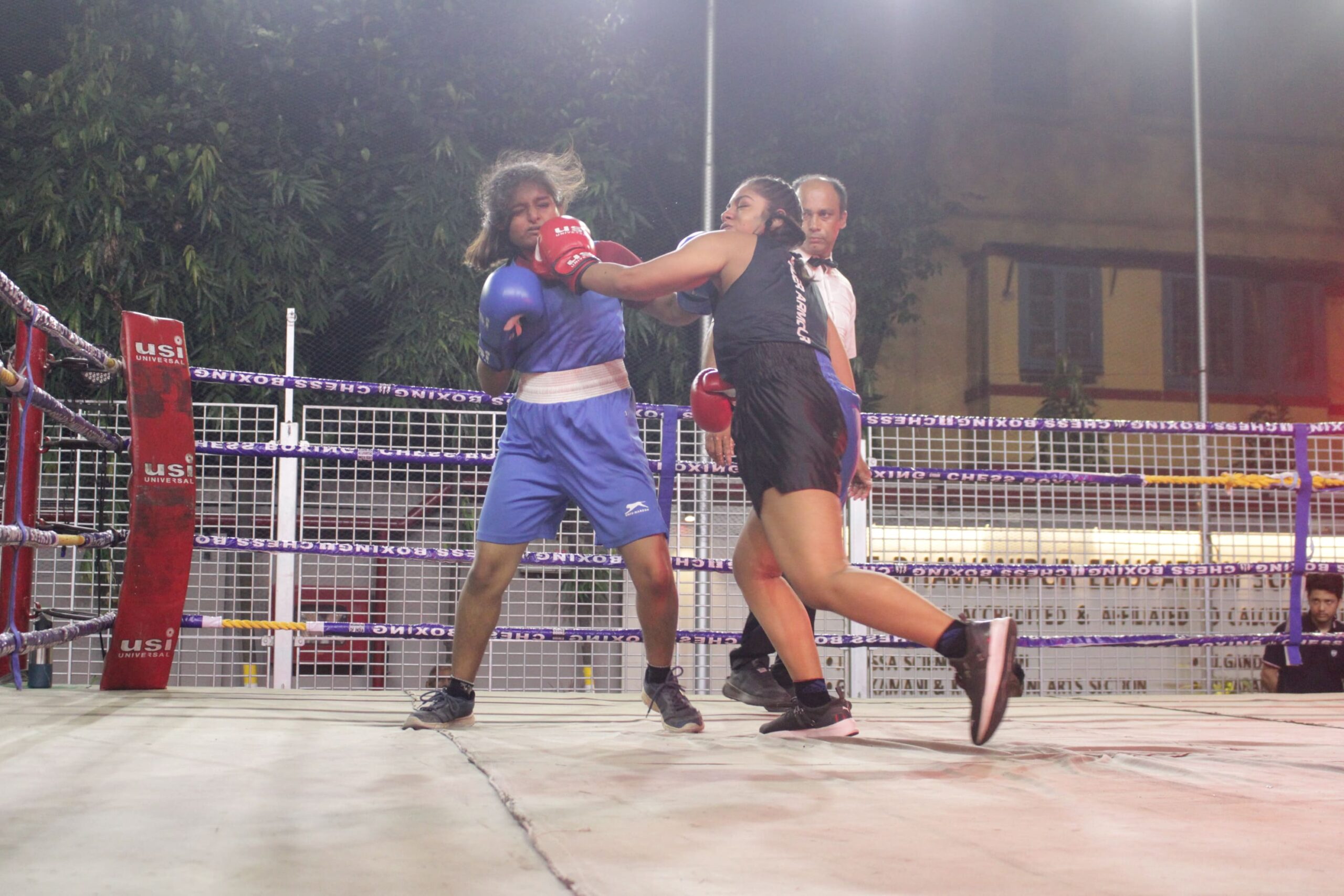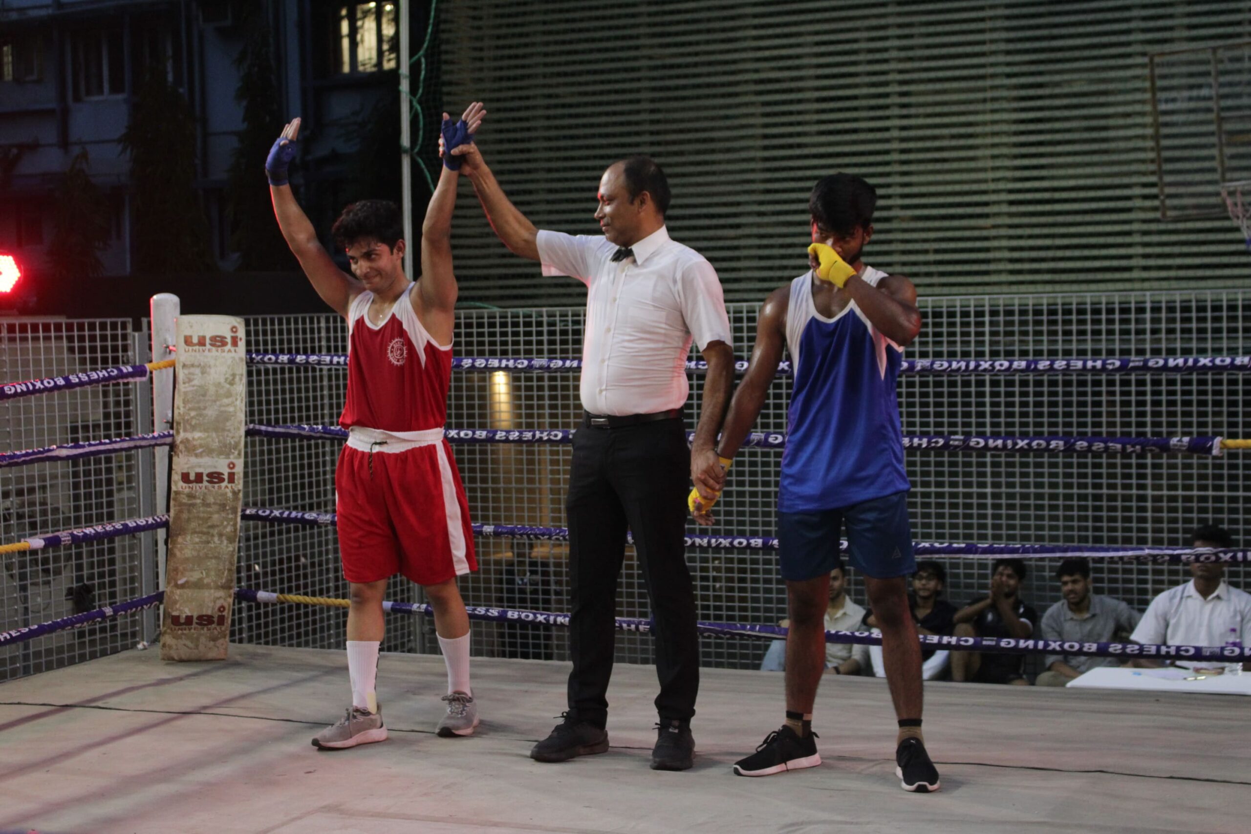 The event commenced on the 25th at 4:00 P.M. under the guidance of Coach Mr. Ashutosh Kumar Jha. With a short introductory speech from the coach, the Centre Juror, Mr. Montu Das, was introduced along with the referees for the event, which also included a world champion, Mr. Kingshuk Saha. The mic was then handed over to the judge, who motivated and boosted the spirit of the participants, encouraging more students to join the sport as it was not just about competition but also for general fitness. After the brief introductions; the Rector and Dean of Student Affairs, Prof. Dilip Shah joined Prof. Minakshi Chaturvedi and Coach Ashutosh Kumar Jha to inaugurate the ring, which was followed by a short inaugural boxing match between Dean, Prof. Shah and the Center Juror, Mr. Montu Das.