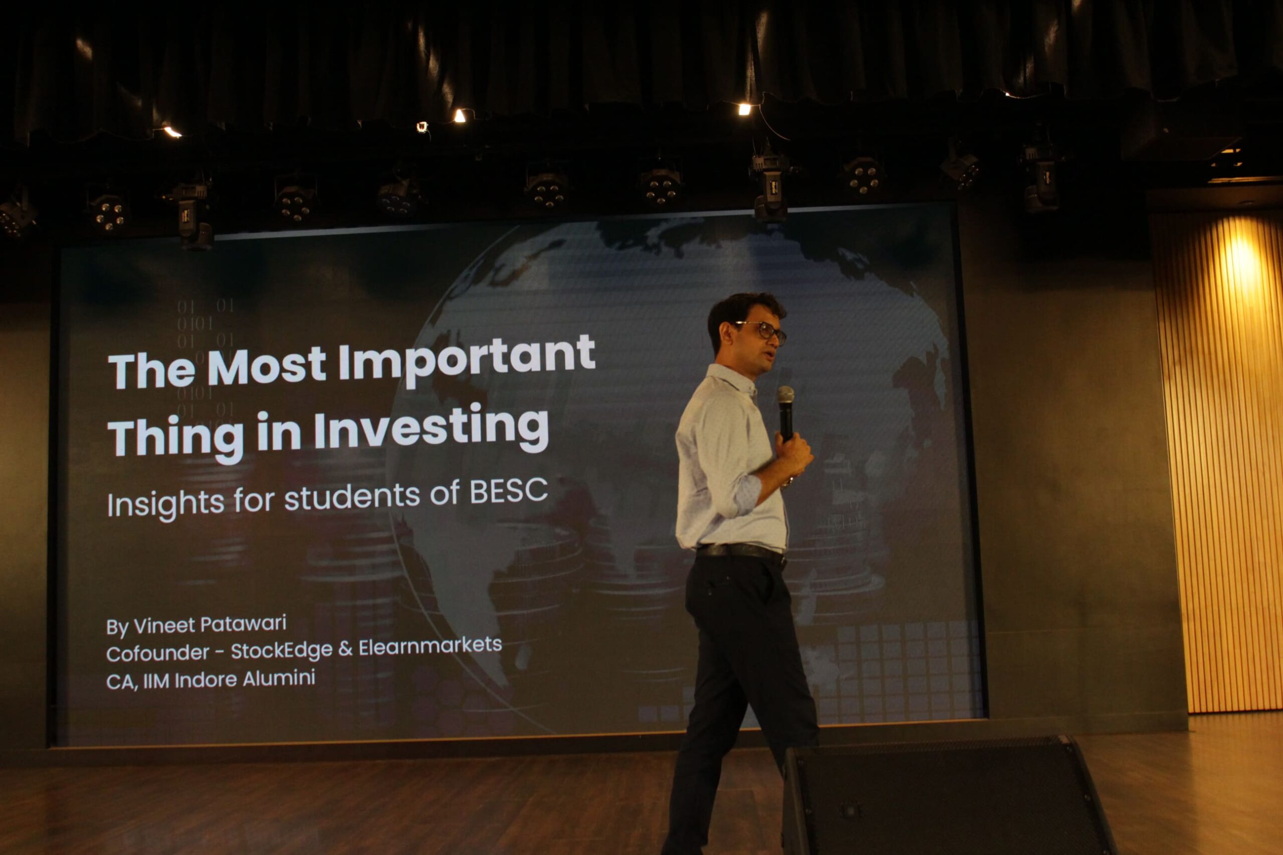 BESC College Representative of Leverage 2025 and the Representative of Bull’s Eye Collective, Rishi Agarwal, went up on stage to share a few words with the spectators. In his words, “We as traders wake up every morning at 9:00 A.M., and exactly at 9:15 A.M., we sit back at our computer screens. When the world craves those extra minutes of rest, we crave those extra pennies of wealth in our pockets.” With that, Leverage 2025 was officially declared open.