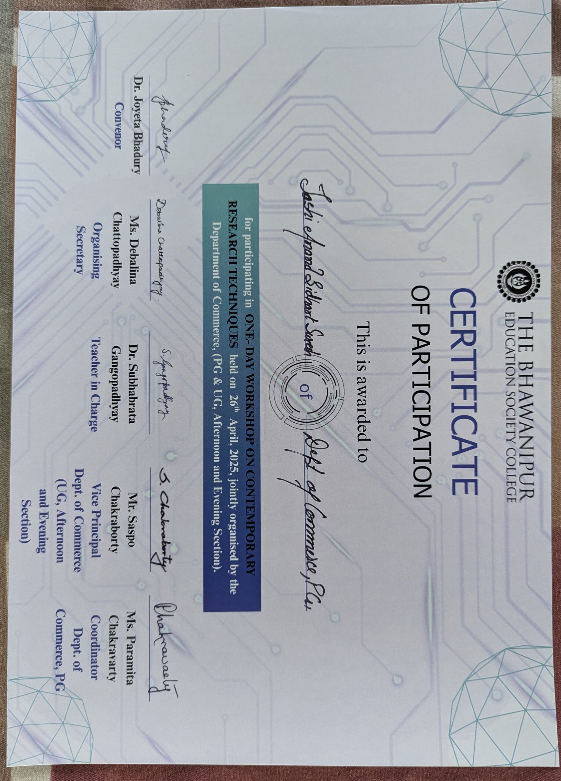 Name of the Activity: One-Day Workshop on Contemporary Research Techniques Jointly organised by Department of Commerce PG & UG (Afternoon & Evening Section) The Bhawanipur Education Society College