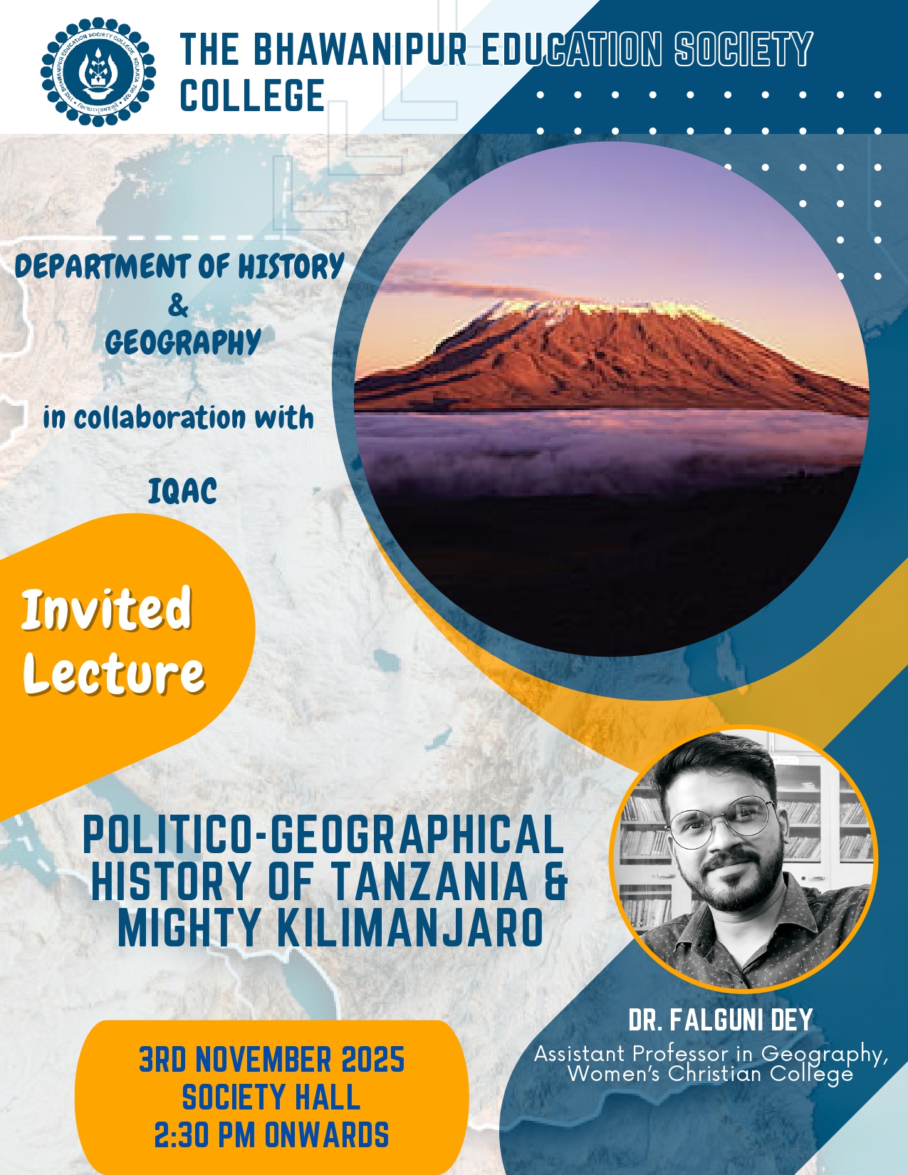 Brief description of the event: The Department of History and Geography in collaboration with IQAC, The Bhawanipur Education Society College, organised an invited lecture on the theme “Politico–Geographical History of Tanzania and Mighty Kilimanjaro.” The resource person for the event was Falguni Dey, Assistant Professor, Department of Geography, Women’s Christian College. Dr. Falguni Dey initiated his talk by presenting the geographical framework of Tanzania, emphasizing its diverse topography, strategic location in East Africa, and the significance of its borders shaped by colonial interventions. He elaborated on the historical evolution of Tanzania’s political geography, tracing its journey from pre-colonial tribal states through the period of German and British colonial rule, to the post-independence formation of the United Republic of Tanzania under the leadership of Julius Nyerere. He shared his experience of climbing the Mt. Kilimanjaro, and illustrated how Kilimanjaro holds geographical, cultural, and economic importance—serving as a hub for eco-tourism, environmental conservation, and national pride.
