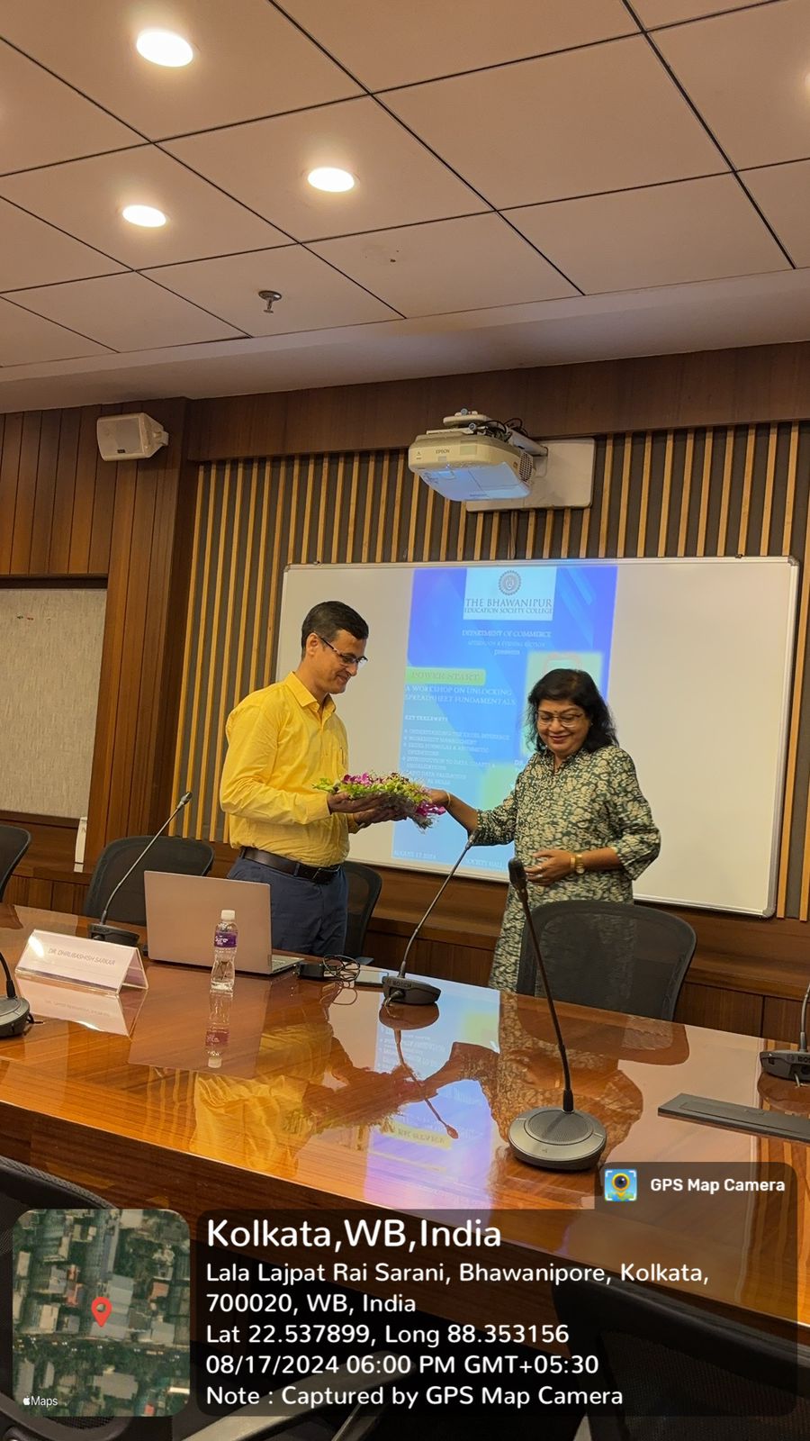 The workshop began with a warm welcome address from Ms. Arundhati Dinesh Mundhra, setting an energetic tone for the session to follow. Prof. Debdutta Sen Faculty of the Department of Commerce (Afternoon & Evening Section) delivered the opening address. Ms. Arundhati Mazumder then introduced Dr. Dhrubashish Sarkar, Principal of the Supreme Institute of Management, Hooghly, emphasizing his extensive expertise in research, teaching, and training. The event reached a notable highlight when Dr. Sarkar was honored by Prof. Atreyee Ganguly, Associate Professor of the Department of Commerce (Afternoon and Evening Section), marking a significant moment of recognition.