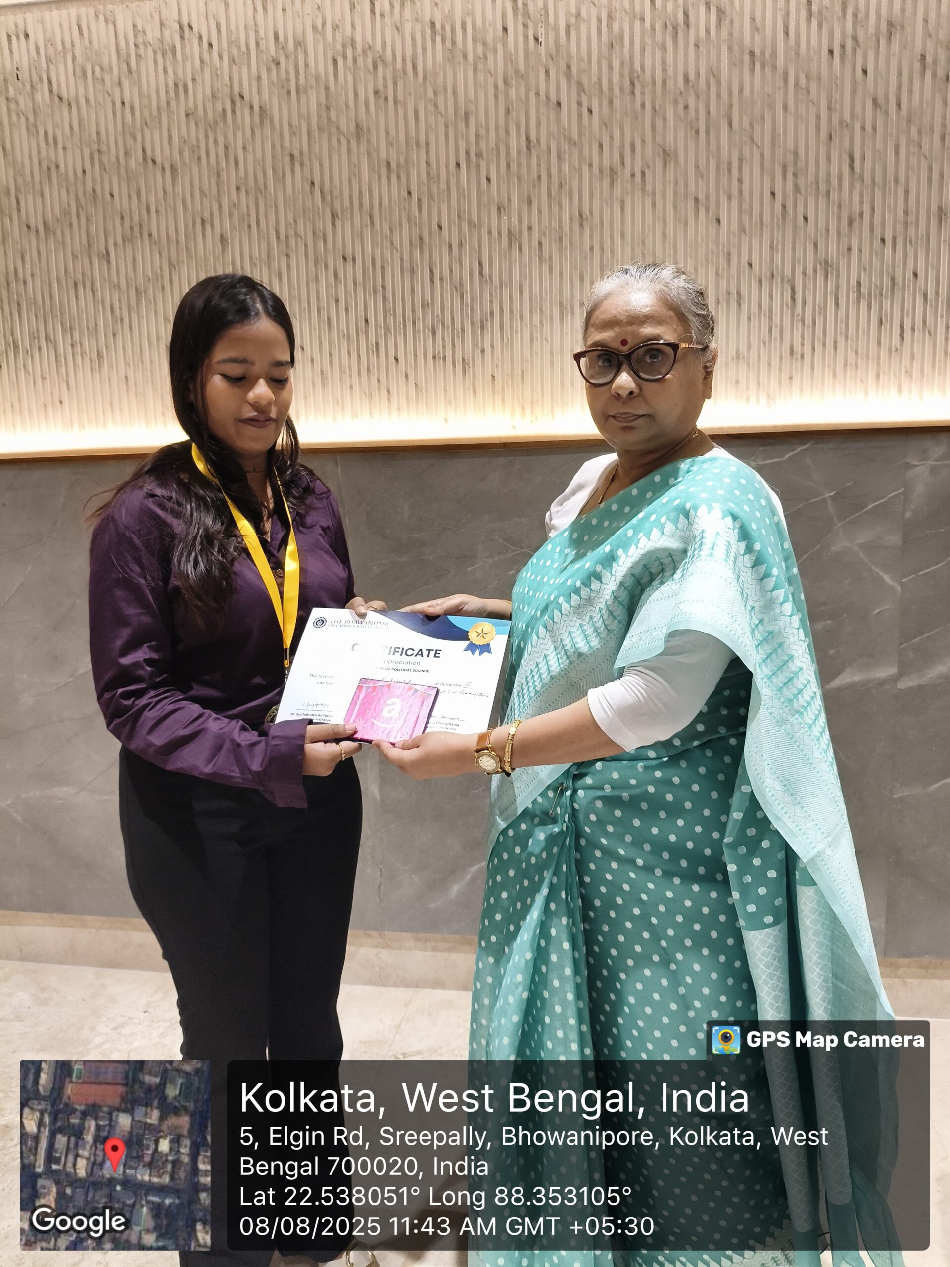 The prize for second highest SGPA in Semester III University of Calcutta Examinations was given to Manashi Agarwal