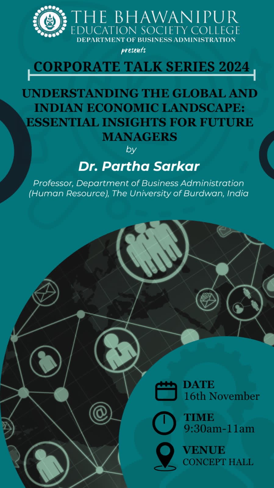 The Department of Business Administration at Bhawanipur Education Society College organized a Corporate Talk Series on 16th November 2024. The session featured Dr. Partha Sarkar, a distinguished professor from the University of Burdwan, who brought over 20 years of experience in teaching and research. Dr. Sarkar delivered an insightful session on the topic *”Global and Indian Economic Landscape: An Essential Perspective for Future Managers.”*