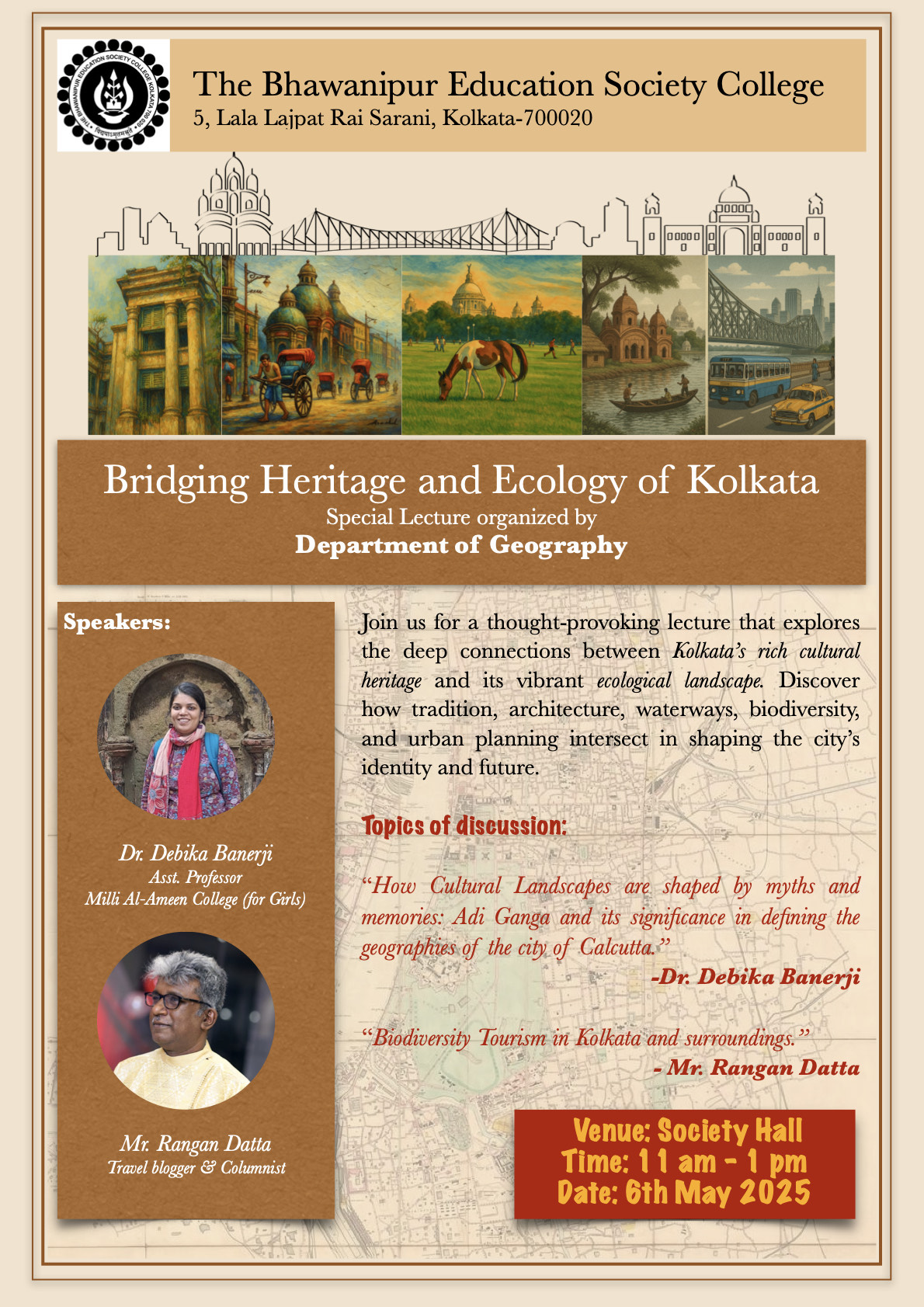 The Department of Geography of The Bhawanipur Education Society College organized a special lecture on the theme “Bridging Heritage and Ecology of Kolkata” on 06.05.2025 from 11 am – 1 pm at the Society Hall. The objective of the lecture was to delve into the interconnectedness between Kolkata’s historical heritage and its ecological framework, promoting a holistic understanding of urban sustainability in the context of one of India’s oldest metropolitan cities.