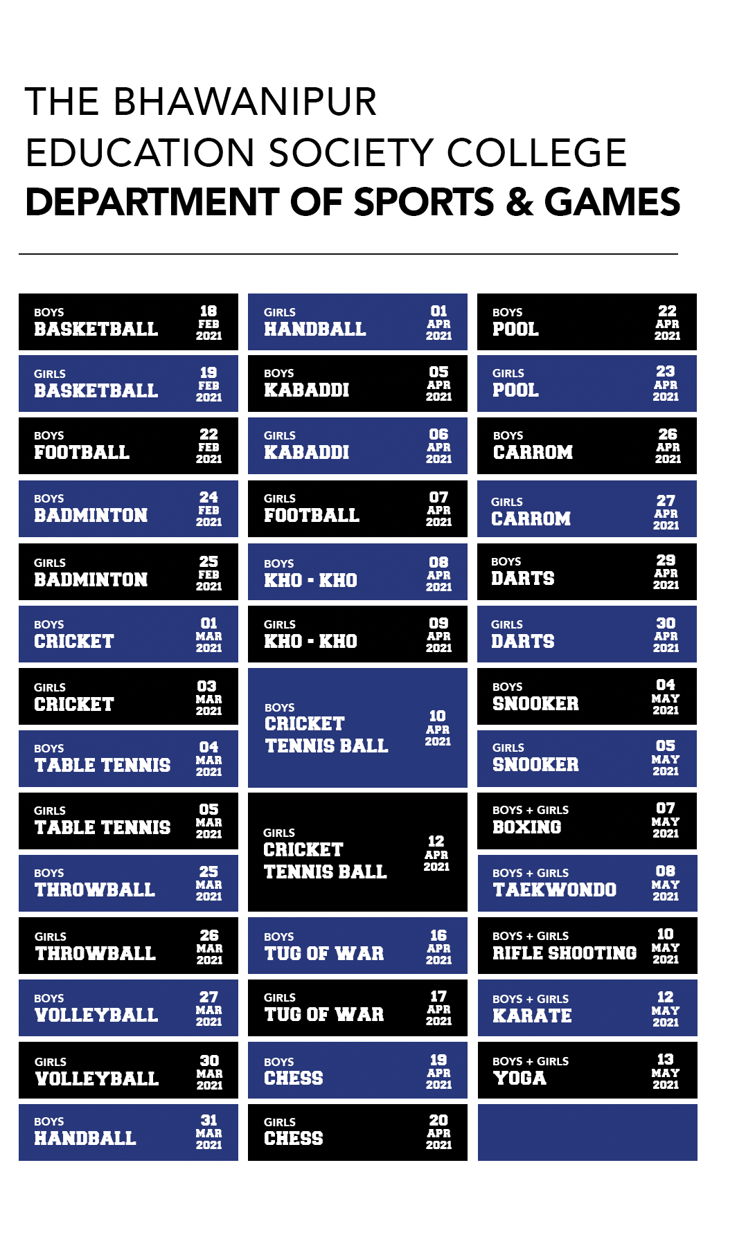 The competition date for any of the above mentioned intra college (boys & girls) games may be changed, if necessary, under unavoidable circumstances.