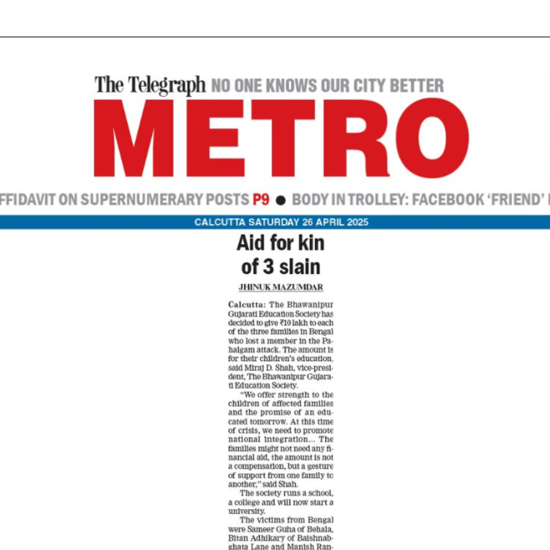 The Telegraph Metro In Solidarity and Support, The Bhawanipur Gujarati Education Society pledged ₹10 lakh each to three bereaved families from Bengal impacted by the Pahalgam tragedy – a heartfelt gesture to support their children’s education and future.