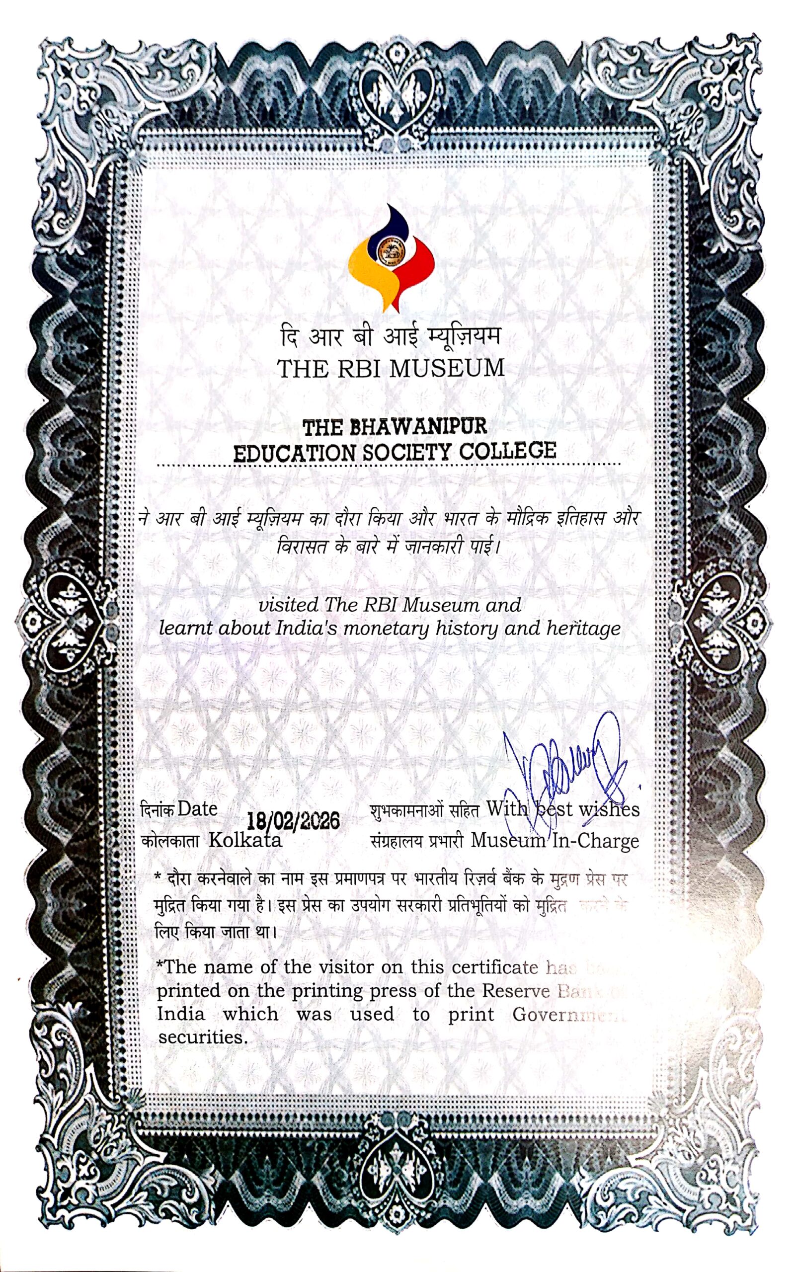 Among various displays at the two storied museum, the gold reserves section was particularly fascinating. A visitor to the museum can actually experience the weight of a standard 12.5 kg gold bar – as they get to raise a replica gold bar with one hand. The group learned that Indian households collectively hold tens of thousands of tonnes of gold, while the RBI holds over 800 tonnes as part of its official reserves. The visit seamlessly connected theory with practice, deepening the groups’ understanding of monetary economics in a dynamic and engaging manner. At the end of the visit, the museum authorities printed a certificate that mentions that students from The Bhawanipur Education Society College visited the museum on 18th February 2026. The certificate was printed on the central bank’s bond printing machine.
