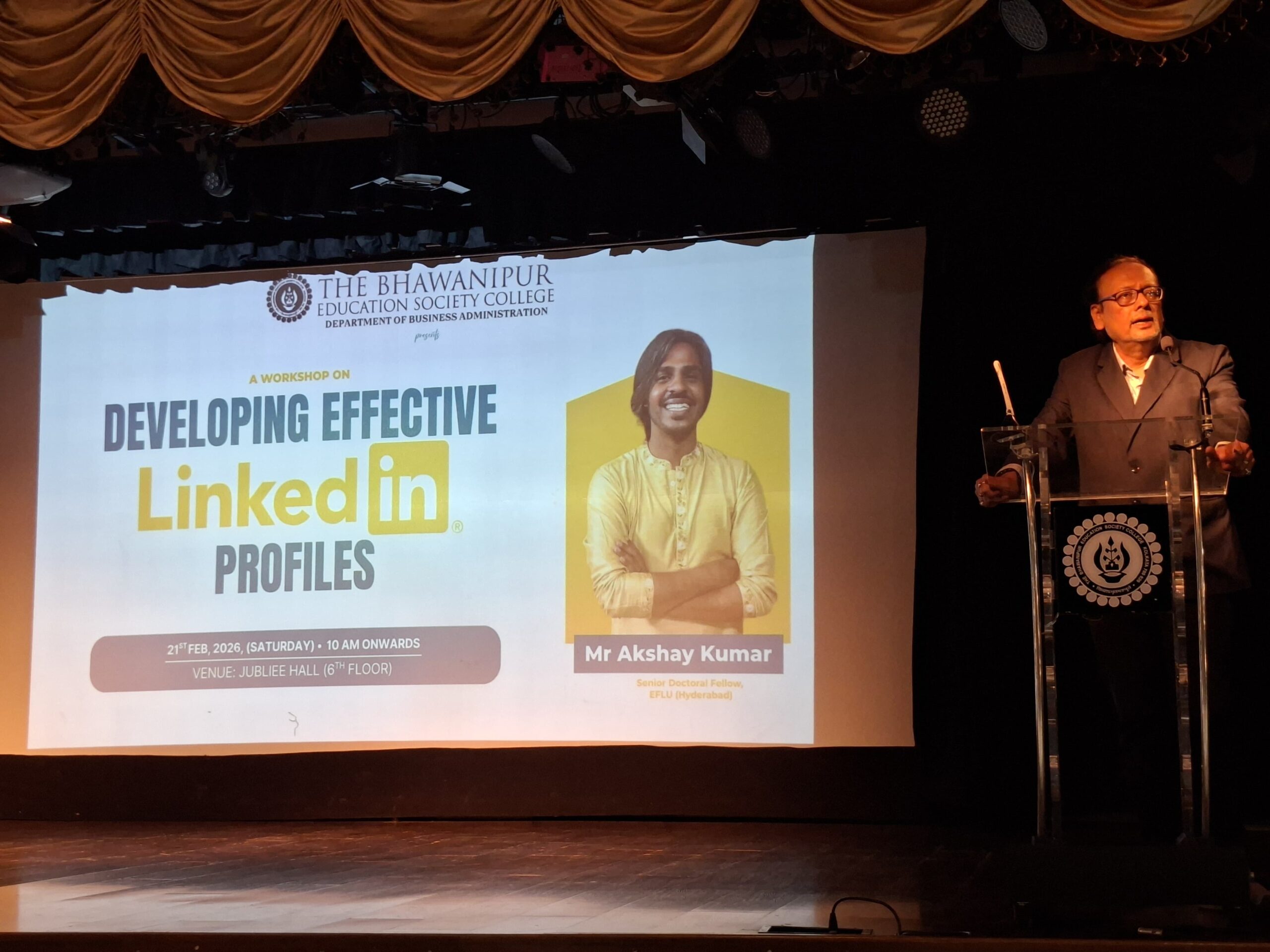 The Department of Business Administration at The Bhawanipur Education Society College, Kolkata, successfully organised a Workshop entitled, “Developing Effective LinkedIn Profiles” on 21st February, 2026 from 10:30 AM in the Jubilee Hall. The event attracted over 200 participants, with students from all the semesters.