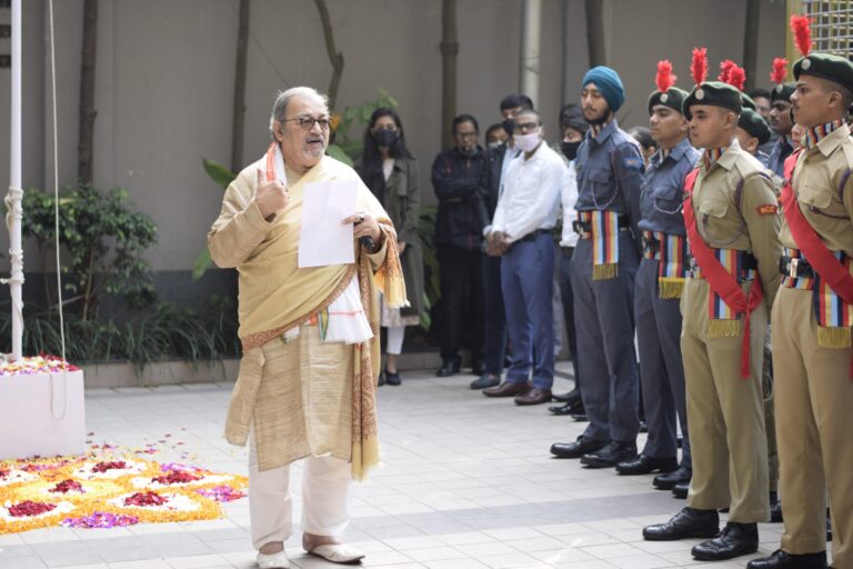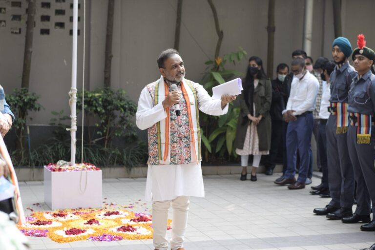 Dr. Subhabrata Ganguly then addressed the crowd with his speech on the importance of Republic Day.  Followed by Director General, Dr. Suman K. Mukerjee, inspiring speech on the hardships and struggles of the freedom fighters of the country and the importance of the preamble. Prof Dilip Shah, Dean of Student Affairs, then continued the event with the reading out the preamble and a pledged to abide by it.