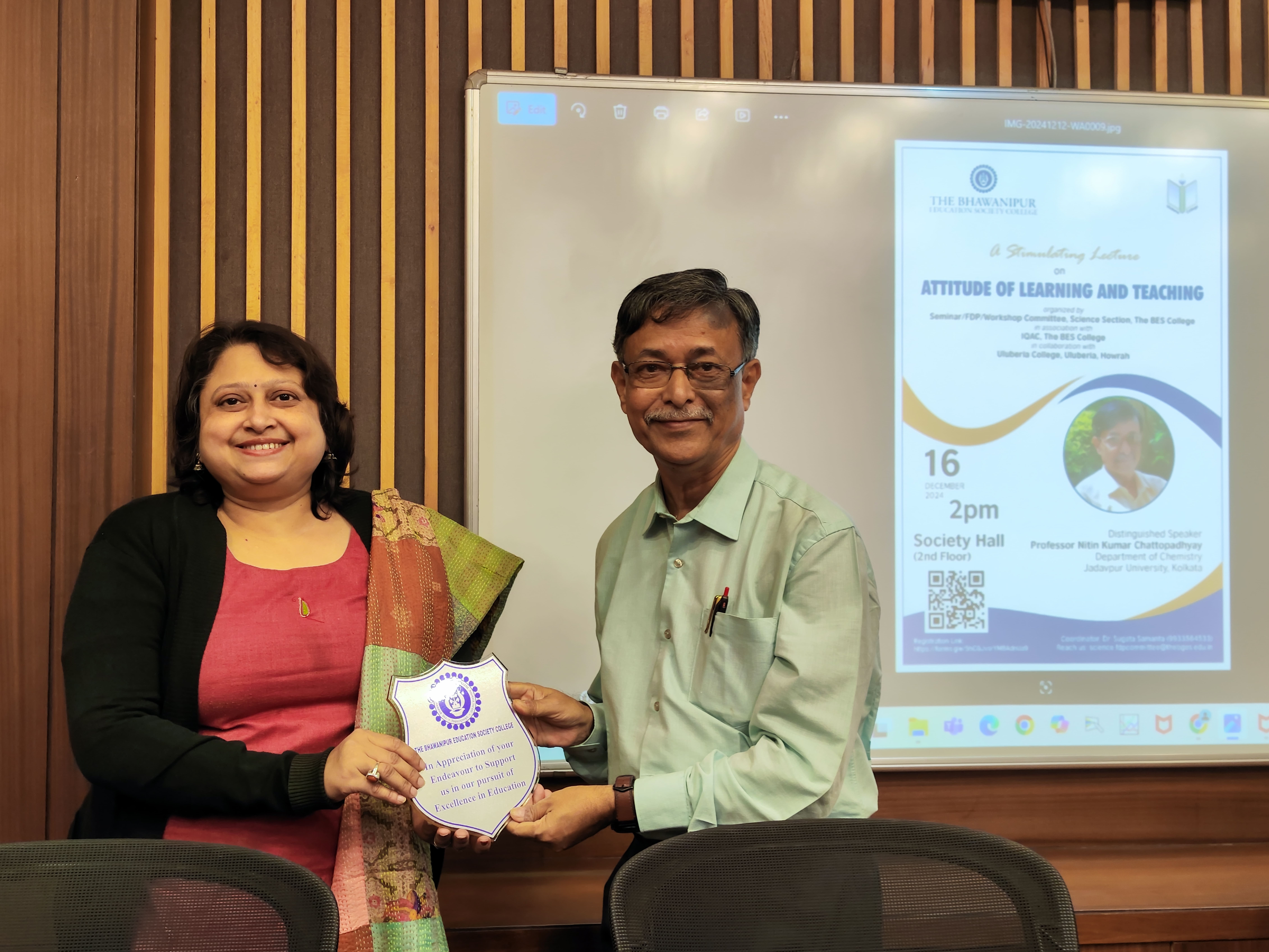 Seminar/FDP/Workshop Committee, Science Section, The BES College organized a stimulating lecture session by Professor Nitin Chattopadhyay, Department of Chemistry, Jadavpur University, Kolkata on 16.12.2024 at the Society Hall, The Bhawanipur Education Society College in association with IQAC, The BES College in collaboration with Uluberia College, Uluberia, Howrah. Total 65 participants from the Science Section of our college as well as from the Uluberia College participated in this two-hour lecture session. The session was hosted by Dr. Sugata Samanta of the Department of Chemistry and Ms. Anamika Guha of the Department of Computer Science, The BES College. In the inaugural session a welcome address was given by Dr. Subhabrata Ganguly, Teacher in Charge, The BES College.