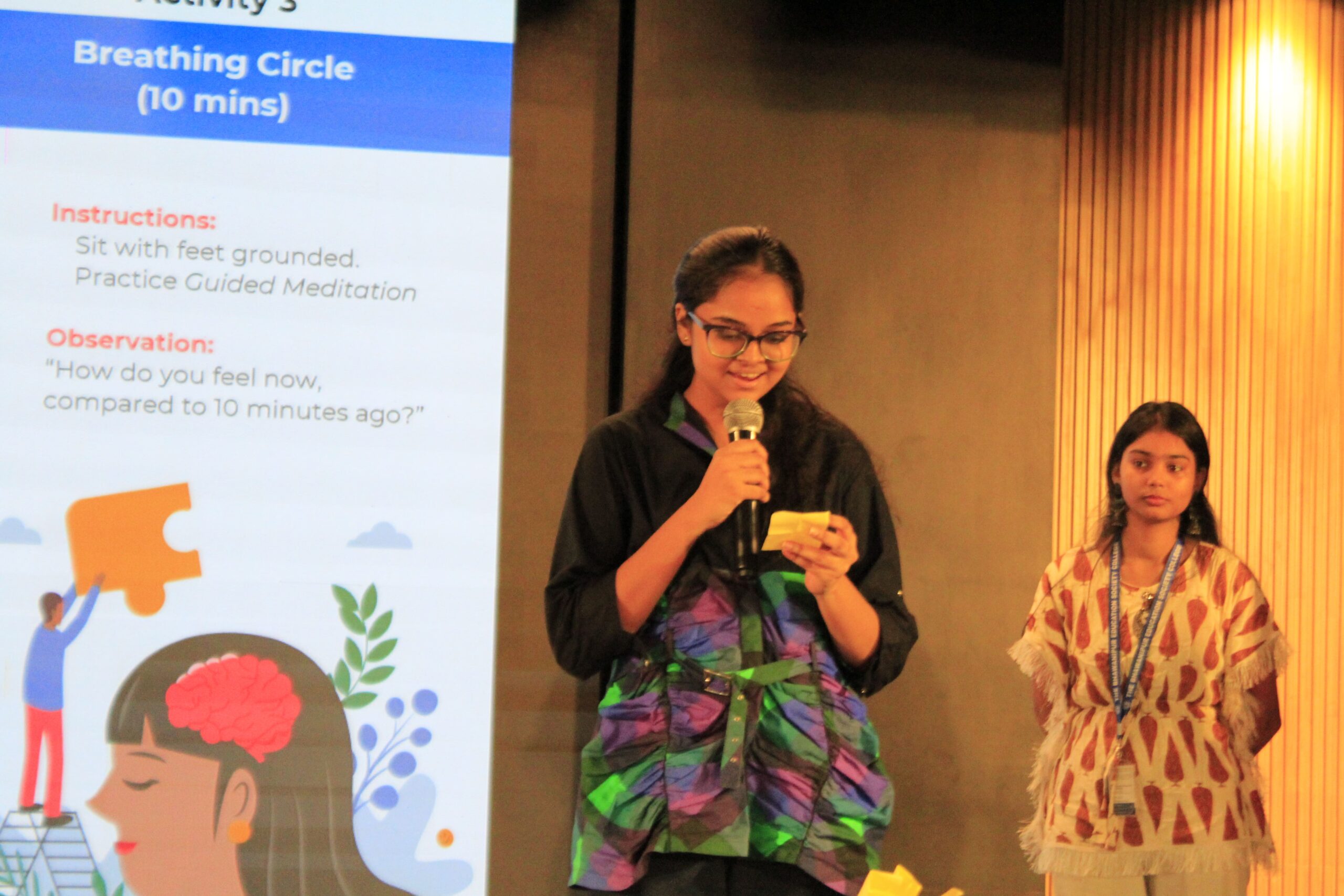 Distinguished members of Atmadhruti were also present. As a life-planning organisation, they are committed to helping people achieve balance across their personal and professional lives. After the speech, the keynote speaker, Mr. Anindo Ghosh, began interacting with the students. He engaged them in an activity involving anonymous messages about fear, written on unnamed chits. This was followed by a guided meditation, where everyone closed their eyes and allowed their thoughts to flow freely.