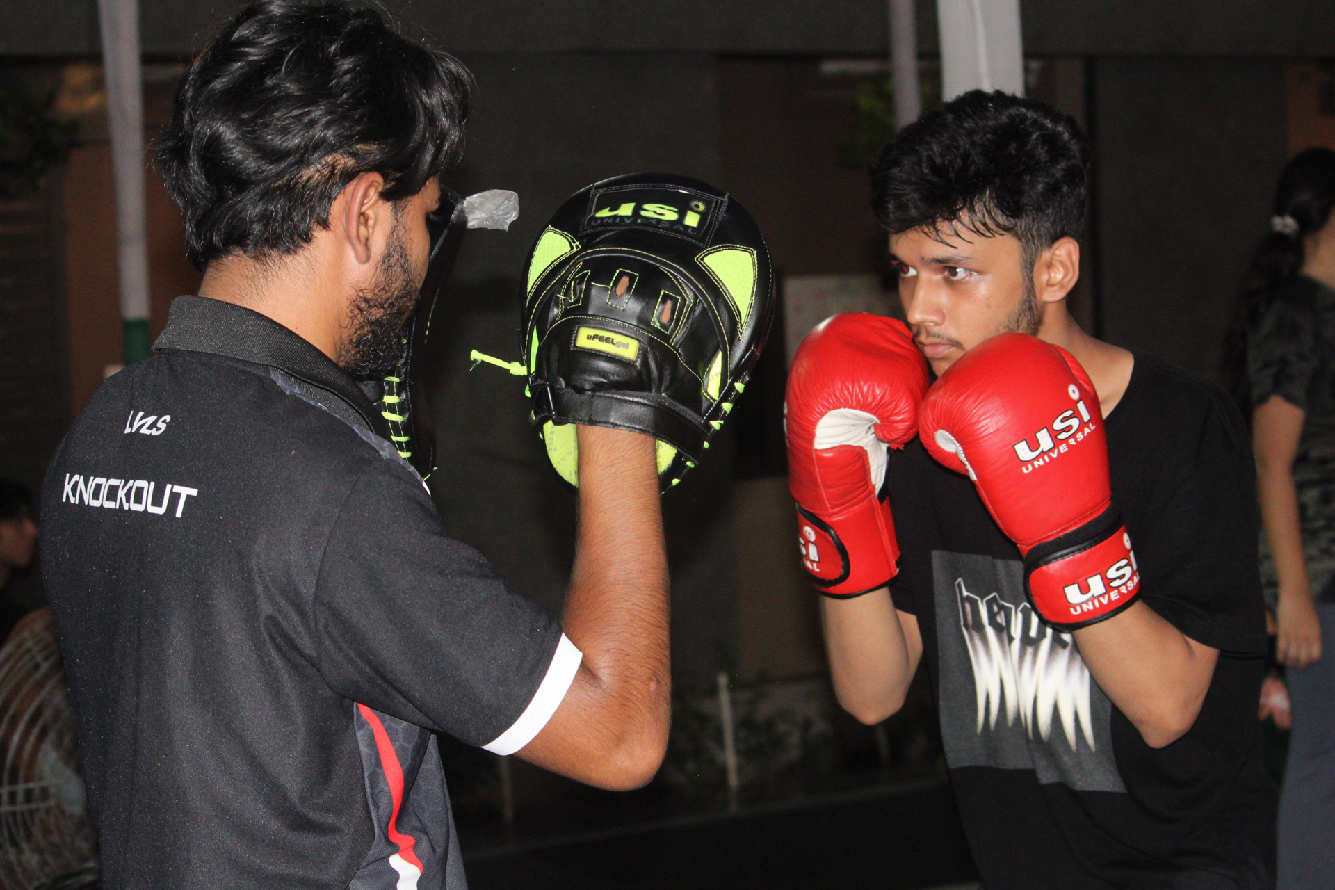 The first day of the workshop focused more on training techniques, exercises, and getting to know and experience kickboxing closely. It started with a warm-up, followed by learning basic punches like the jab, cross, and other strategies and methods. The coach taught the basics of footwork and different kickboxing styles. The day ended with strength and power training. The second day was more of a revision of Day 1, followed by the application of the techniques in real-life matches. The day again began with a warm-up and revision of techniques. Combination training was introduced, where students learned how to use different techniques in various situations and combat scenarios. The final activity of the event paired students for sparring sessions, where they applied the techniques in simulated real matches.
