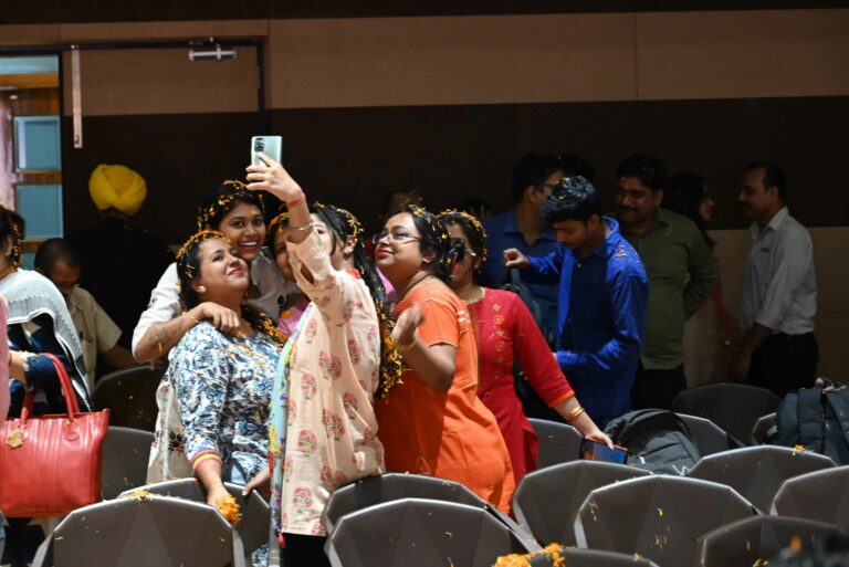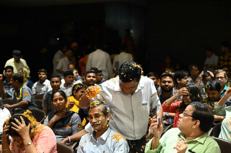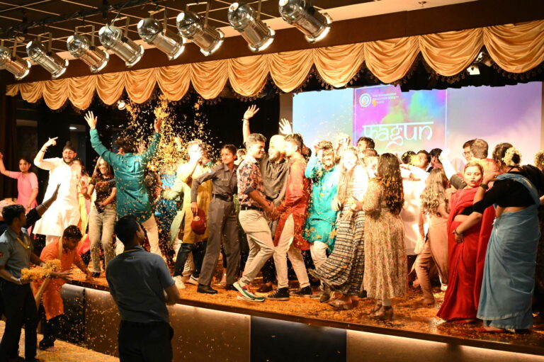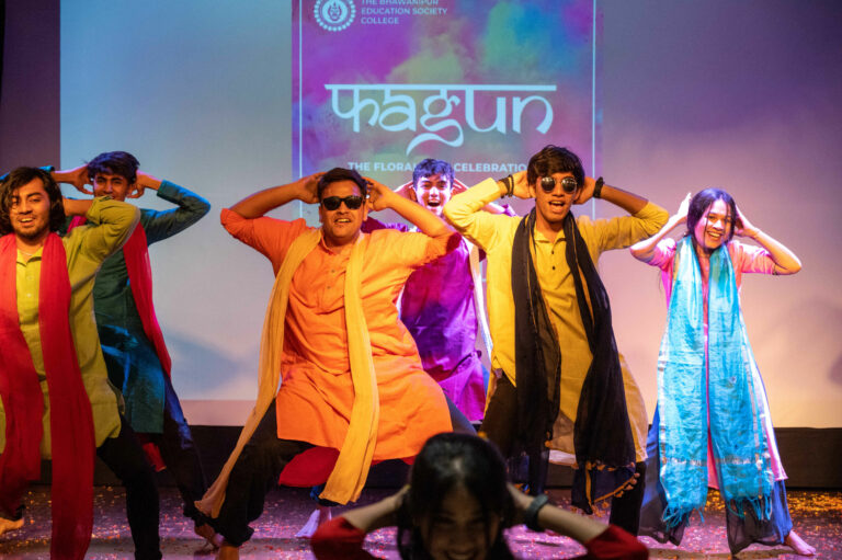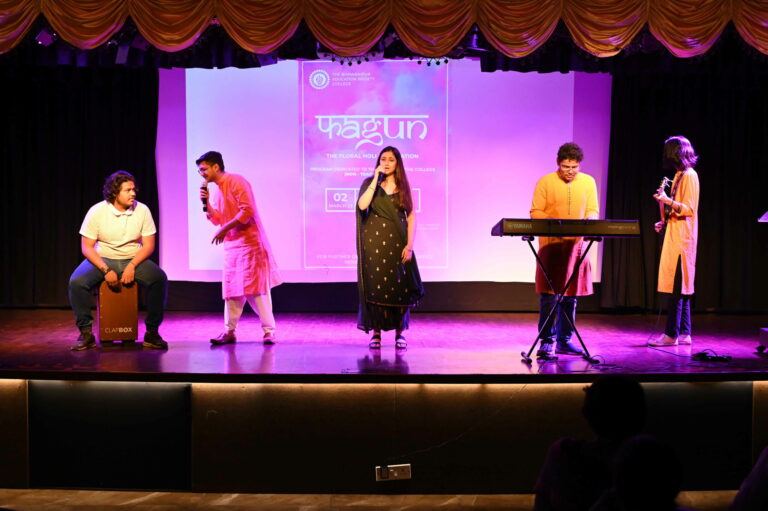 Fagun, the holy month of Spring was celebrated at The Bhawanipur Education Society College in its out-of-the-box style. The festivities of Spring celebrating Holi became a reason for the college to celebrate its non-teaching staff, with a function organised just for them! The event began at 4.30 pm on March 2nd with the members of the non-teaching staff ushering in the Jubilee Hall as they were welcomed with a Sandalwood tilak on their foreheads. The event was initiated with a welcome address by Prof. Dilip Shah, Dean of Student Affairs, who invited each member to enjoy this festival of Spring, Fagun. Prof. Shah’s speech was followed by a Performance by Crescendo Collective, who sang some beautiful melodies on stage like ‘Kesariya’. The event also saw Mr. Saurav Goswami, the music faculty, who took the audience to a musical nostalgia of the 90s with some old tunes from Bollywood.