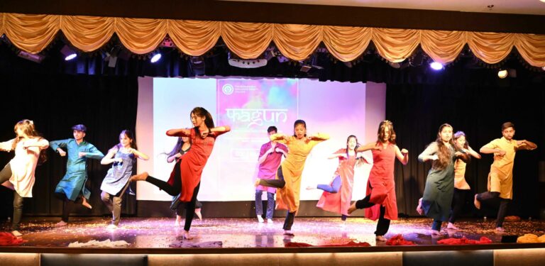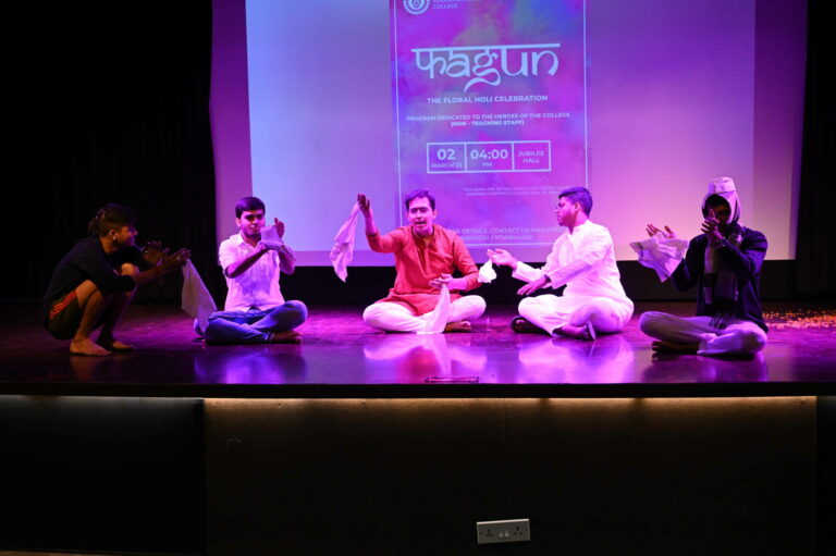 The occasion was graced by the Chairman, Sri Rajnikant Dani, Teacher-in-Charge Dr. Subhabrata Gangopadhyay, who called upon stage members of the non-teaching staff to give them a token of appreciation on behalf of the college. Fagun is celebrated at the college with much fervor not only to celebrate Holi but also to celebrate its family of employees, each of whom counts in the administration of the college. The event saw another highlight which was a performance by Enact, a collective of Theatre that put up a satire on Indian politics with a blend of drama, humor & dance. The audience was engaged in another performance by Flames, a Dance collective of the college that performed old school tunes in a classical dance form. The beauty of Fagun was enhanced by these dance performances as the audience started playing floral Holi amongst each other which lit the ambiance in the mood of Fagun, in its true sense.