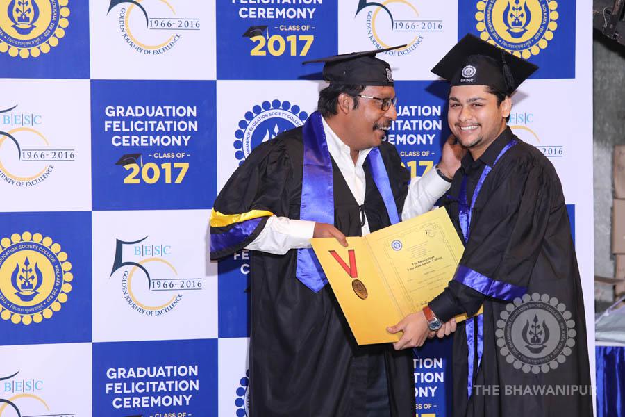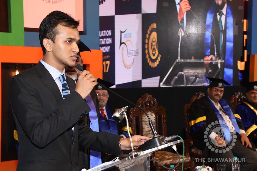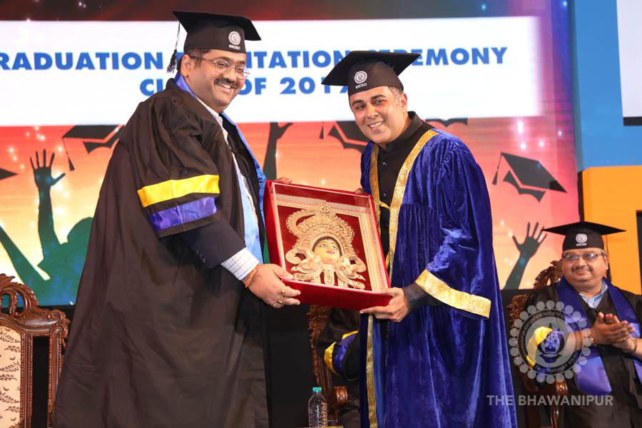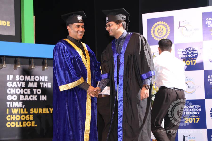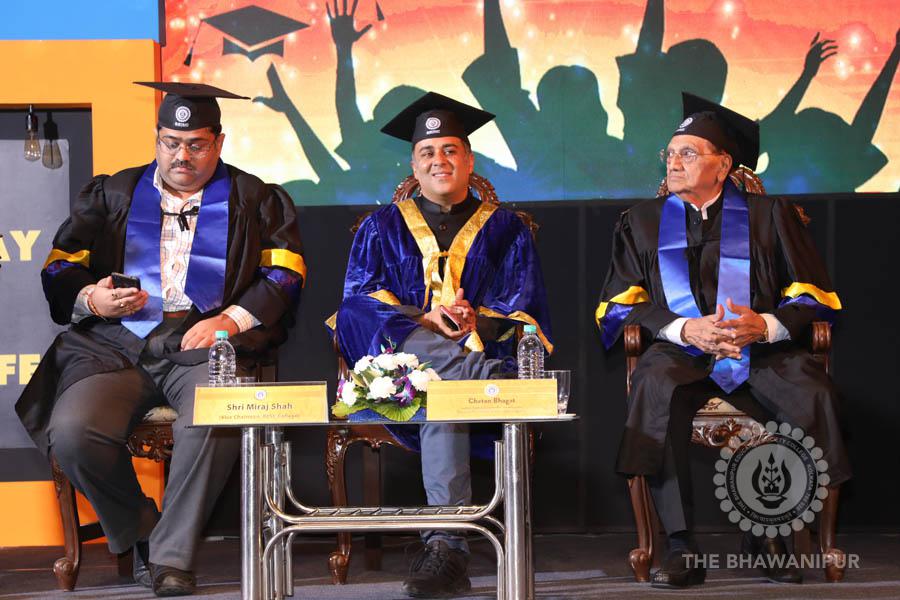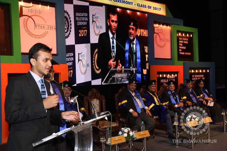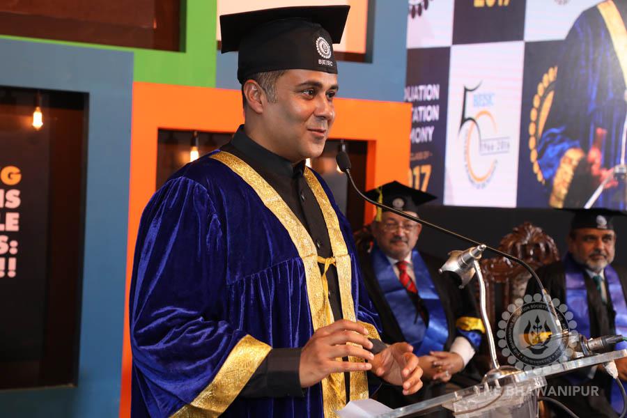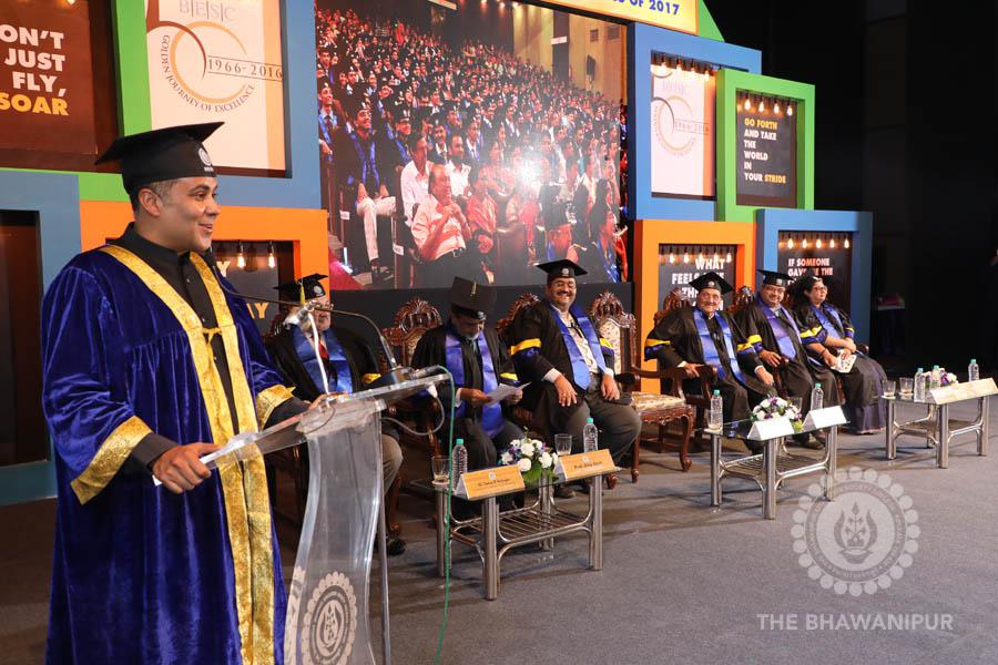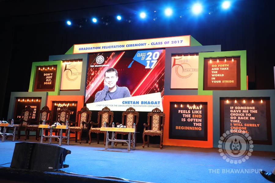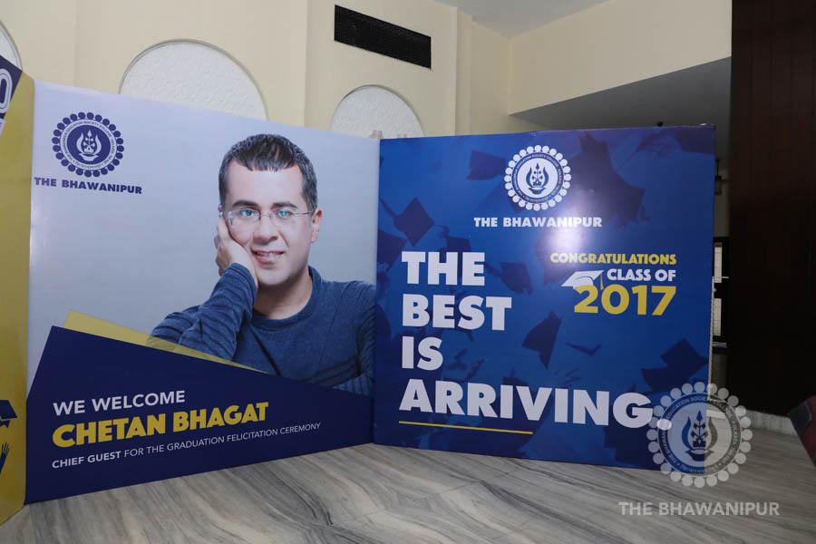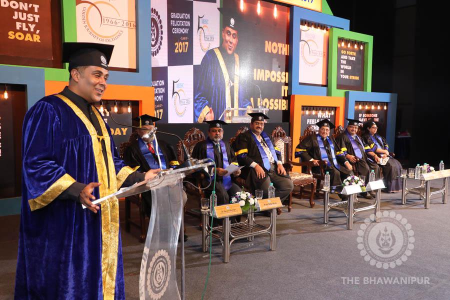 Gurudev Rabindra Nath Tagore’s immortal lines “Where the Mind is without Fear” played in the background as the Convocation procession – comprising of the Chairman of the Bhawanipur Education Society College, Champak Bhai Doshi; the Chief Guest Chetan Bhagat; the Vice Chairman Miraj D Shah; the Director General Prof Suman K Mukherjee; the Dean of Student Affairs Prof Dilip Shah; the Rector; the Teacher in Charge and senior members of the faculty moved on stage in full ceremonial regalia. The Guests were welcomed and the Ceremonial Lamp of Knowledge ignited to formally begin the proceedings of the solemn occasion – the Convocation of the Class of 2017.