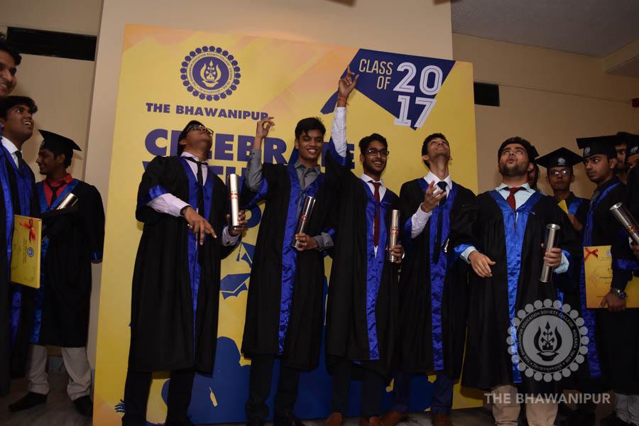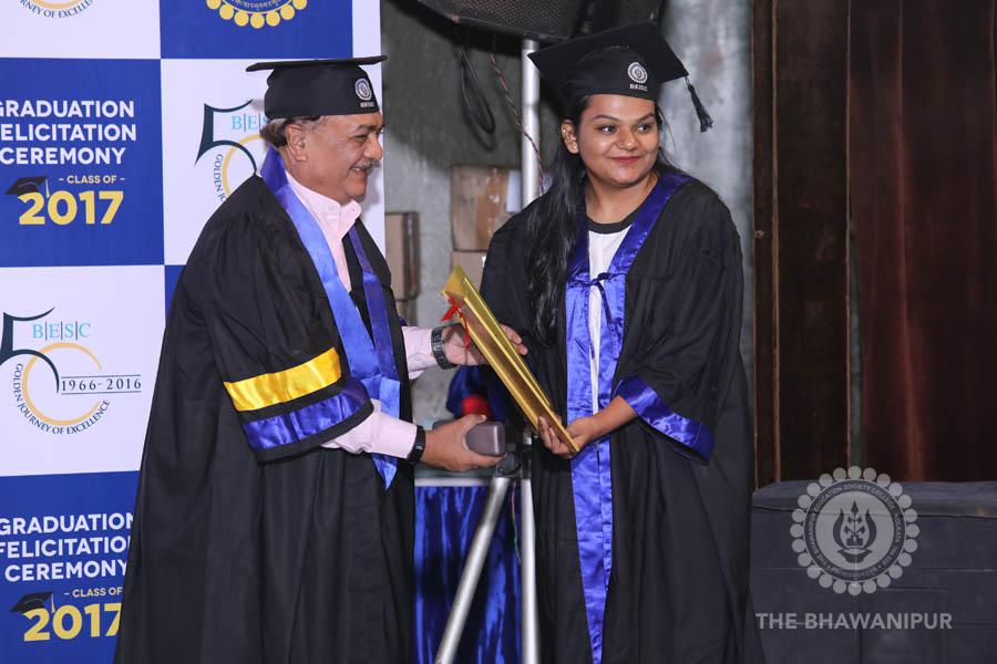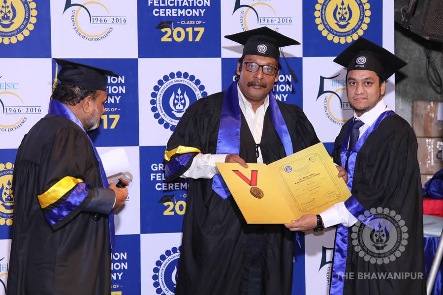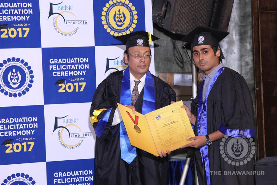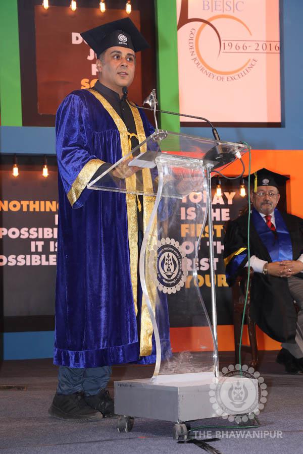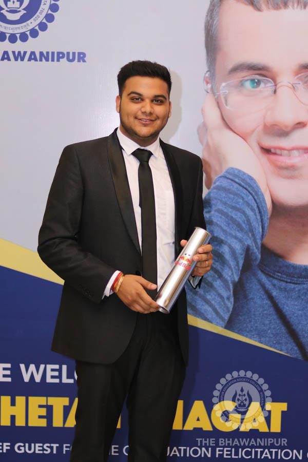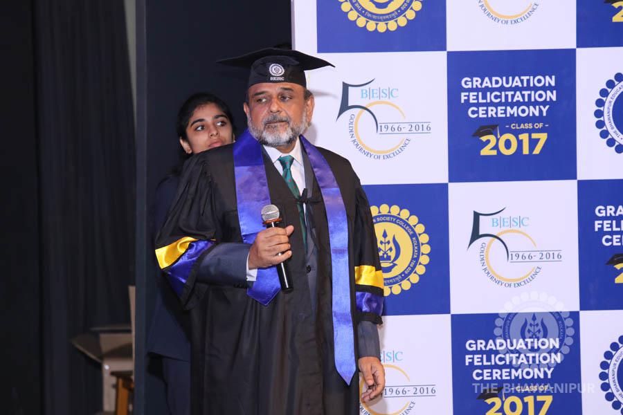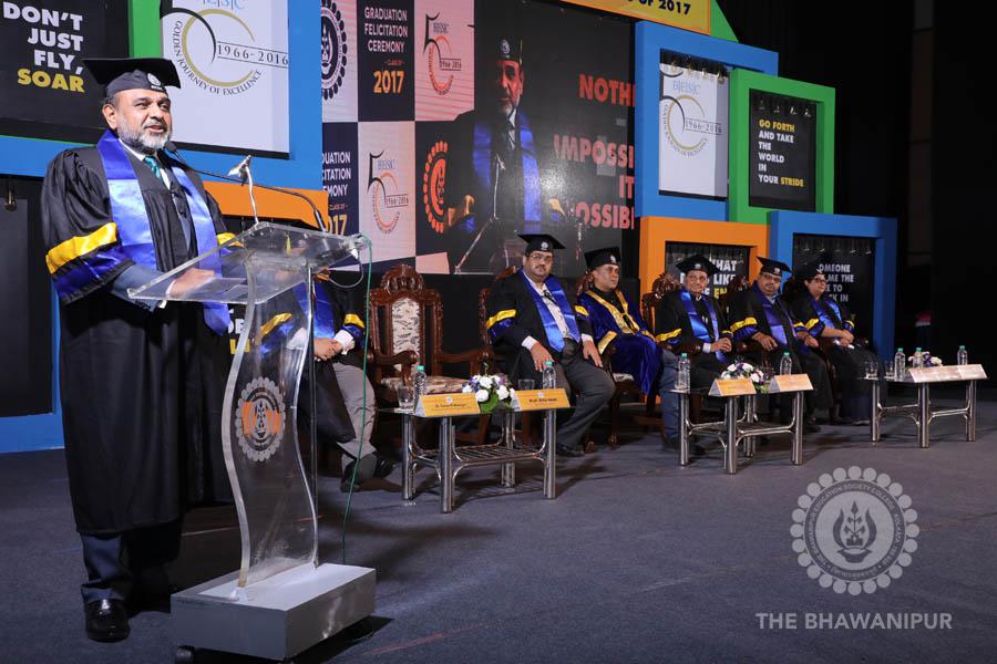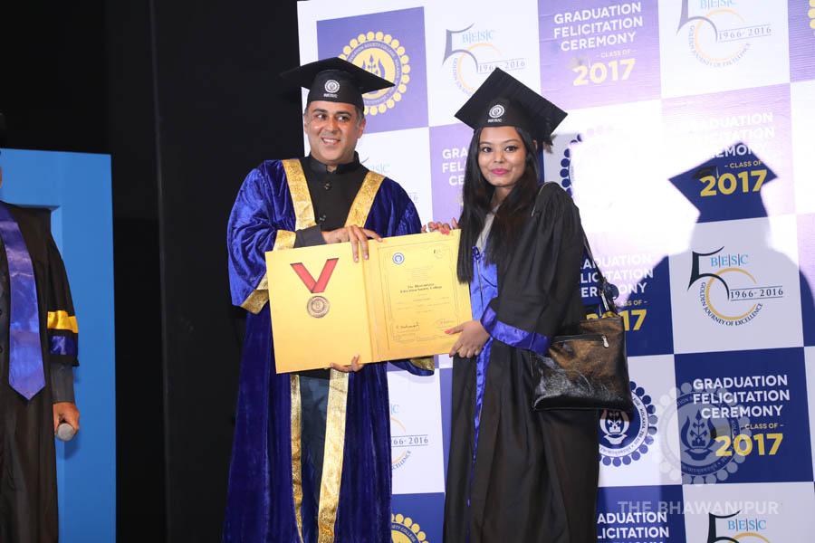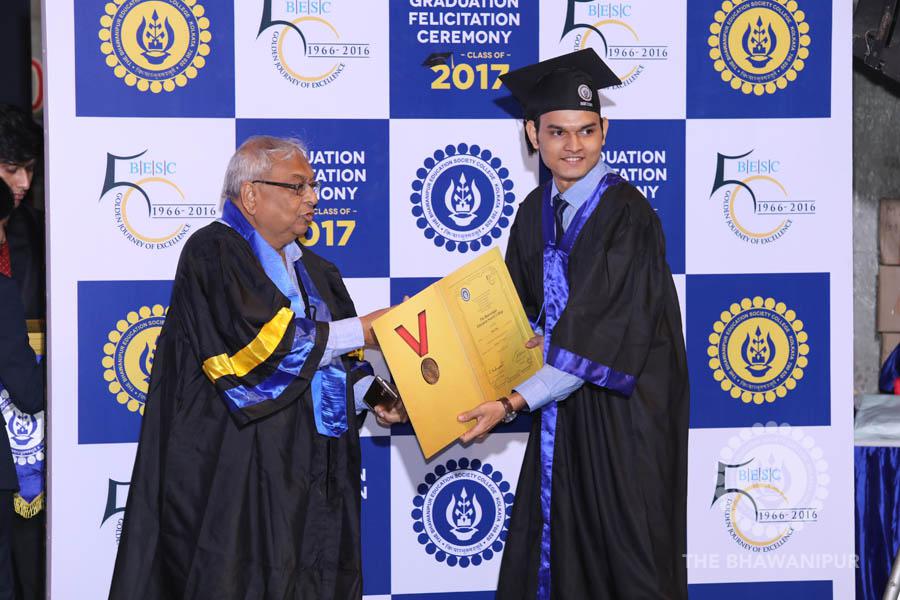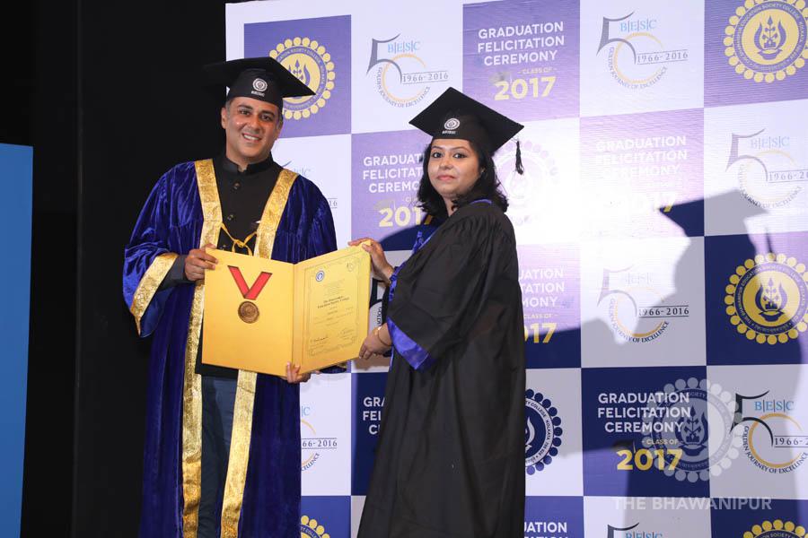 Gurudev Rabindra Nath Tagore’s immortal lines “Where the Mind is without Fear” played in the background as the Convocation procession – comprising of the Chairman of the Bhawanipur Education Society College, Champak Bhai Doshi; the Chief Guest Chetan Bhagat; the Vice Chairman Miraj D Shah; the Director General Prof Suman K Mukherjee; the Dean of Student Affairs Prof Dilip Shah; the Rector; the Teacher in Charge and senior members of the faculty moved on stage in full ceremonial regalia. The Guests were welcomed and the Ceremonial Lamp of Knowledge ignited to formally begin the proceedings of the solemn occasion – the Convocation of the Class of 2017.