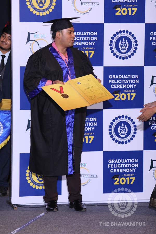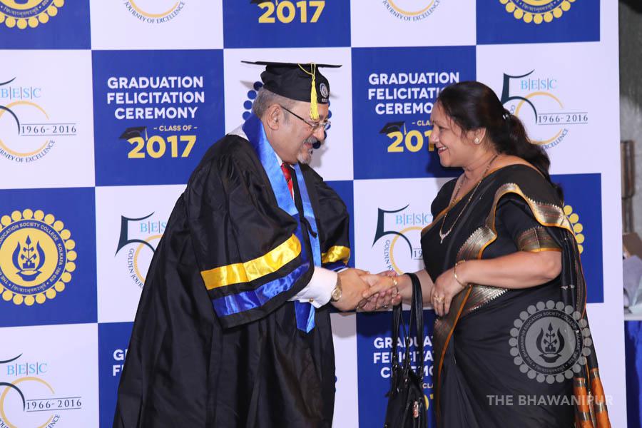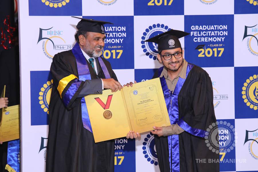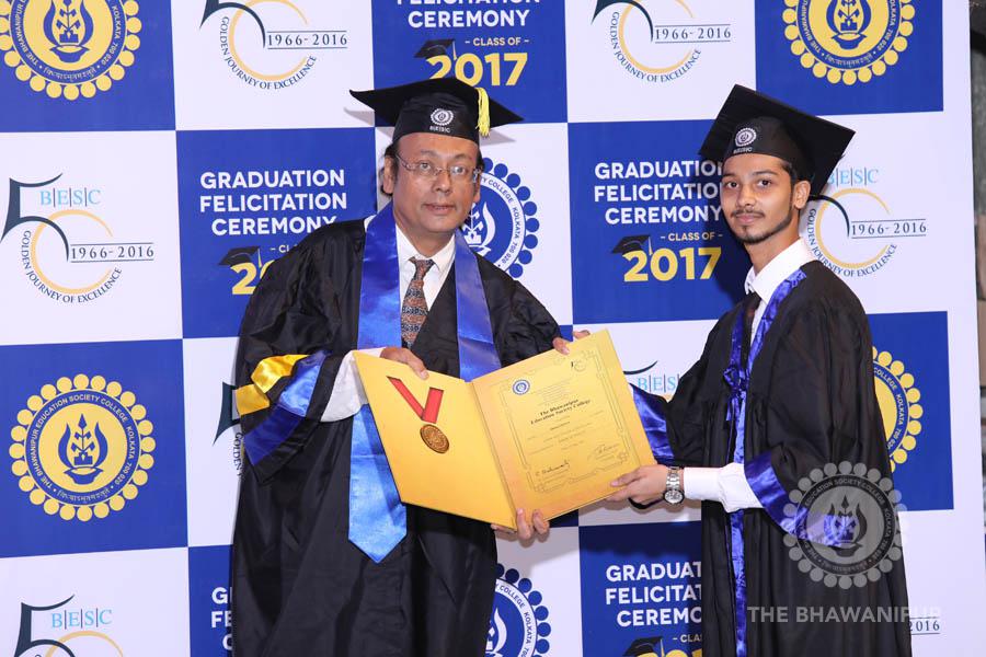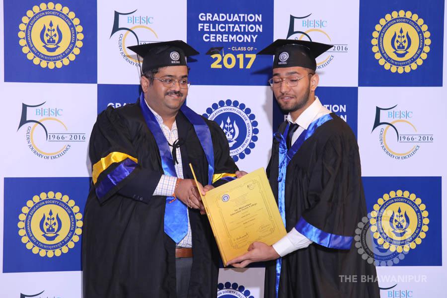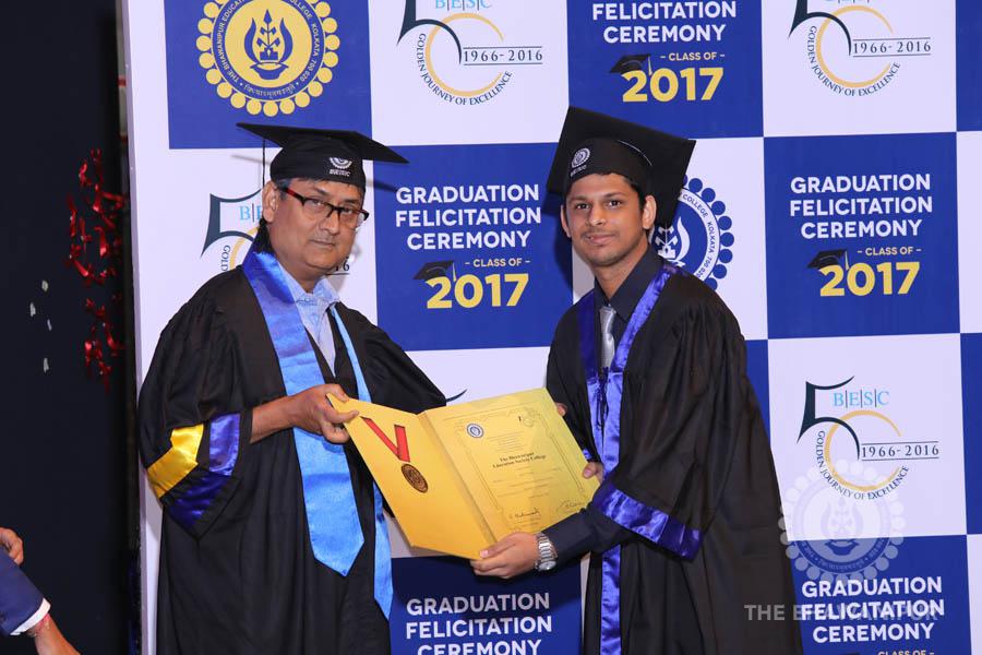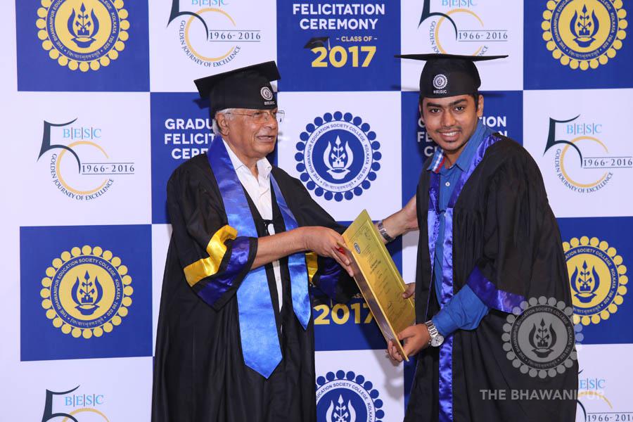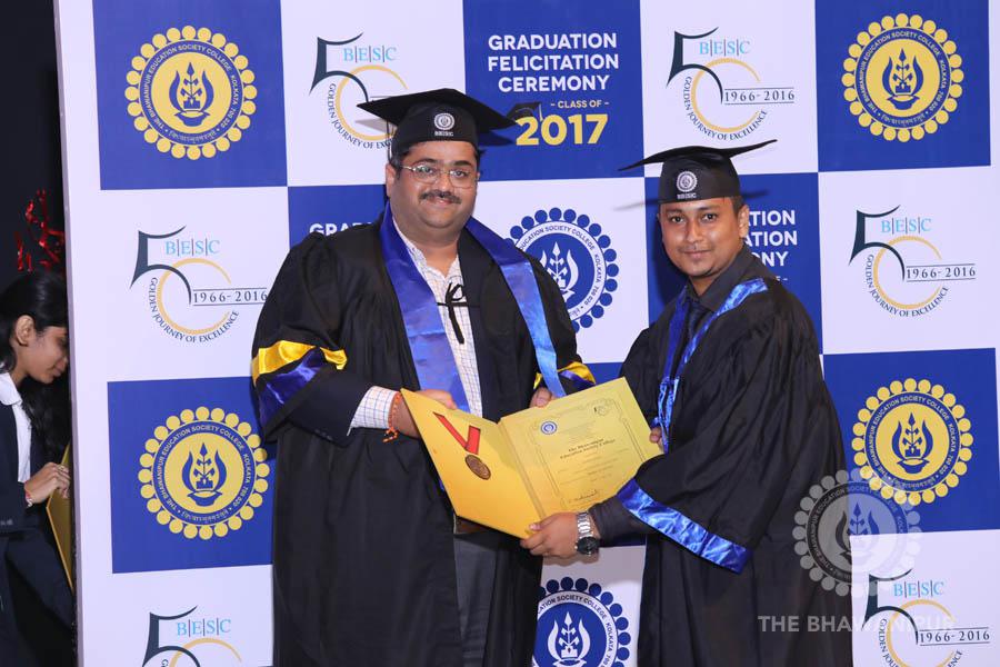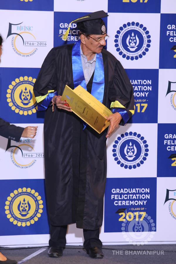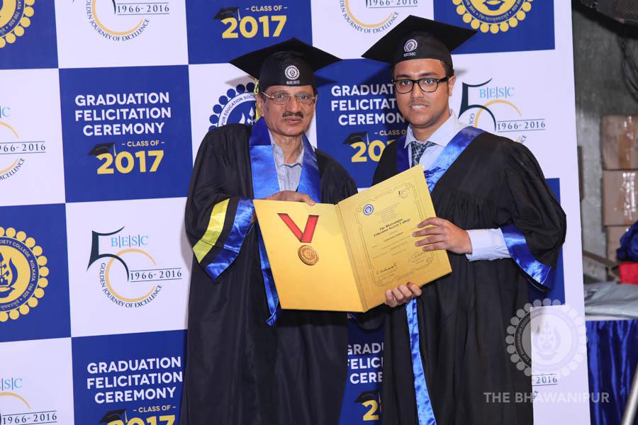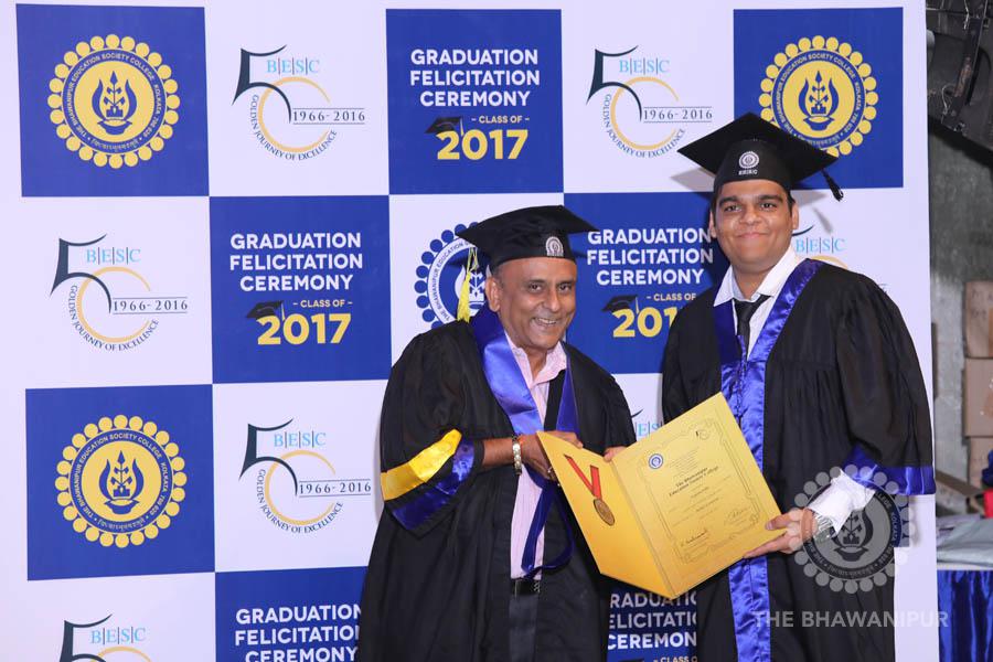 Gurudev Rabindra Nath Tagore’s immortal lines “Where the Mind is without Fear” played in the background as the Convocation procession – comprising of the Chairman of the Bhawanipur Education Society College, Champak Bhai Doshi; the Chief Guest Chetan Bhagat; the Vice Chairman Miraj D Shah; the Director General Prof Suman K Mukherjee; the Dean of Student Affairs Prof Dilip Shah; the Rector; the Teacher in Charge and senior members of the faculty moved on stage in full ceremonial regalia. The Guests were welcomed and the Ceremonial Lamp of Knowledge ignited to formally begin the proceedings of the solemn occasion – the Convocation of the Class of 2017.