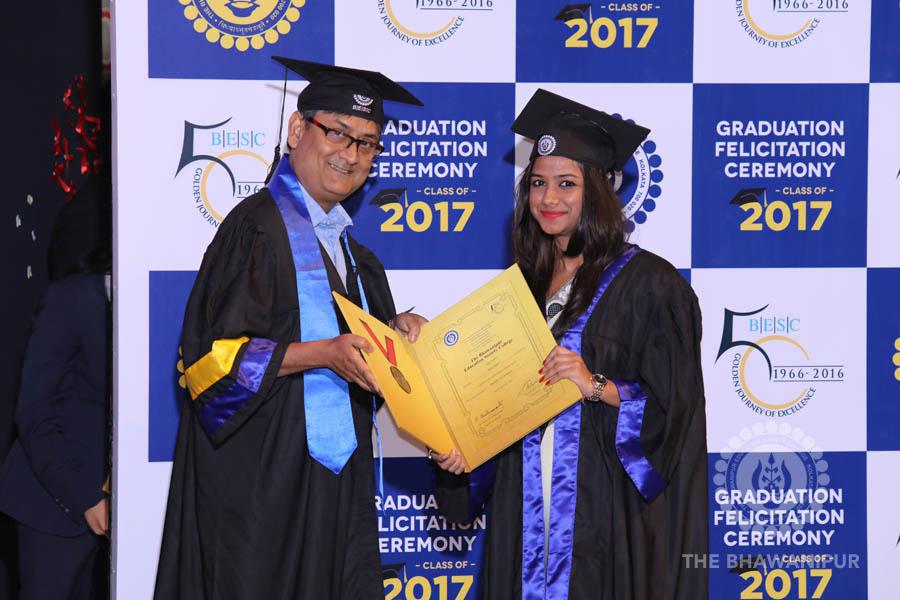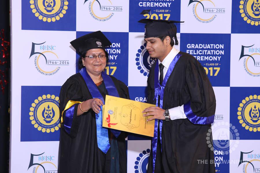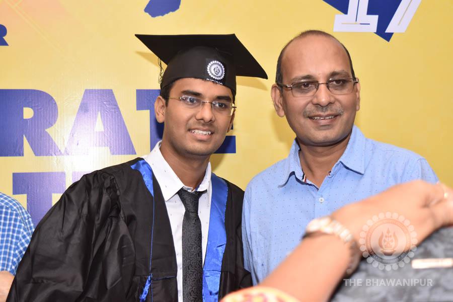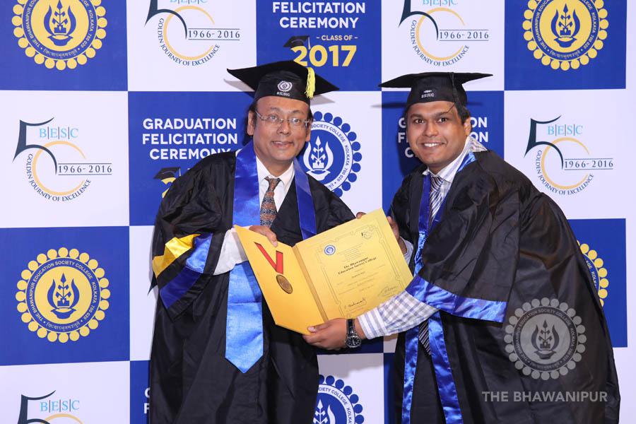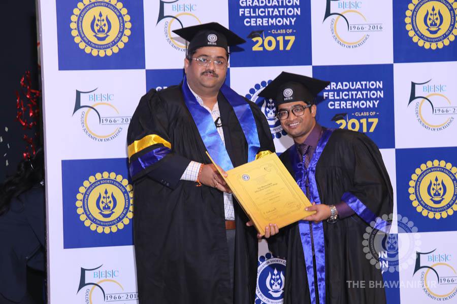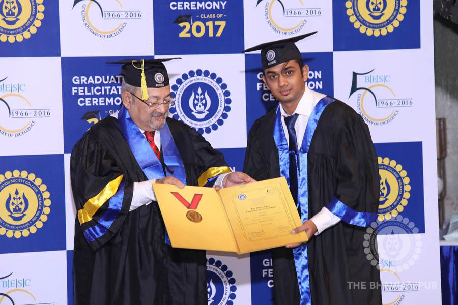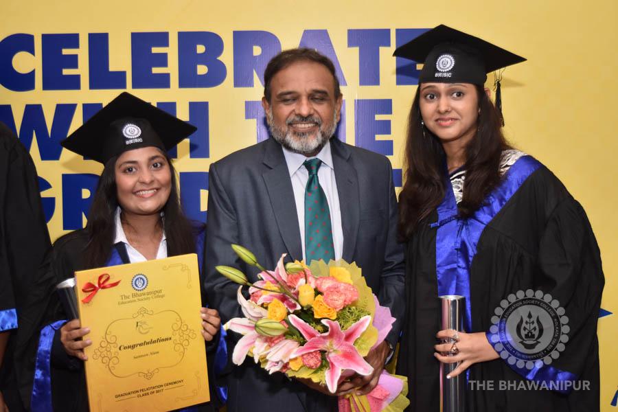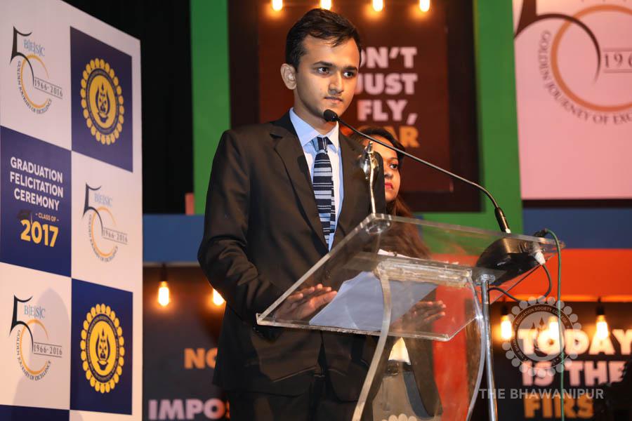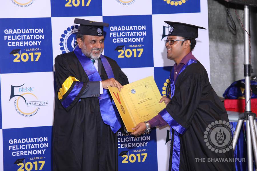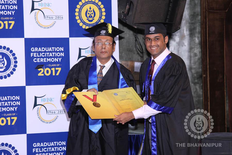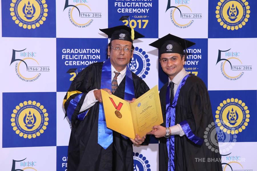 Gurudev Rabindra Nath Tagore’s immortal lines “Where the Mind is without Fear” played in the background as the Convocation procession – comprising of the Chairman of the Bhawanipur Education Society College, Champak Bhai Doshi; the Chief Guest Chetan Bhagat; the Vice Chairman Miraj D Shah; the Director General Prof Suman K Mukherjee; the Dean of Student Affairs Prof Dilip Shah; the Rector; the Teacher in Charge and senior members of the faculty moved on stage in full ceremonial regalia. The Guests were welcomed and the Ceremonial Lamp of Knowledge ignited to formally begin the proceedings of the solemn occasion – the Convocation of the Class of 2017.