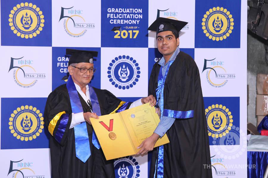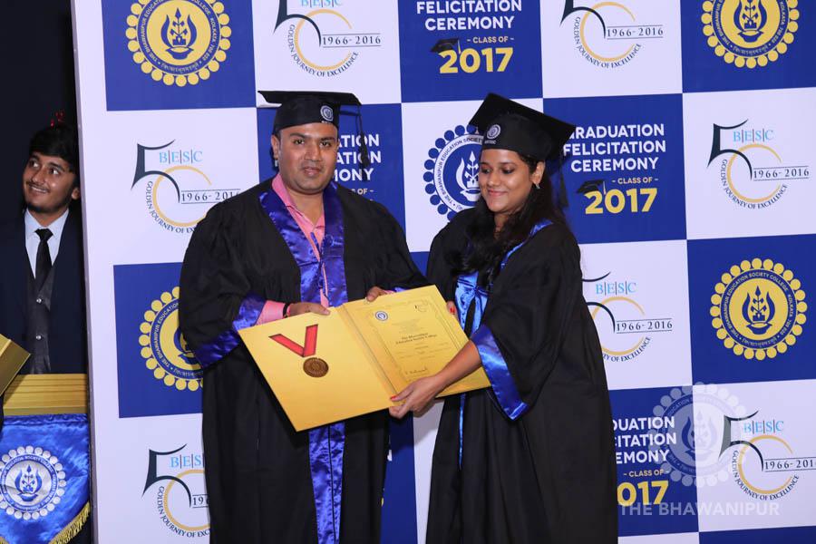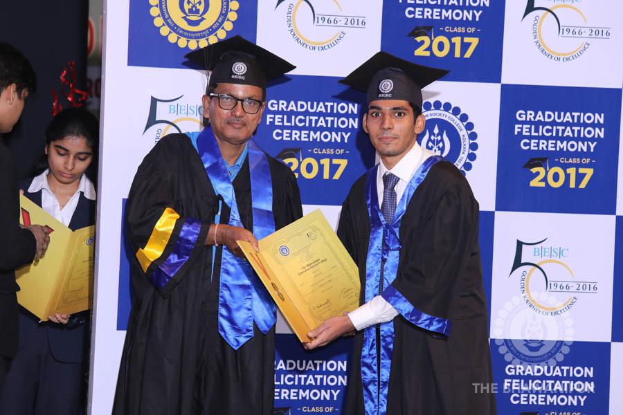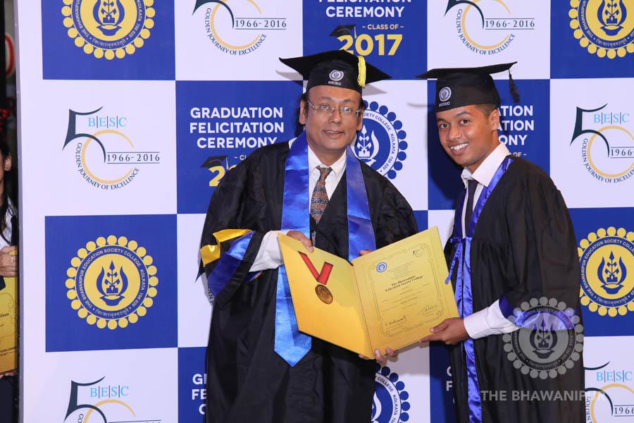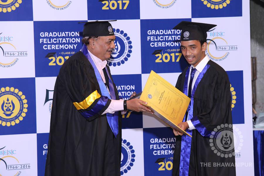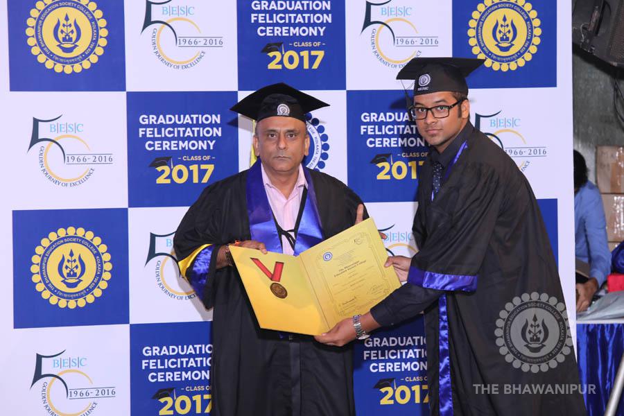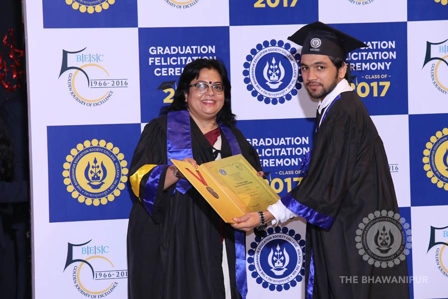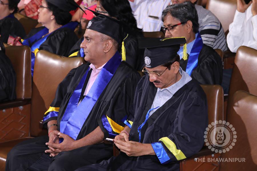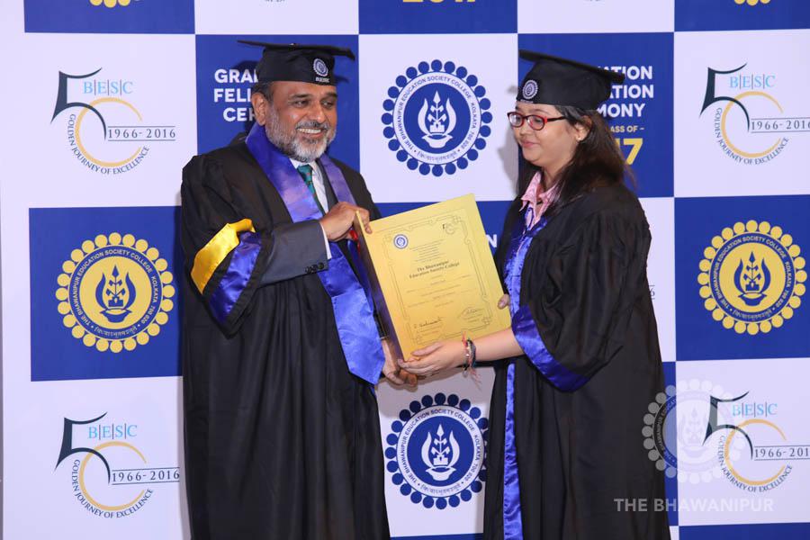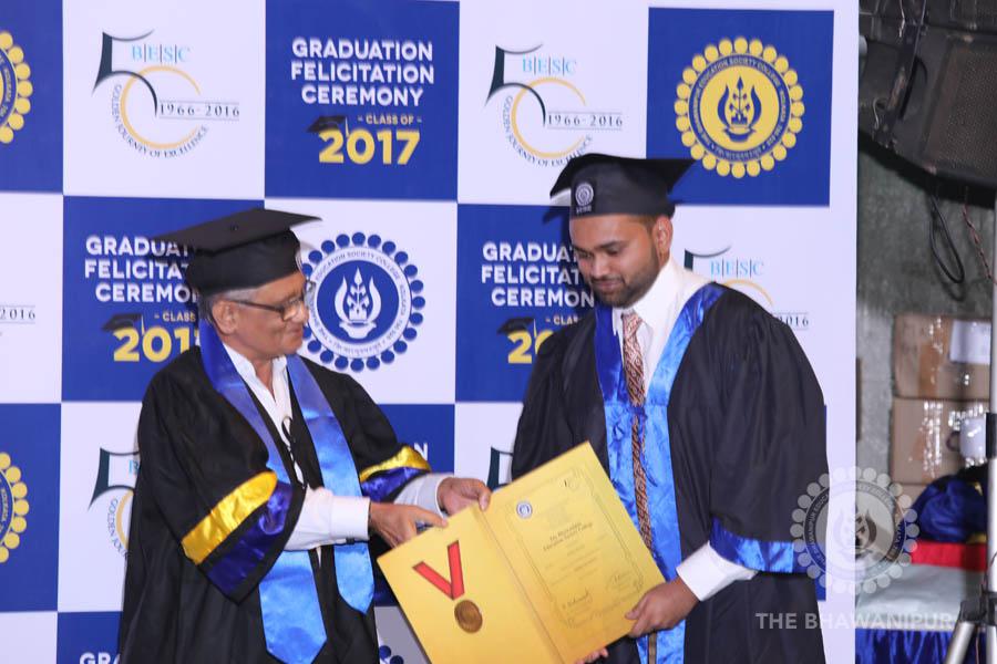 Gurudev Rabindra Nath Tagore’s immortal lines “Where the Mind is without Fear” played in the background as the Convocation procession – comprising of the Chairman of the Bhawanipur Education Society College, Champak Bhai Doshi; the Chief Guest Chetan Bhagat; the Vice Chairman Miraj D Shah; the Director General Prof Suman K Mukherjee; the Dean of Student Affairs Prof Dilip Shah; the Rector; the Teacher in Charge and senior members of the faculty moved on stage in full ceremonial regalia. The Guests were welcomed and the Ceremonial Lamp of Knowledge ignited to formally begin the proceedings of the solemn occasion – the Convocation of the Class of 2017.
