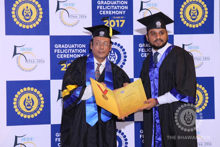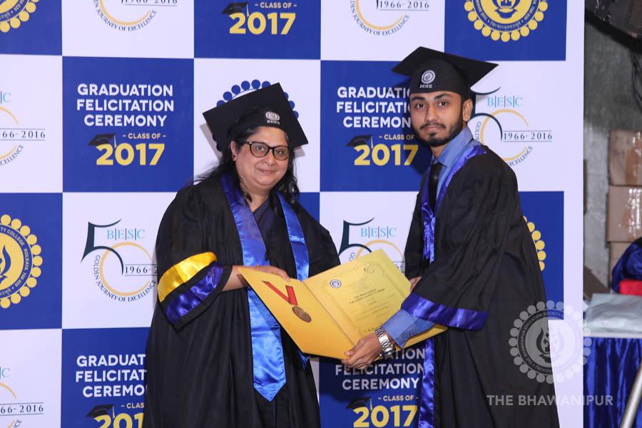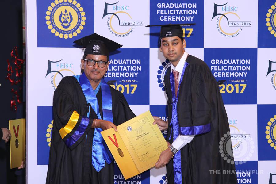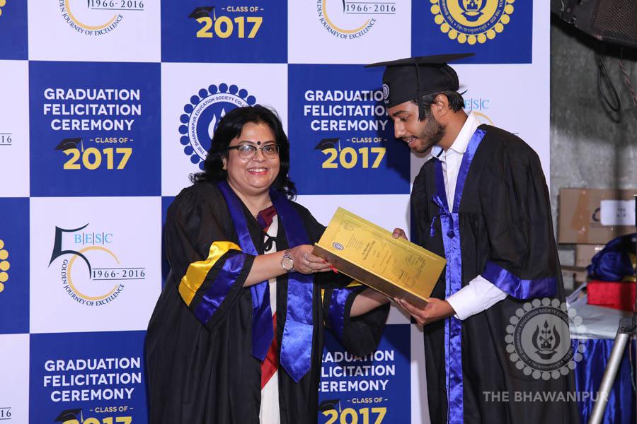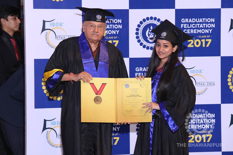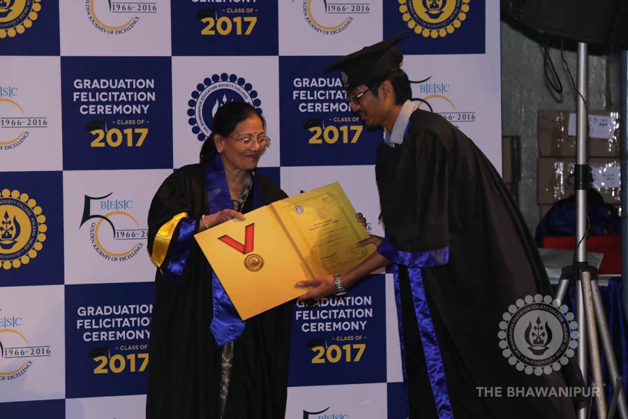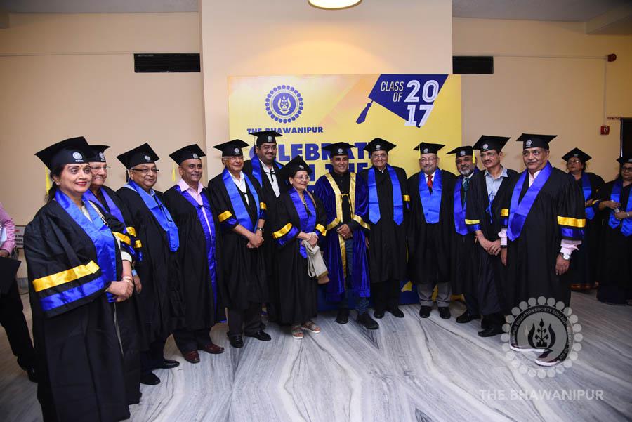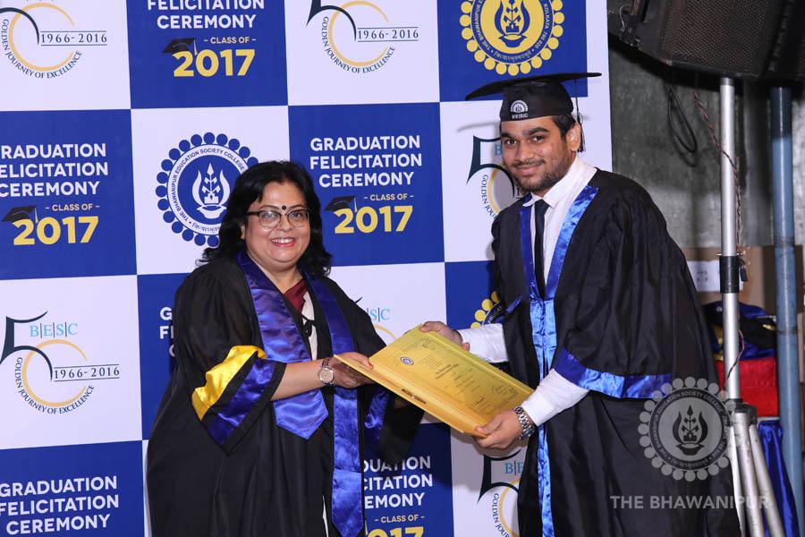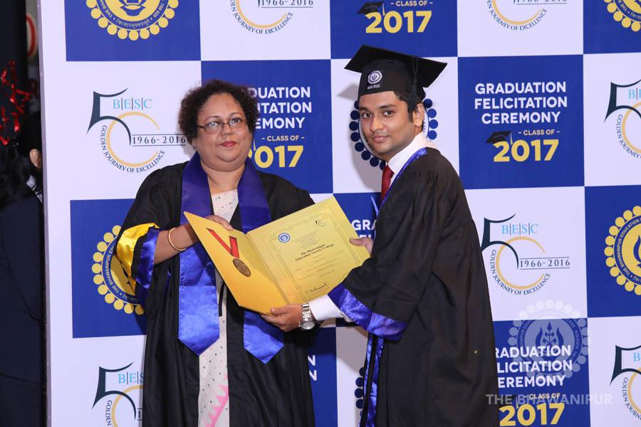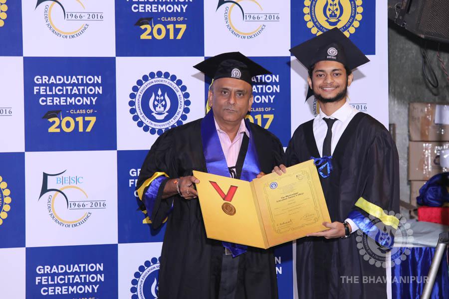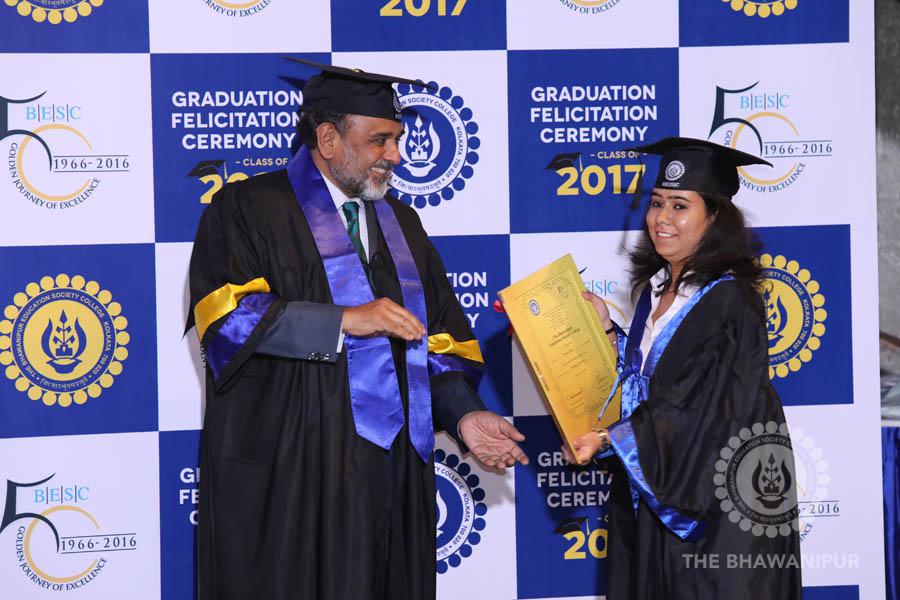 Gurudev Rabindra Nath Tagore’s immortal lines “Where the Mind is without Fear” played in the background as the Convocation procession – comprising of the Chairman of the Bhawanipur Education Society College, Champak Bhai Doshi; the Chief Guest Chetan Bhagat; the Vice Chairman Miraj D Shah; the Director General Prof Suman K Mukherjee; the Dean of Student Affairs Prof Dilip Shah; the Rector; the Teacher in Charge and senior members of the faculty moved on stage in full ceremonial regalia. The Guests were welcomed and the Ceremonial Lamp of Knowledge ignited to formally begin the proceedings of the solemn occasion – the Convocation of the Class of 2017.