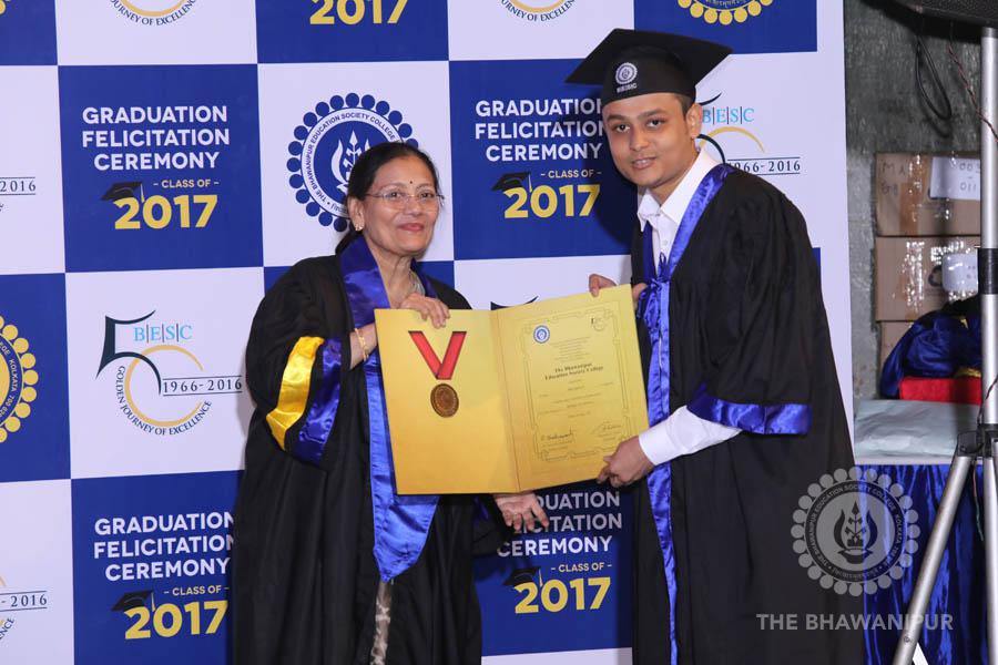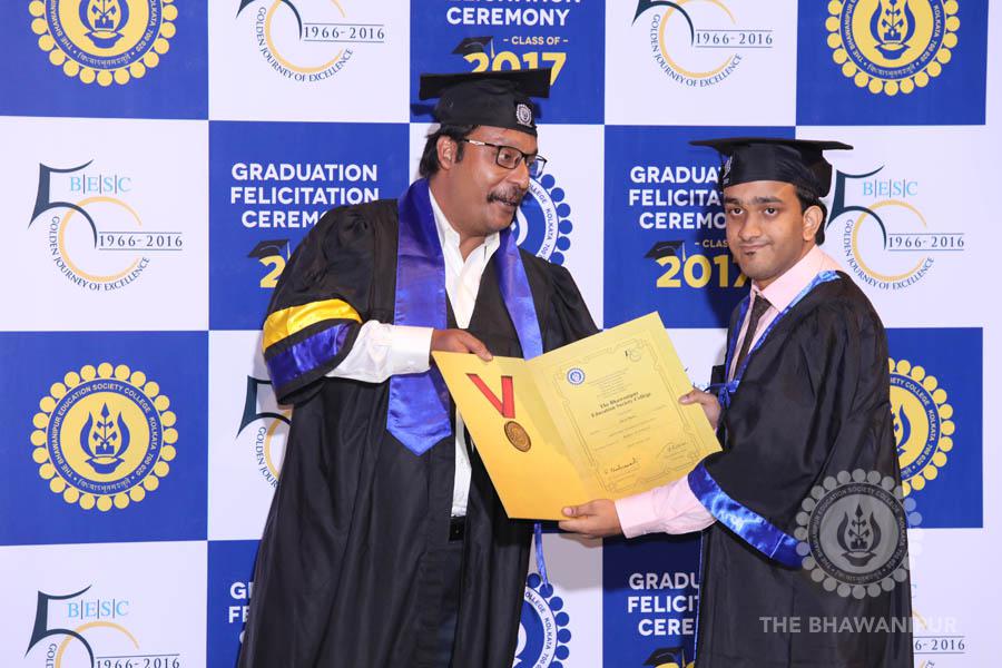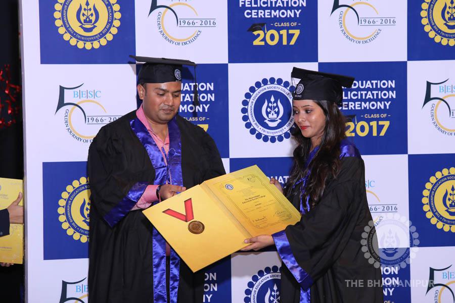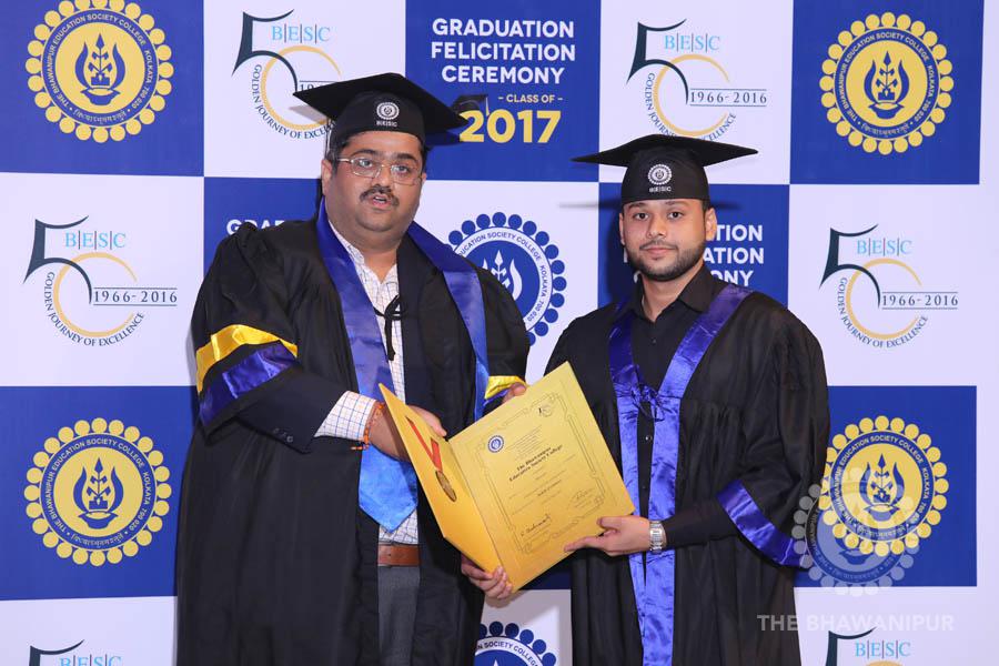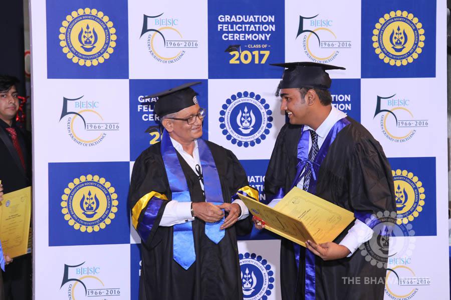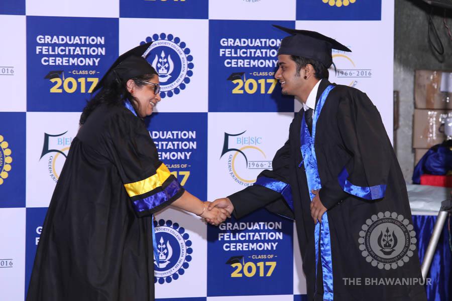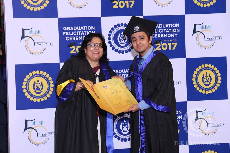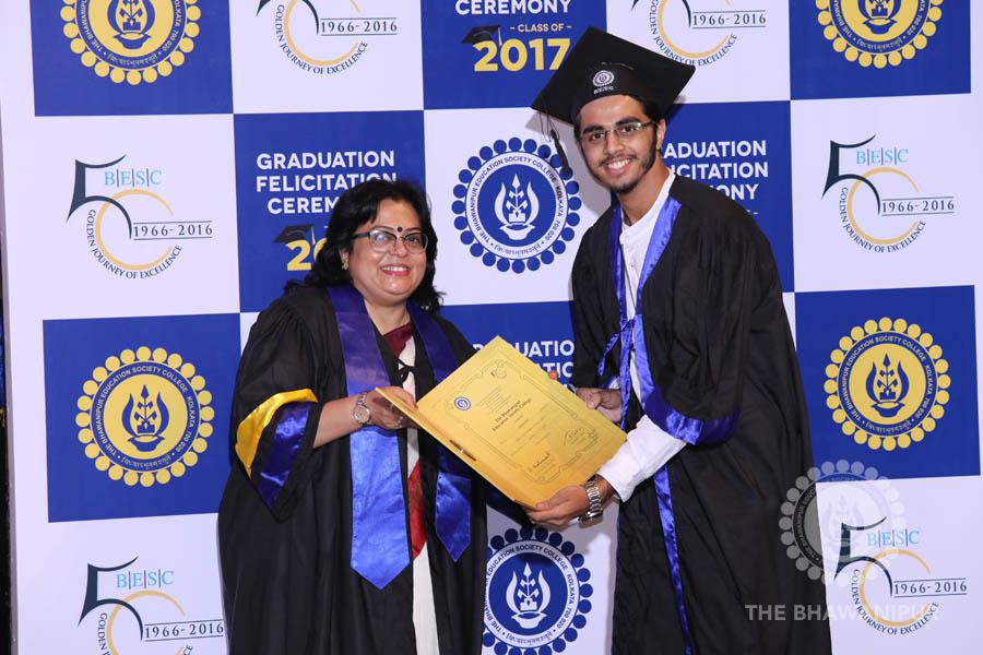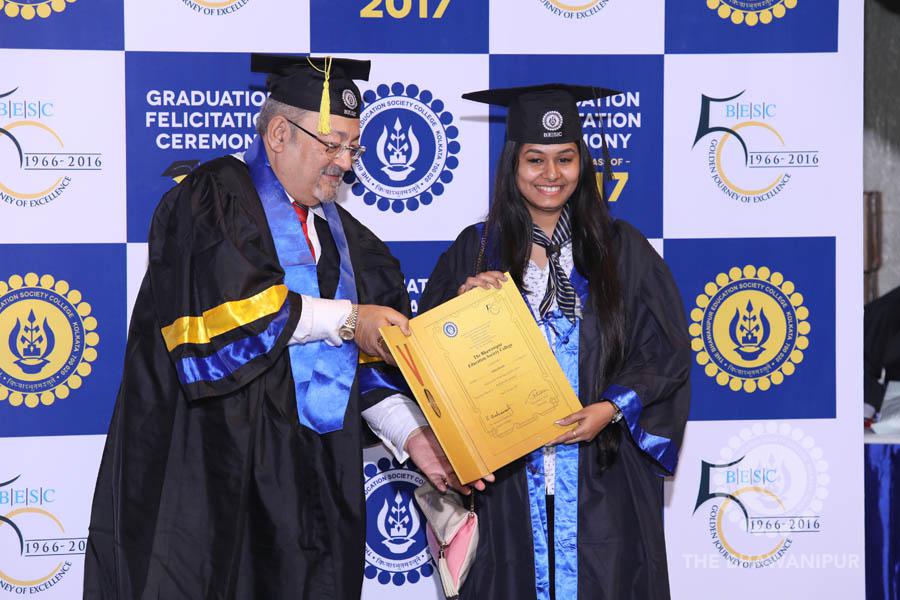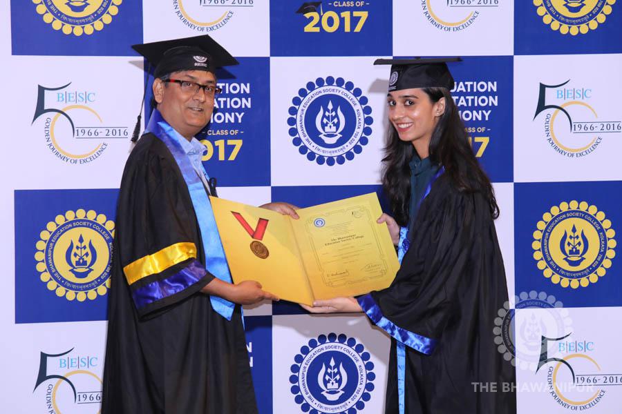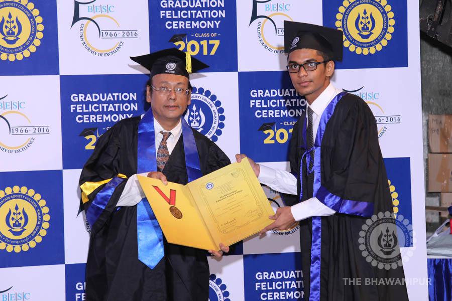 Gurudev Rabindra Nath Tagore’s immortal lines “Where the Mind is without Fear” played in the background as the Convocation procession – comprising of the Chairman of the Bhawanipur Education Society College, Champak Bhai Doshi; the Chief Guest Chetan Bhagat; the Vice Chairman Miraj D Shah; the Director General Prof Suman K Mukherjee; the Dean of Student Affairs Prof Dilip Shah; the Rector; the Teacher in Charge and senior members of the faculty moved on stage in full ceremonial regalia. The Guests were welcomed and the Ceremonial Lamp of Knowledge ignited to formally begin the proceedings of the solemn occasion – the Convocation of the Class of 2017.