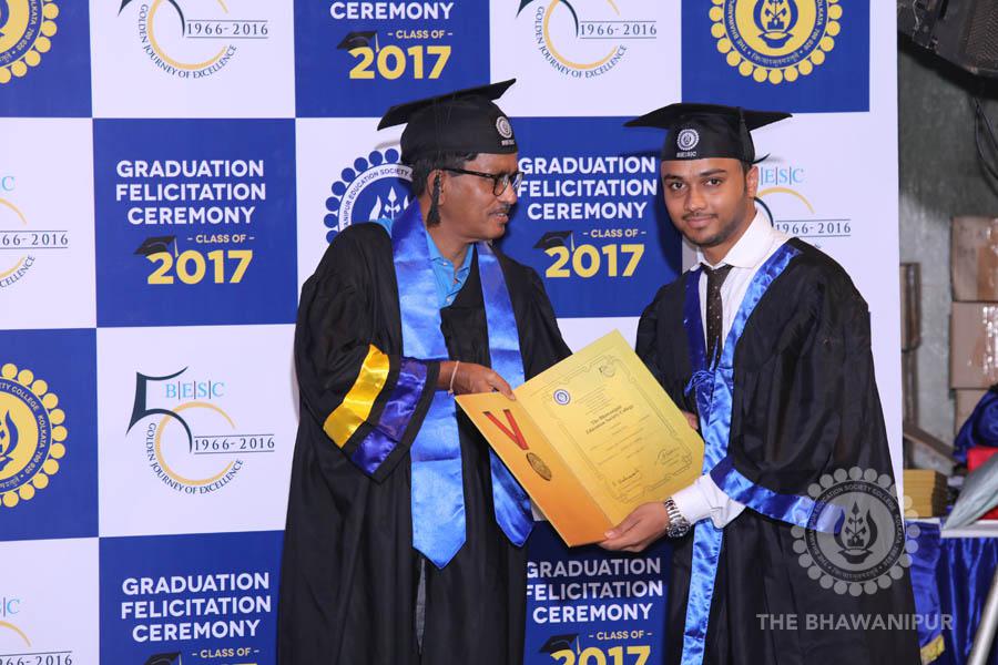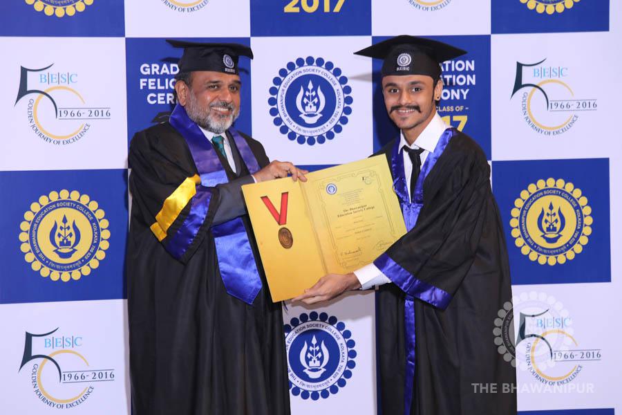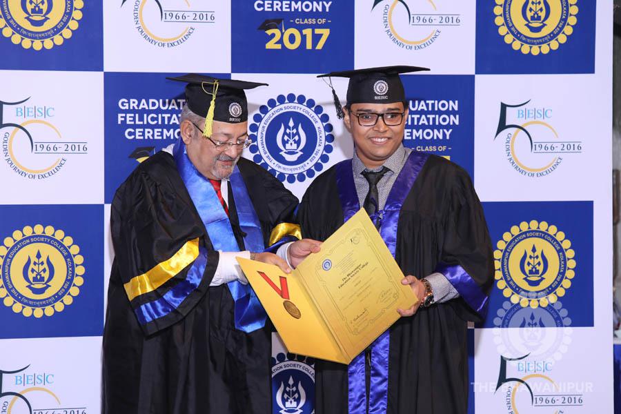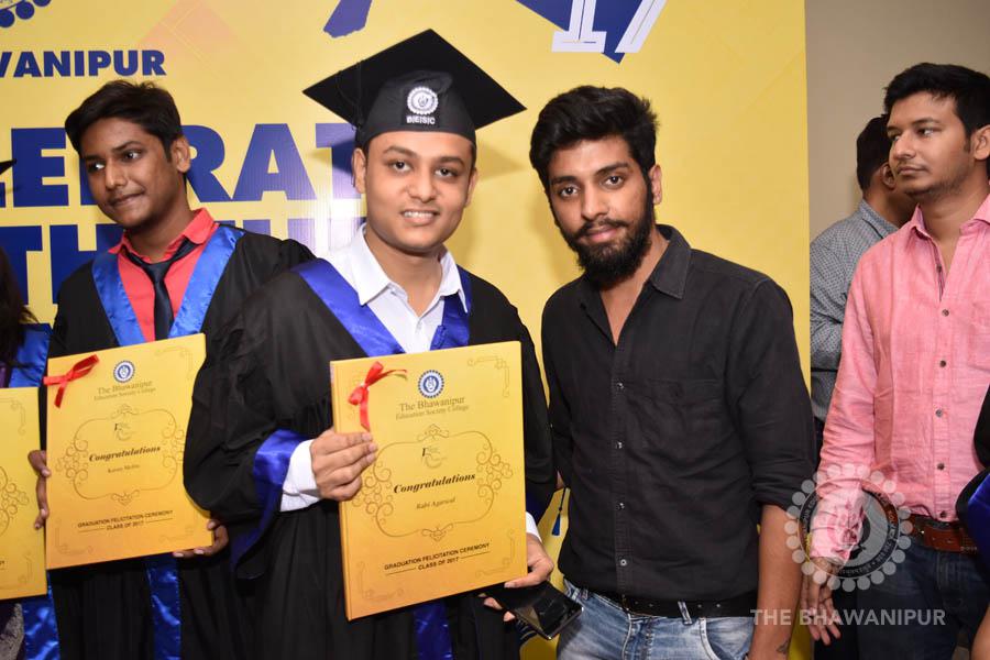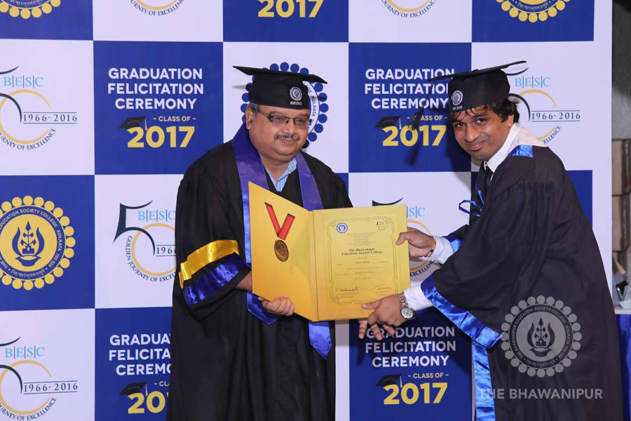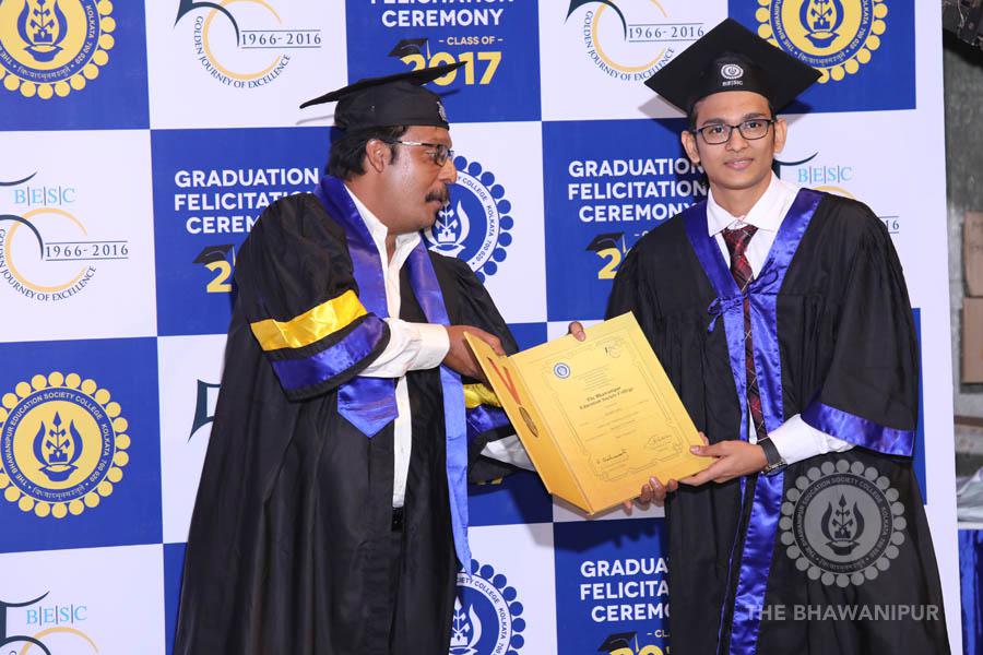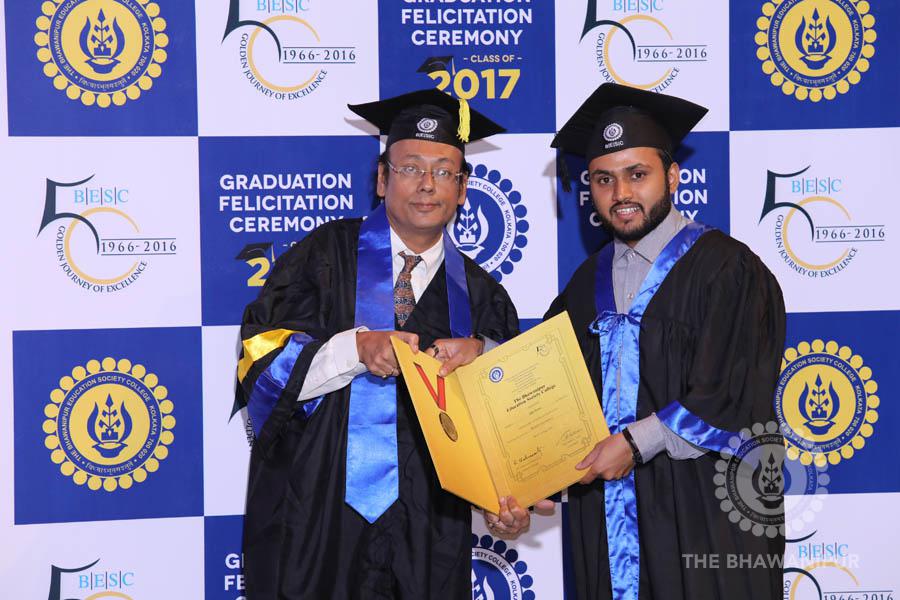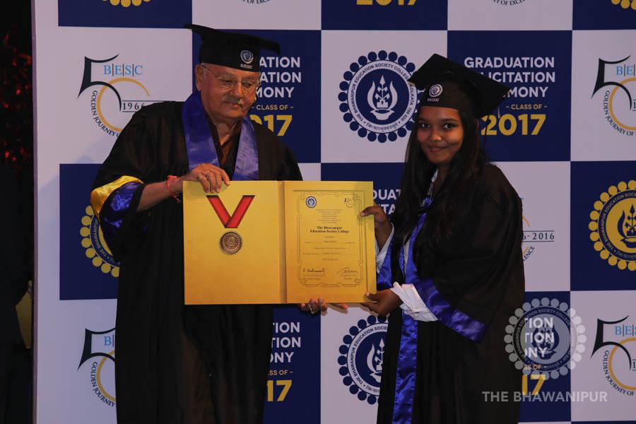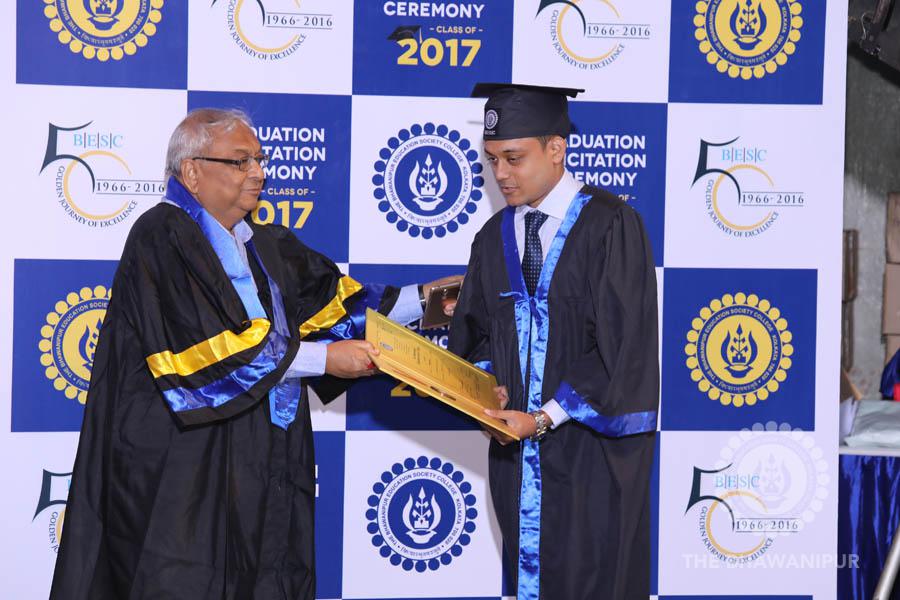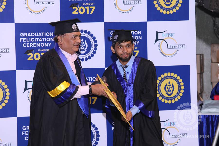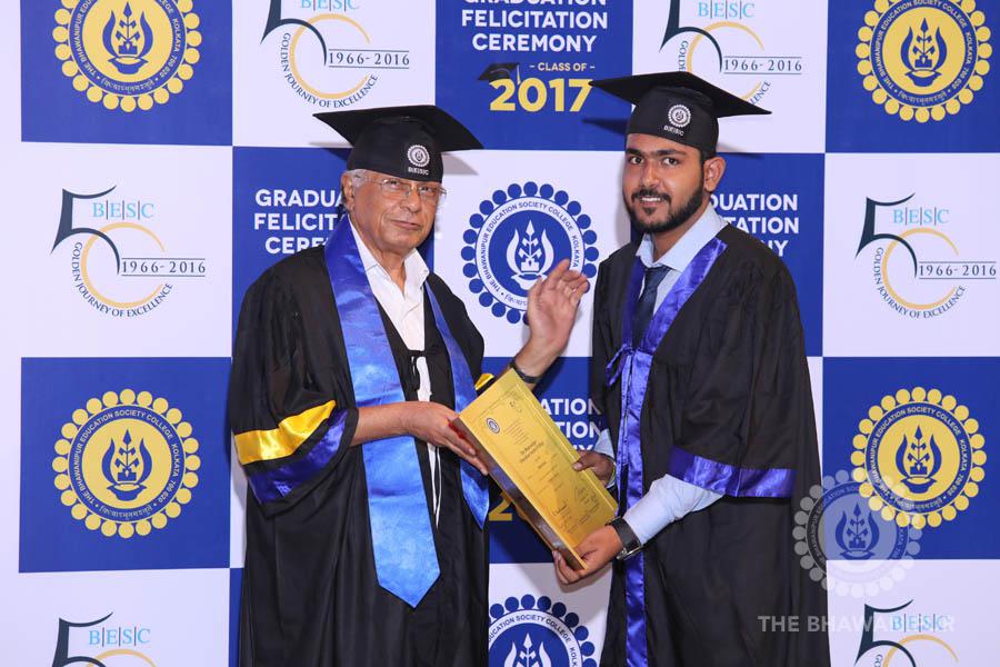 Gurudev Rabindra Nath Tagore’s immortal lines “Where the Mind is without Fear” played in the background as the Convocation procession – comprising of the Chairman of the Bhawanipur Education Society College, Champak Bhai Doshi; the Chief Guest Chetan Bhagat; the Vice Chairman Miraj D Shah; the Director General Prof Suman K Mukherjee; the Dean of Student Affairs Prof Dilip Shah; the Rector; the Teacher in Charge and senior members of the faculty moved on stage in full ceremonial regalia. The Guests were welcomed and the Ceremonial Lamp of Knowledge ignited to formally begin the proceedings of the solemn occasion – the Convocation of the Class of 2017.