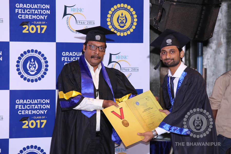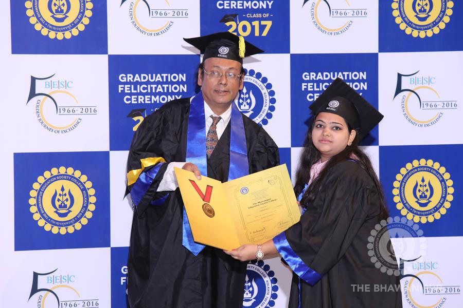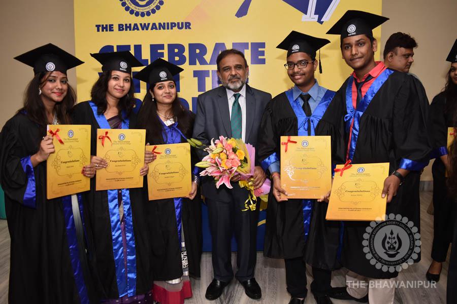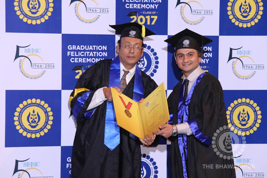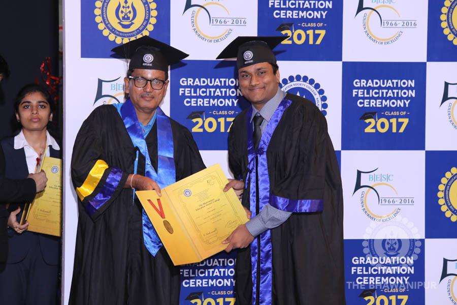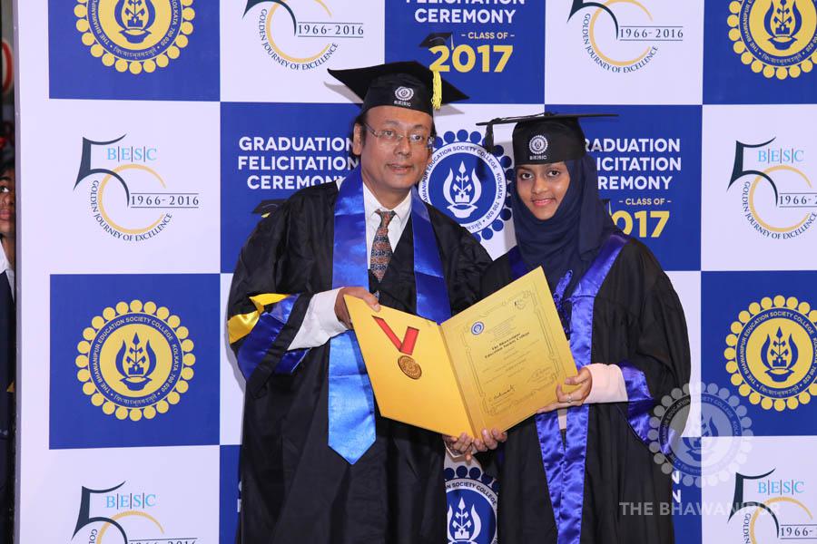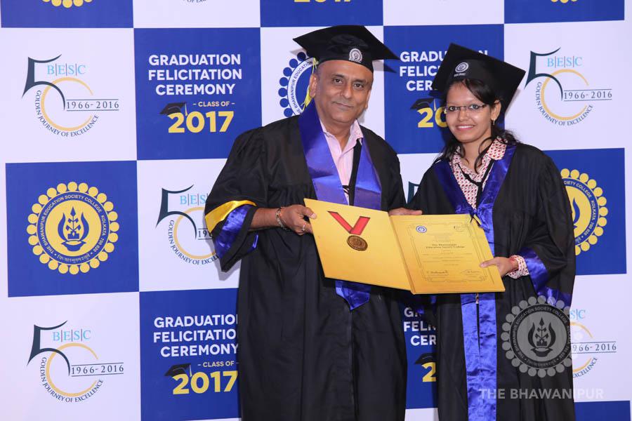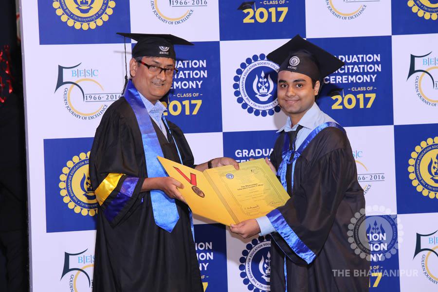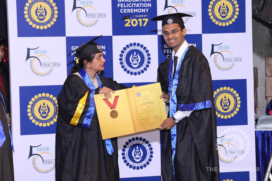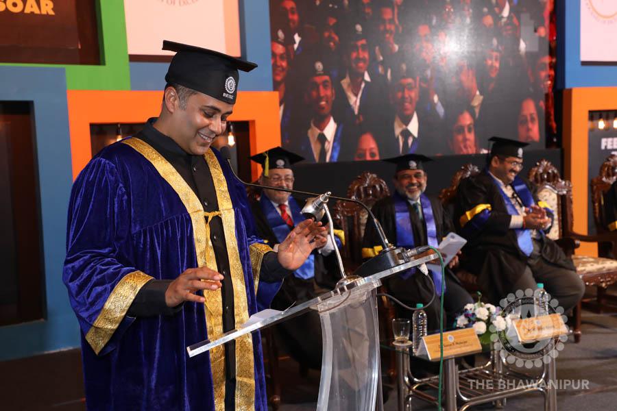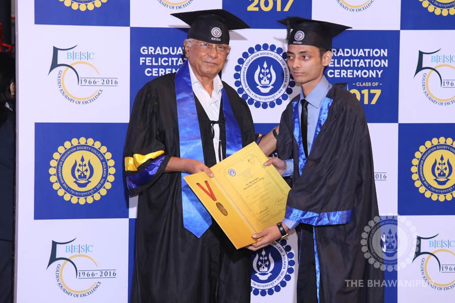 Gurudev Rabindra Nath Tagore’s immortal lines “Where the Mind is without Fear” played in the background as the Convocation procession – comprising of the Chairman of the Bhawanipur Education Society College, Champak Bhai Doshi; the Chief Guest Chetan Bhagat; the Vice Chairman Miraj D Shah; the Director General Prof Suman K Mukherjee; the Dean of Student Affairs Prof Dilip Shah; the Rector; the Teacher in Charge and senior members of the faculty moved on stage in full ceremonial regalia. The Guests were welcomed and the Ceremonial Lamp of Knowledge ignited to formally begin the proceedings of the solemn occasion – the Convocation of the Class of 2017.