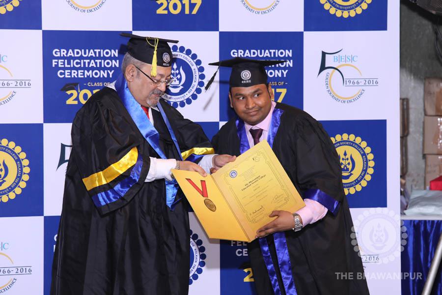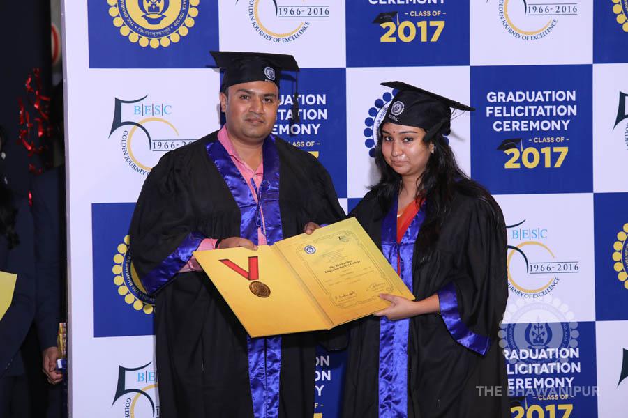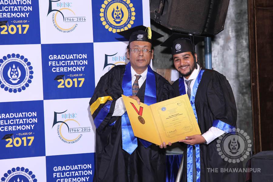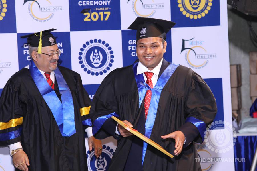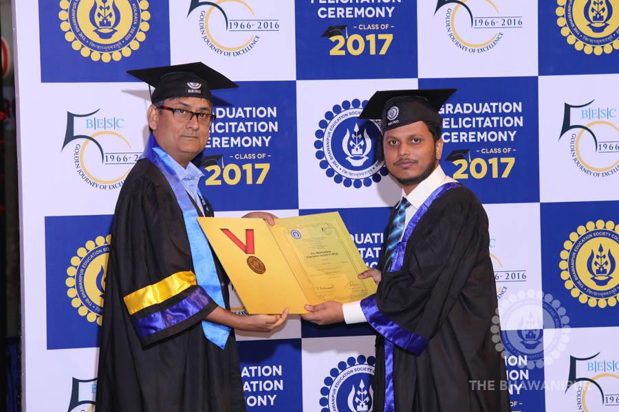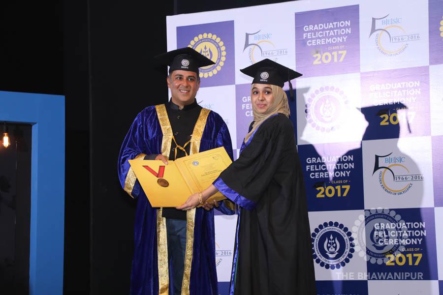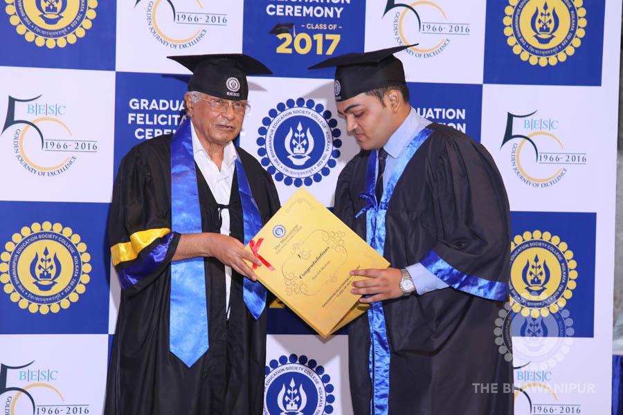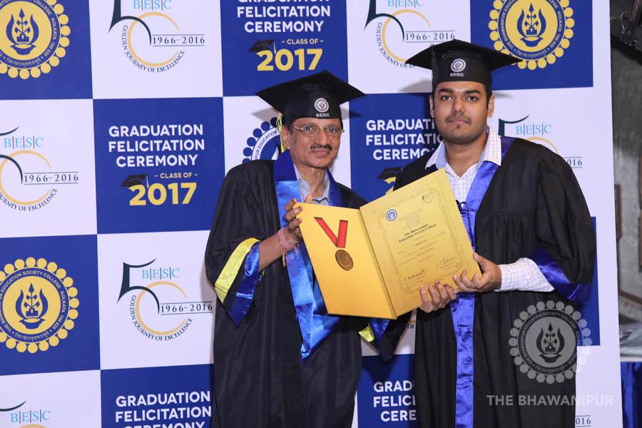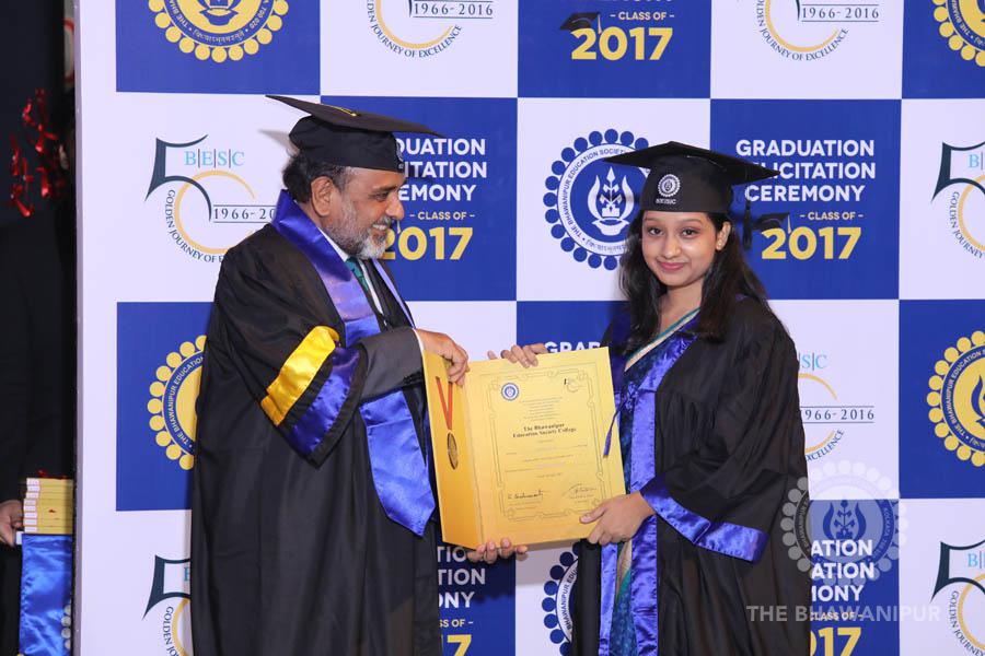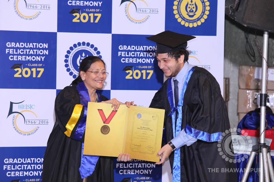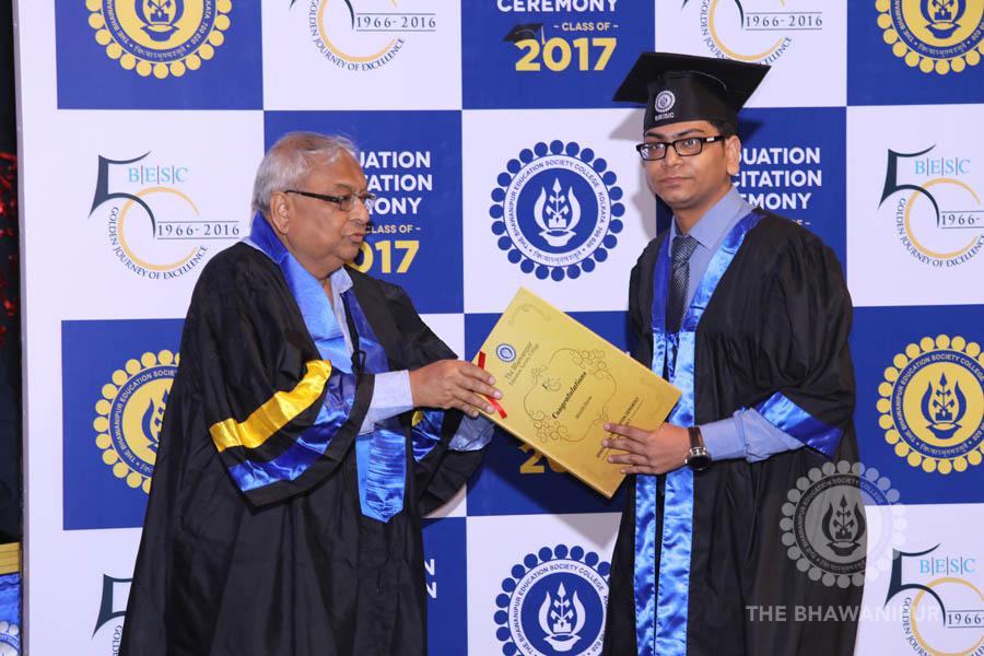 Gurudev Rabindra Nath Tagore’s immortal lines “Where the Mind is without Fear” played in the background as the Convocation procession – comprising of the Chairman of the Bhawanipur Education Society College, Champak Bhai Doshi; the Chief Guest Chetan Bhagat; the Vice Chairman Miraj D Shah; the Director General Prof Suman K Mukherjee; the Dean of Student Affairs Prof Dilip Shah; the Rector; the Teacher in Charge and senior members of the faculty moved on stage in full ceremonial regalia. The Guests were welcomed and the Ceremonial Lamp of Knowledge ignited to formally begin the proceedings of the solemn occasion – the Convocation of the Class of 2017.