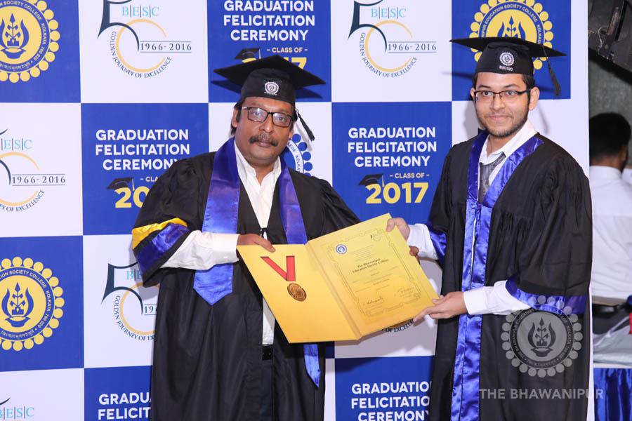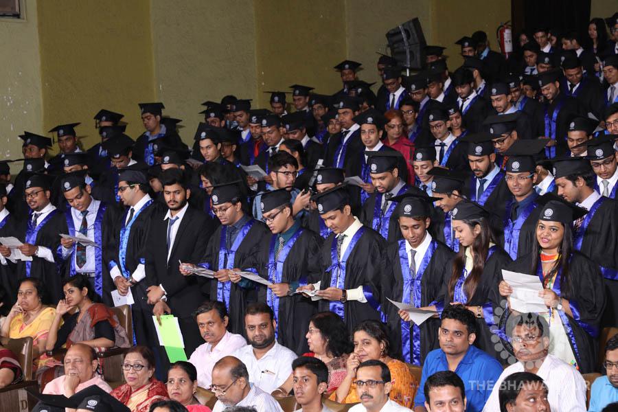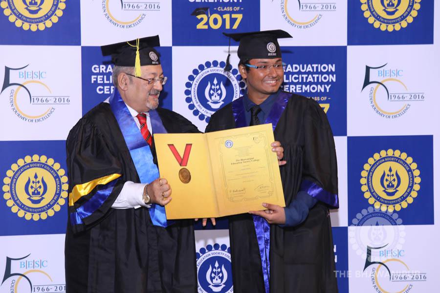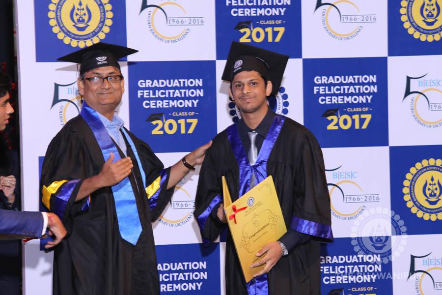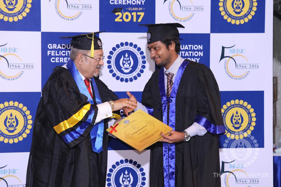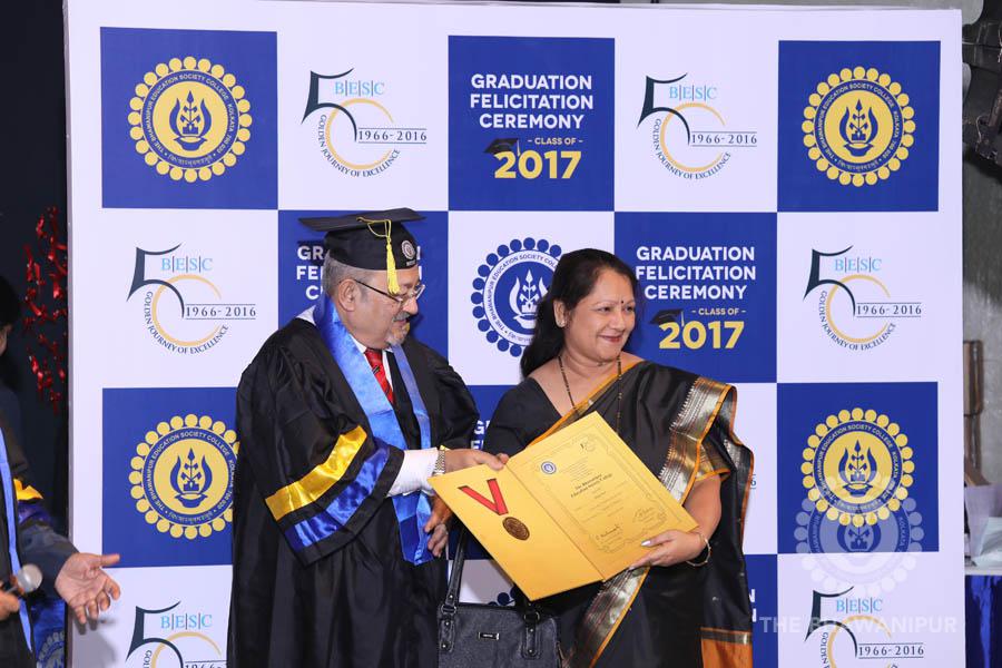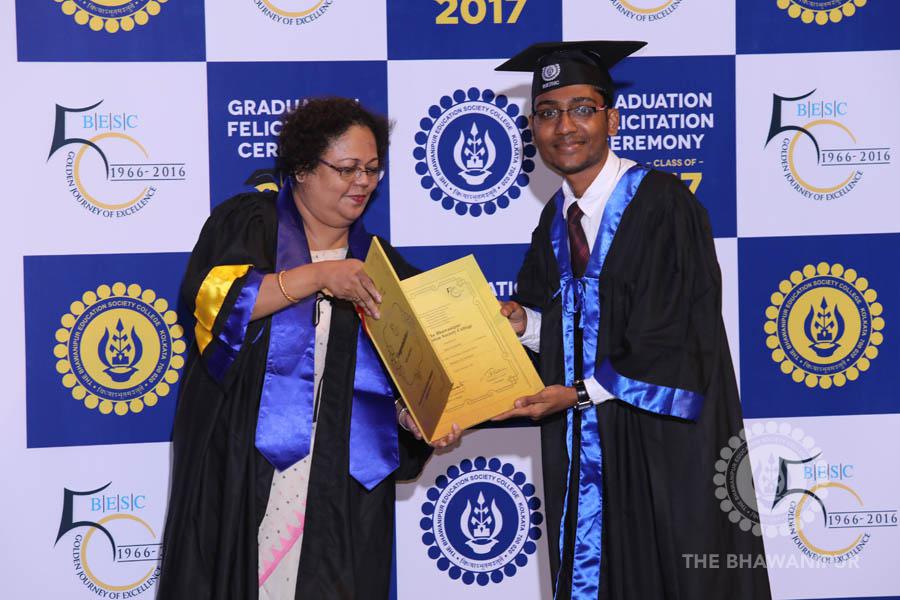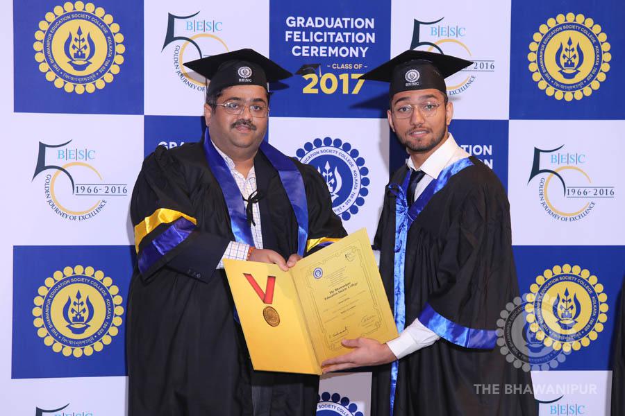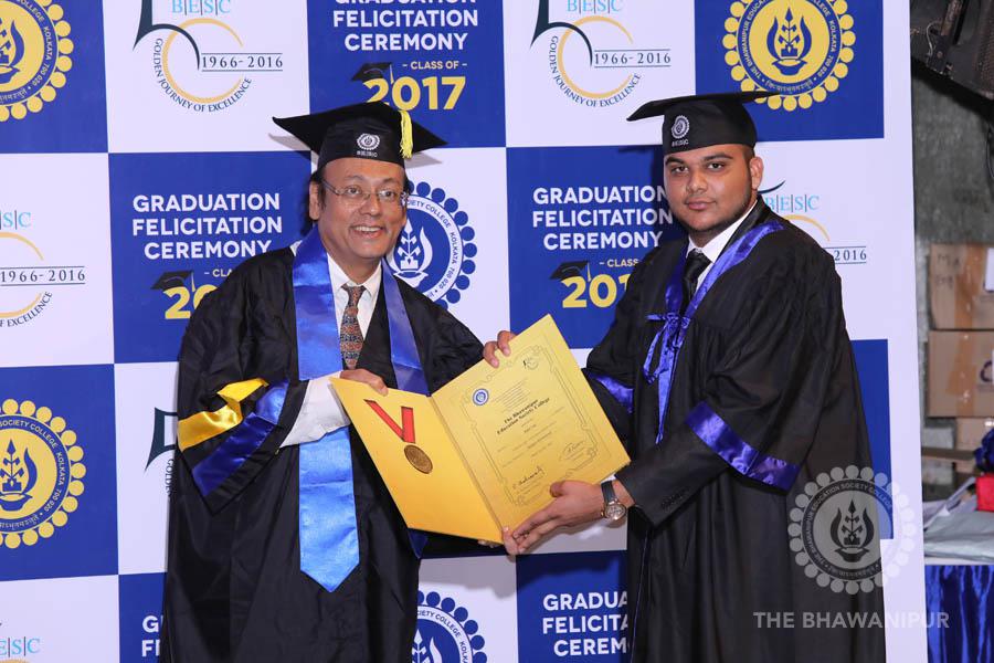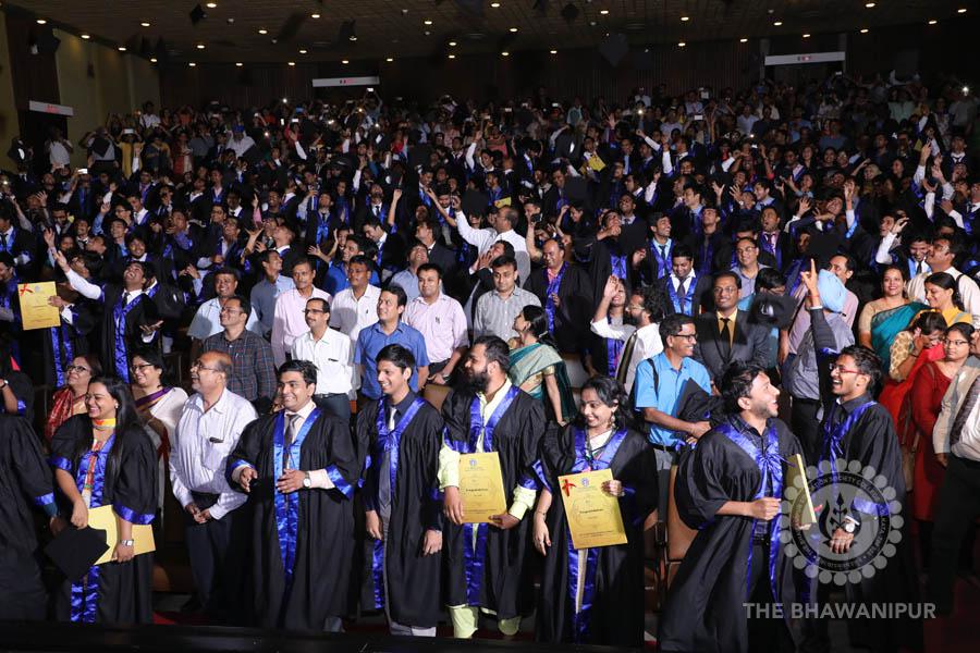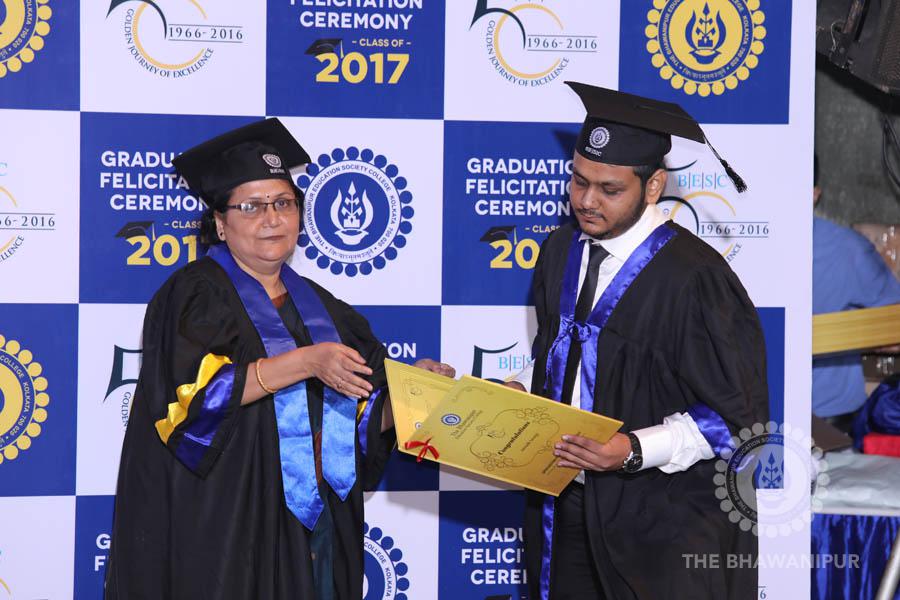 Gurudev Rabindra Nath Tagore’s immortal lines “Where the Mind is without Fear” played in the background as the Convocation procession – comprising of the Chairman of the Bhawanipur Education Society College, Champak Bhai Doshi; the Chief Guest Chetan Bhagat; the Vice Chairman Miraj D Shah; the Director General Prof Suman K Mukherjee; the Dean of Student Affairs Prof Dilip Shah; the Rector; the Teacher in Charge and senior members of the faculty moved on stage in full ceremonial regalia. The Guests were welcomed and the Ceremonial Lamp of Knowledge ignited to formally begin the proceedings of the solemn occasion – the Convocation of the Class of 2017.