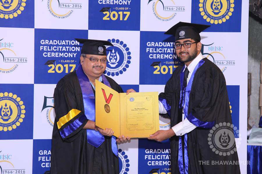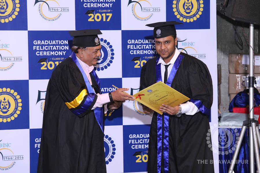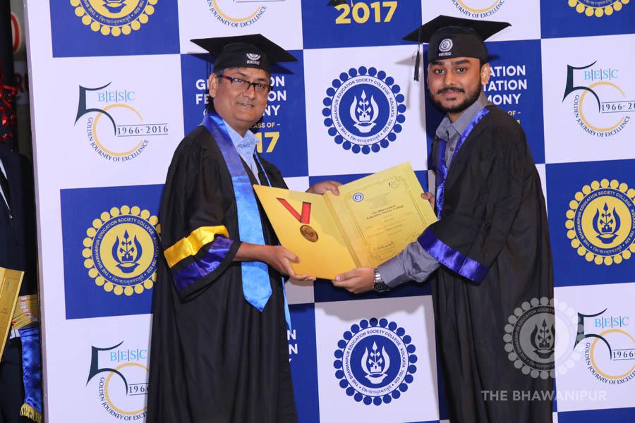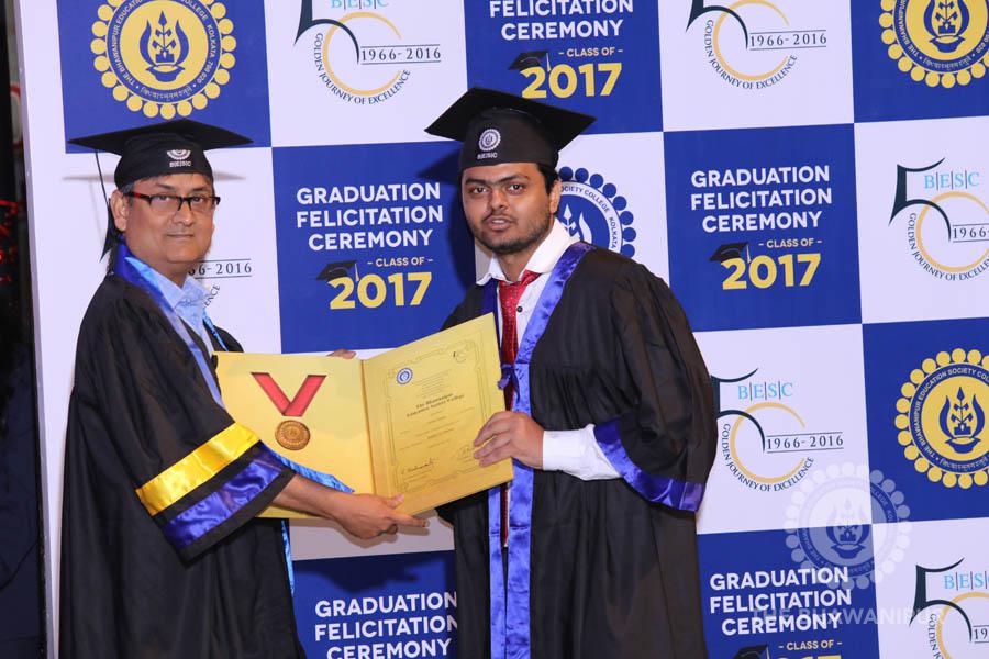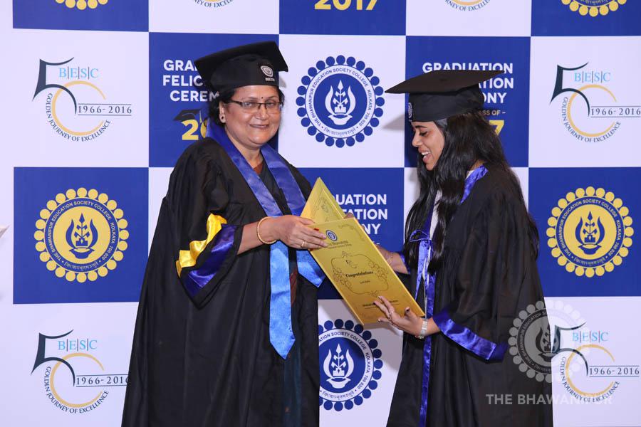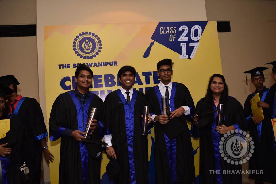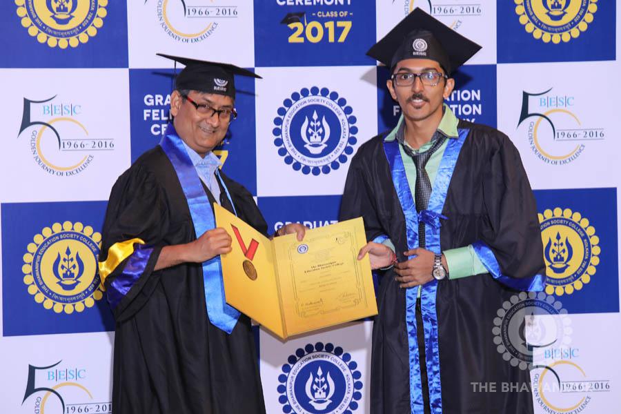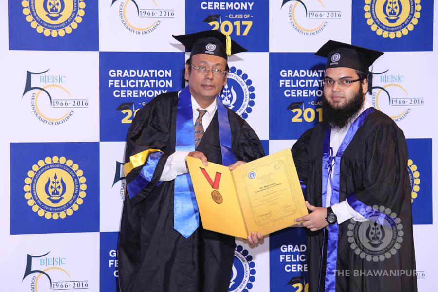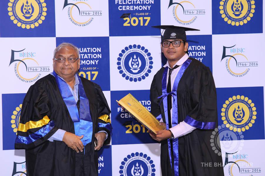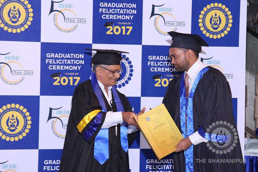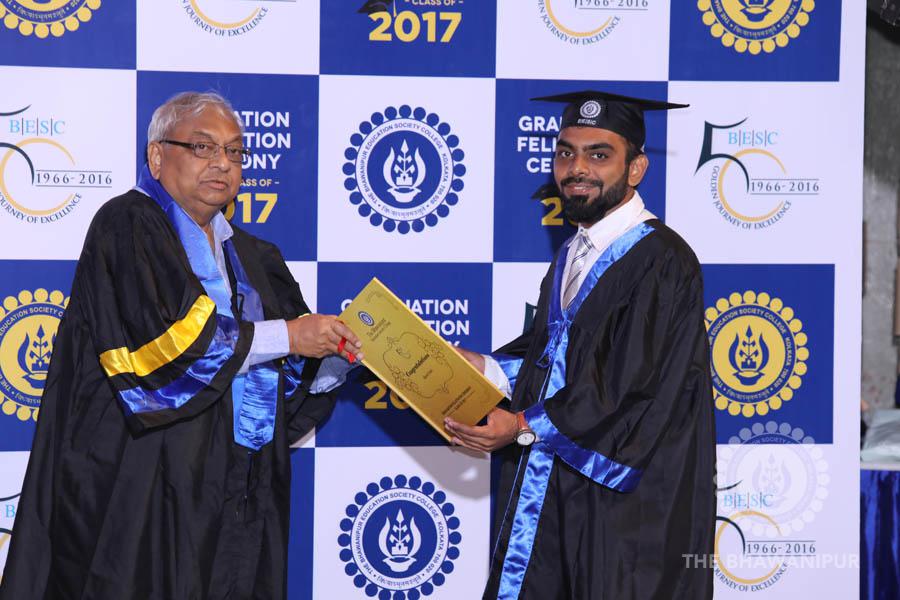 Gurudev Rabindra Nath Tagore’s immortal lines “Where the Mind is without Fear” played in the background as the Convocation procession – comprising of the Chairman of the Bhawanipur Education Society College, Champak Bhai Doshi; the Chief Guest Chetan Bhagat; the Vice Chairman Miraj D Shah; the Director General Prof Suman K Mukherjee; the Dean of Student Affairs Prof Dilip Shah; the Rector; the Teacher in Charge and senior members of the faculty moved on stage in full ceremonial regalia. The Guests were welcomed and the Ceremonial Lamp of Knowledge ignited to formally begin the proceedings of the solemn occasion – the Convocation of the Class of 2017.