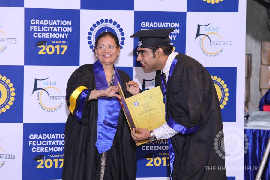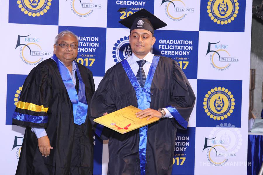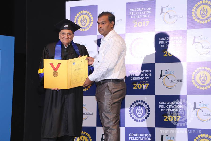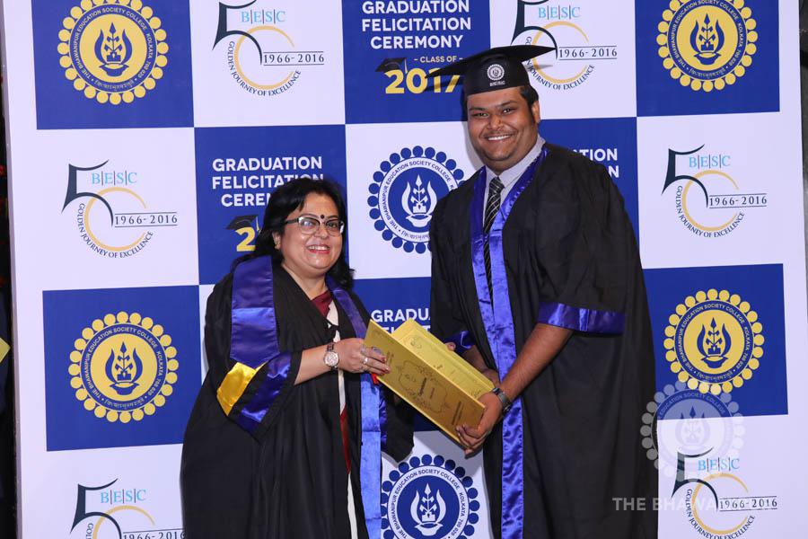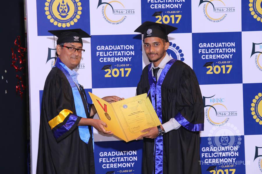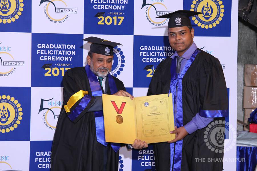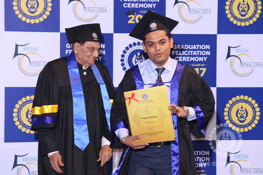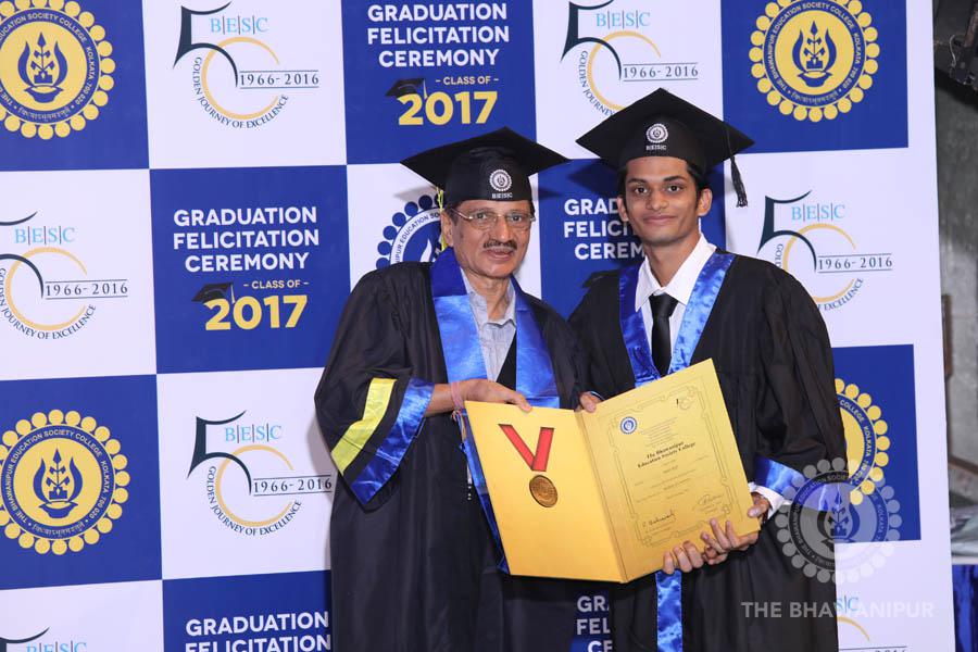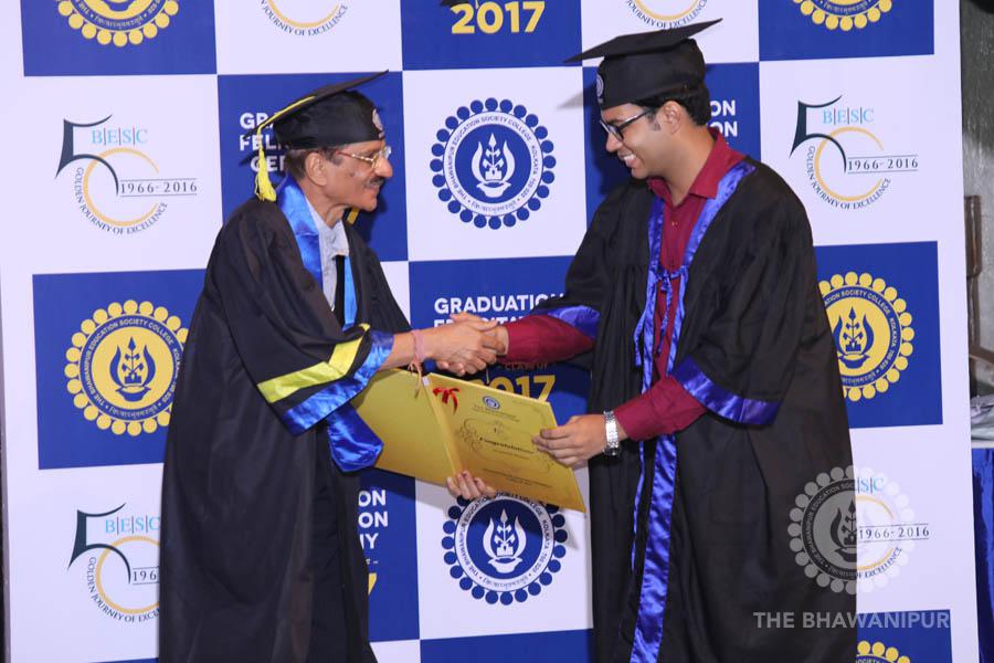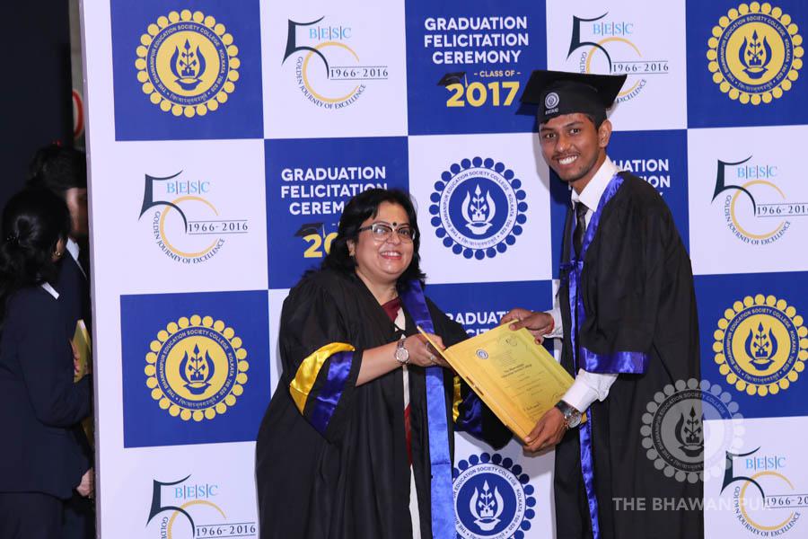 Gurudev Rabindra Nath Tagore’s immortal lines “Where the Mind is without Fear” played in the background as the Convocation procession – comprising of the Chairman of the Bhawanipur Education Society College, Champak Bhai Doshi; the Chief Guest Chetan Bhagat; the Vice Chairman Miraj D Shah; the Director General Prof Suman K Mukherjee; the Dean of Student Affairs Prof Dilip Shah; the Rector; the Teacher in Charge and senior members of the faculty moved on stage in full ceremonial regalia. The Guests were welcomed and the Ceremonial Lamp of Knowledge ignited to formally begin the proceedings of the solemn occasion – the Convocation of the Class of 2017.