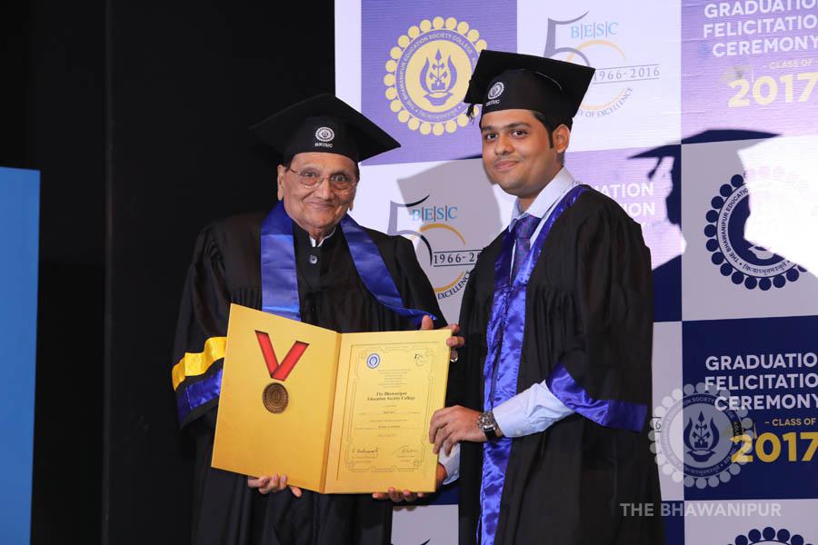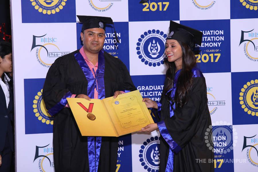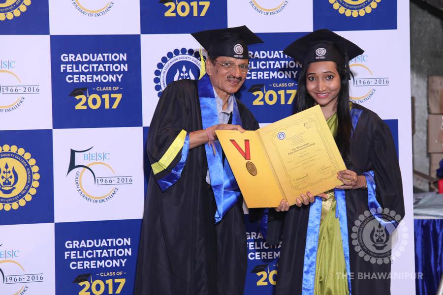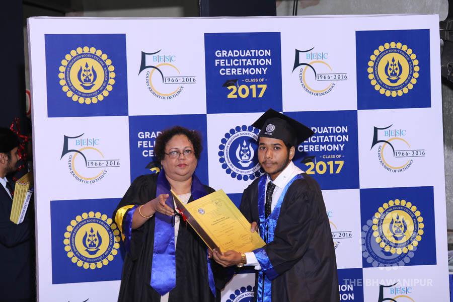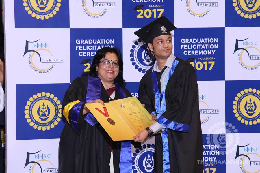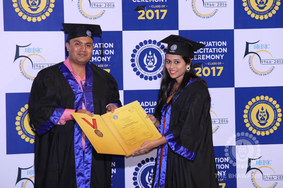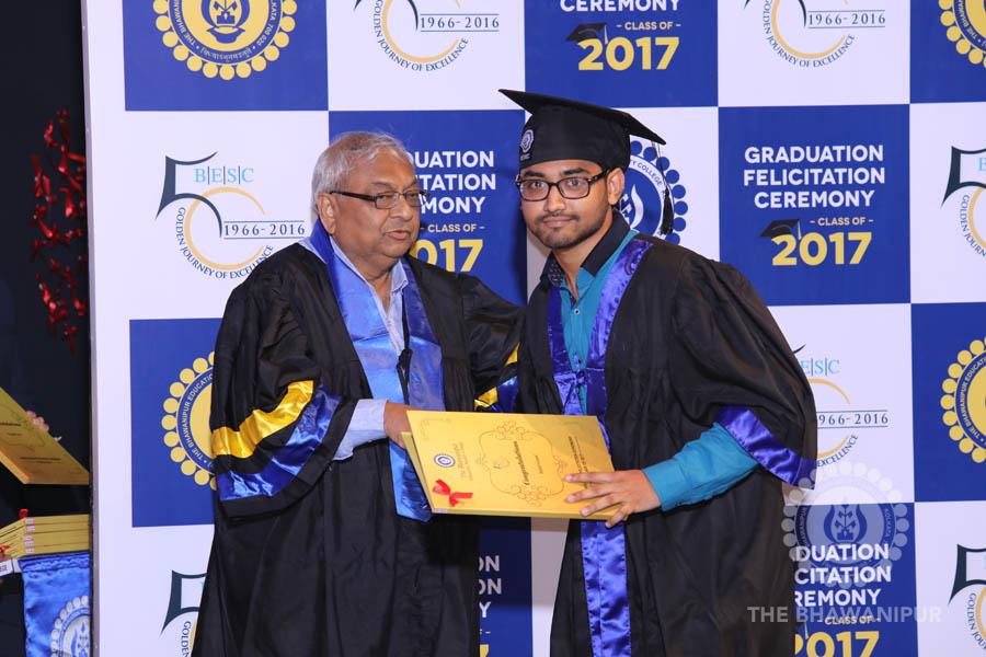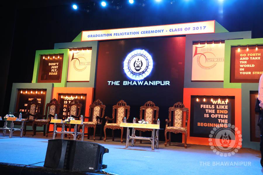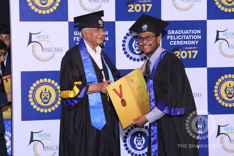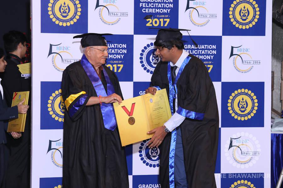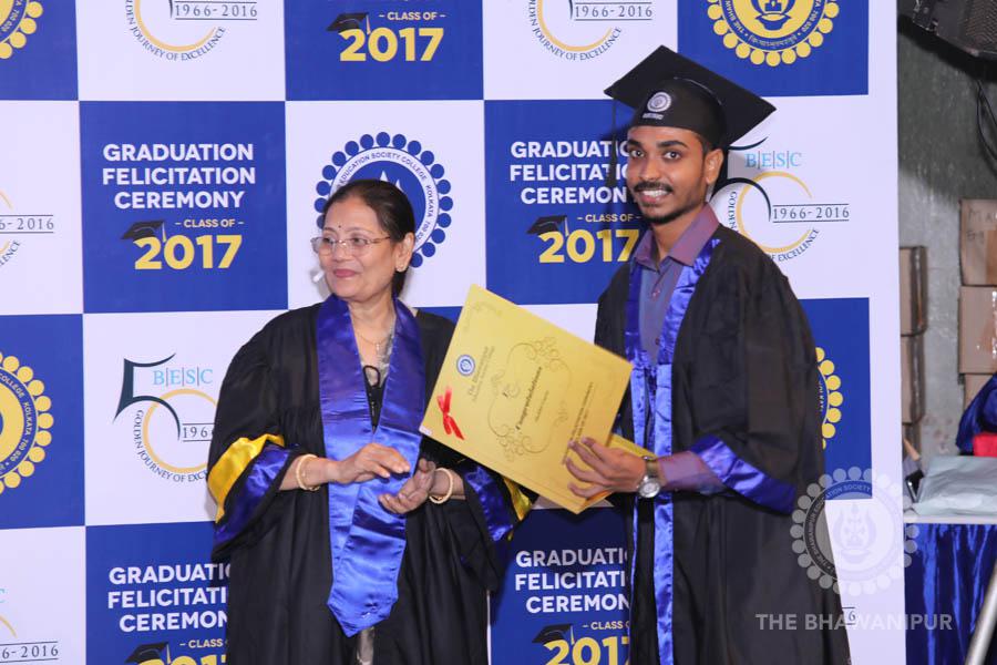 Gurudev Rabindra Nath Tagore’s immortal lines “Where the Mind is without Fear” played in the background as the Convocation procession – comprising of the Chairman of the Bhawanipur Education Society College, Champak Bhai Doshi; the Chief Guest Chetan Bhagat; the Vice Chairman Miraj D Shah; the Director General Prof Suman K Mukherjee; the Dean of Student Affairs Prof Dilip Shah; the Rector; the Teacher in Charge and senior members of the faculty moved on stage in full ceremonial regalia. The Guests were welcomed and the Ceremonial Lamp of Knowledge ignited to formally begin the proceedings of the solemn occasion – the Convocation of the Class of 2017.