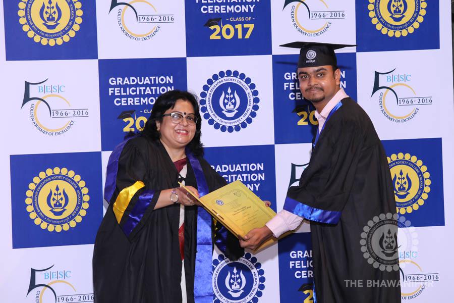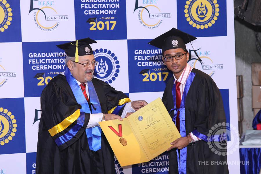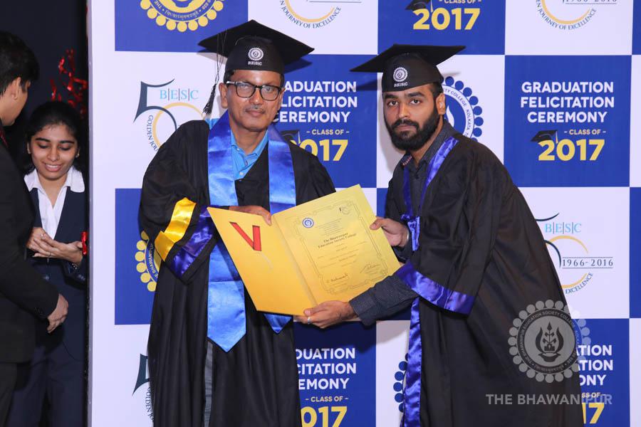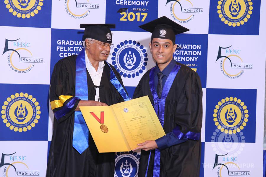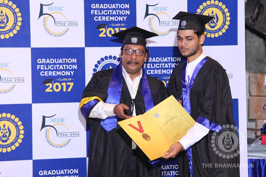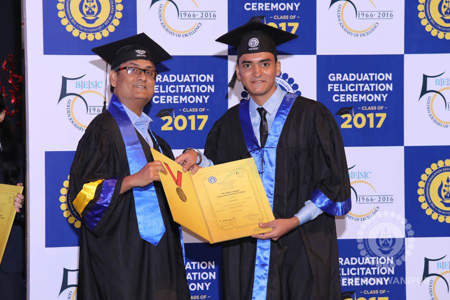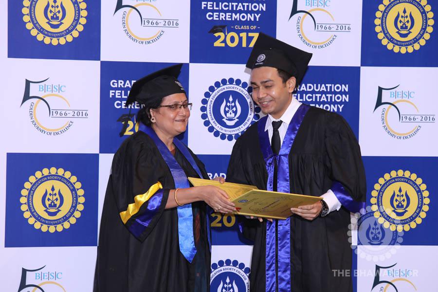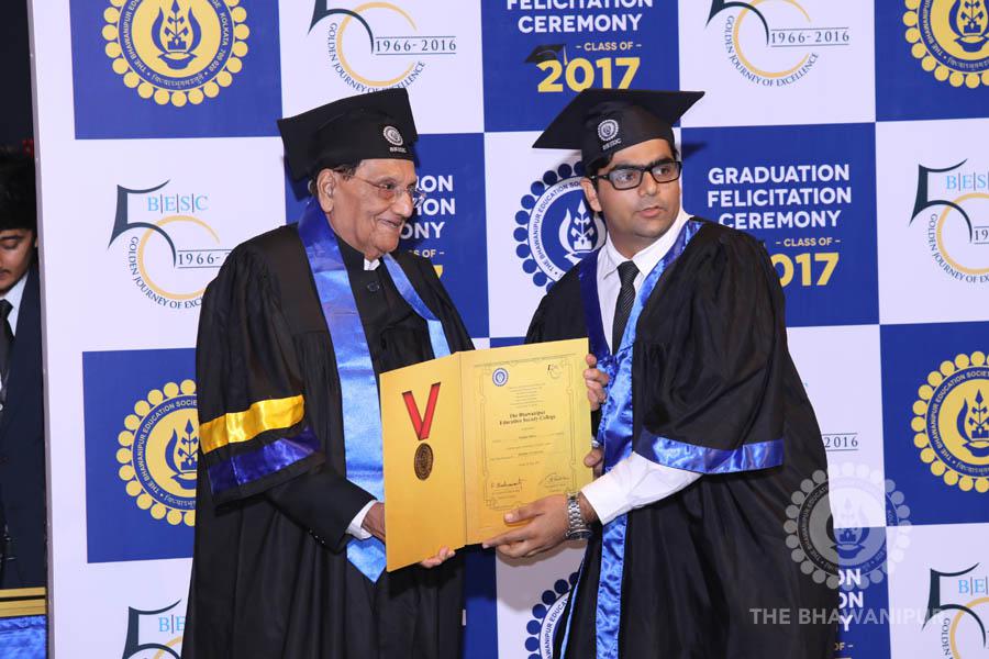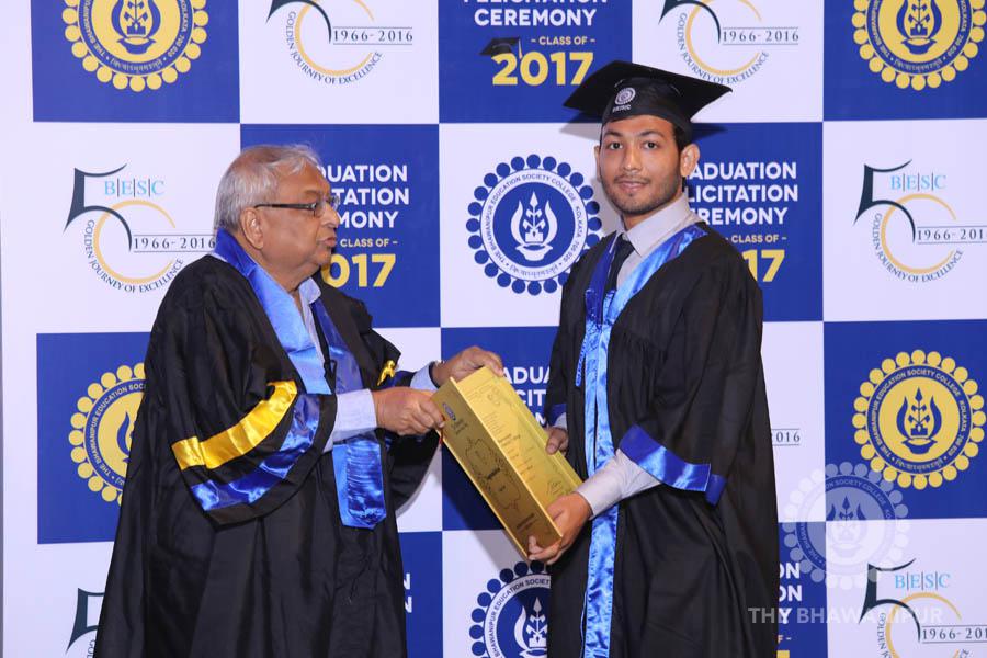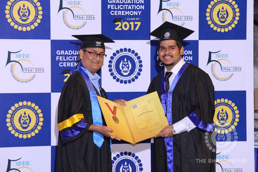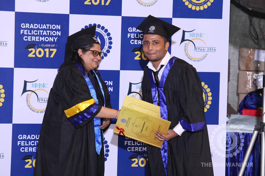 Gurudev Rabindra Nath Tagore’s immortal lines “Where the Mind is without Fear” played in the background as the Convocation procession – comprising of the Chairman of the Bhawanipur Education Society College, Champak Bhai Doshi; the Chief Guest Chetan Bhagat; the Vice Chairman Miraj D Shah; the Director General Prof Suman K Mukherjee; the Dean of Student Affairs Prof Dilip Shah; the Rector; the Teacher in Charge and senior members of the faculty moved on stage in full ceremonial regalia. The Guests were welcomed and the Ceremonial Lamp of Knowledge ignited to formally begin the proceedings of the solemn occasion – the Convocation of the Class of 2017.