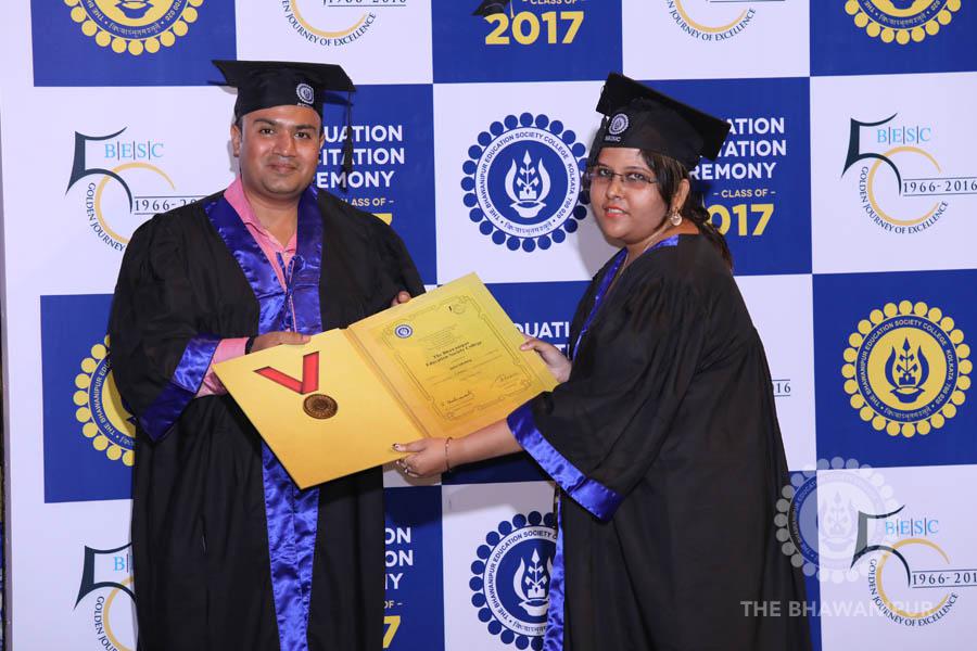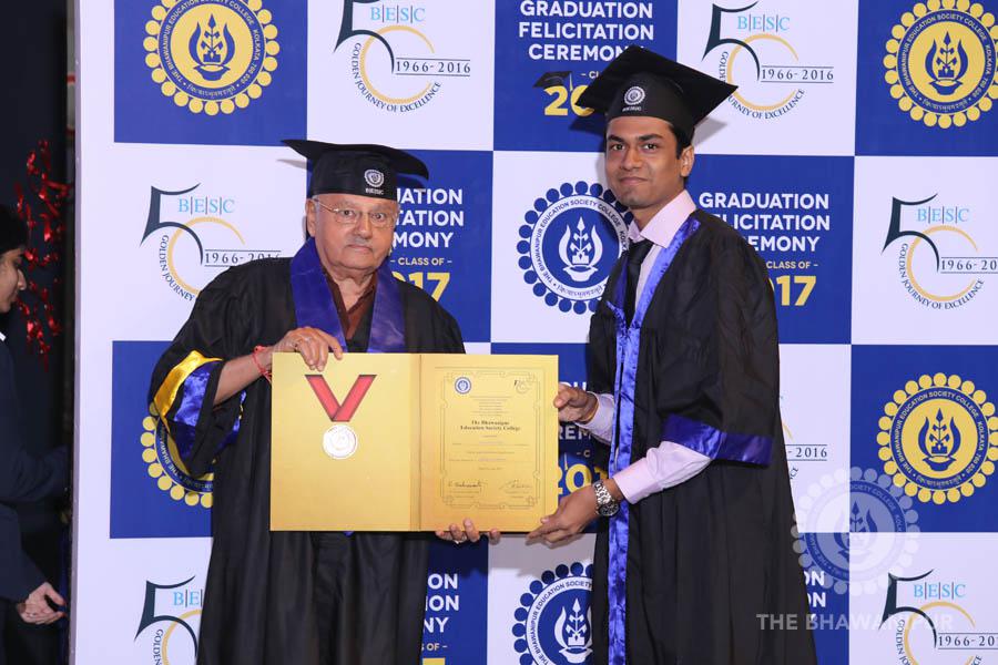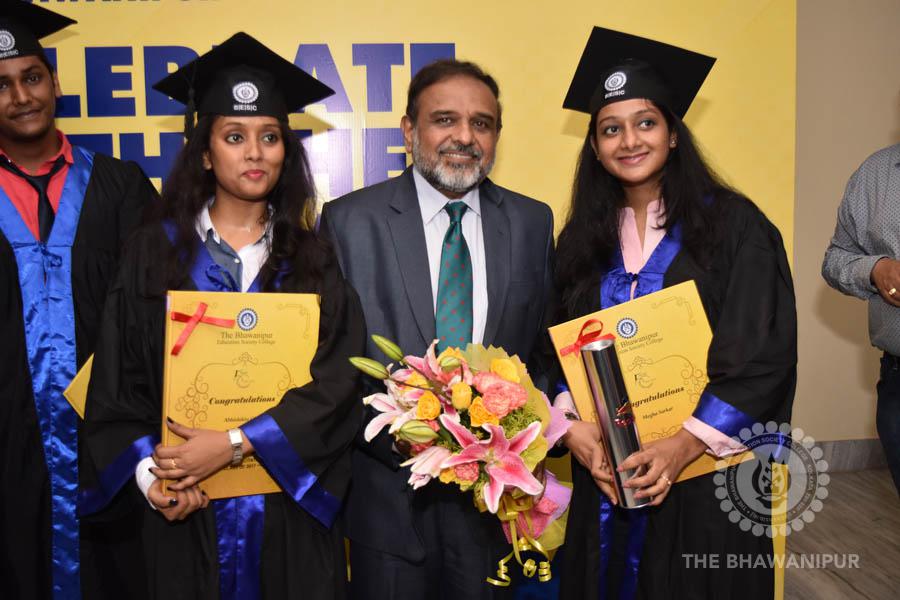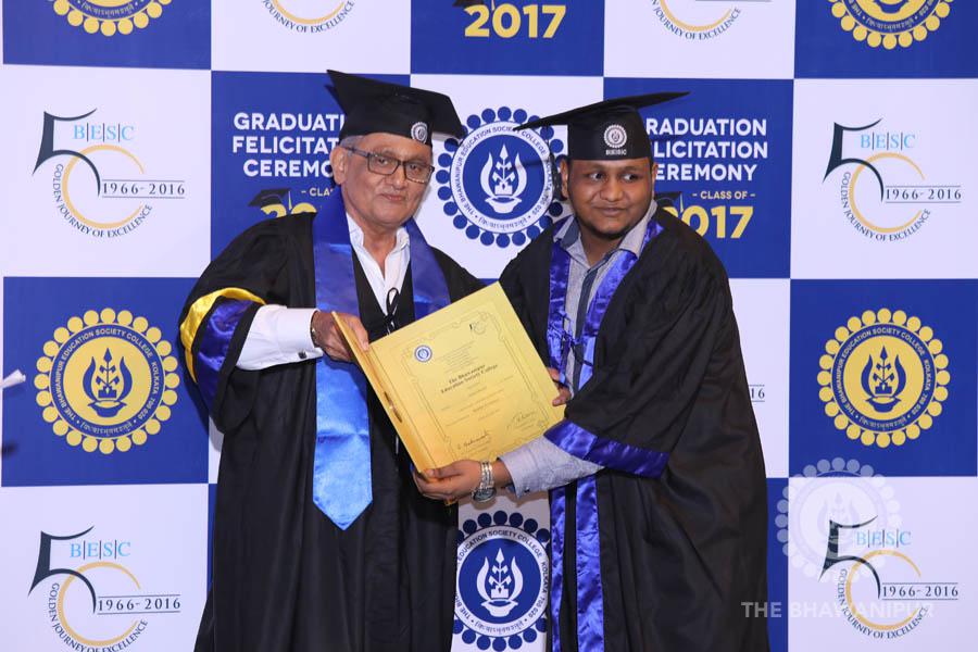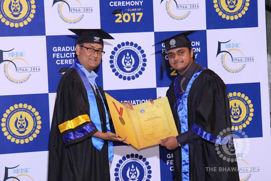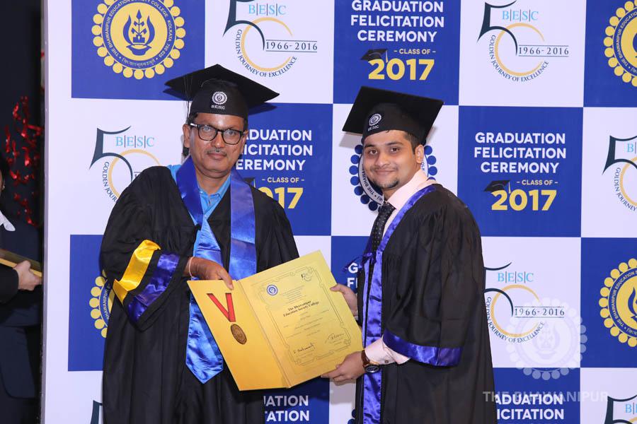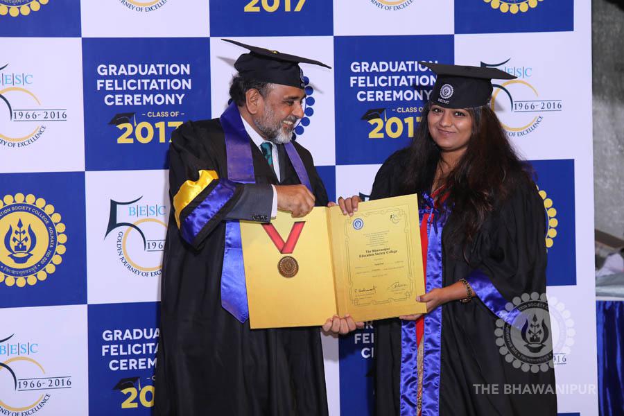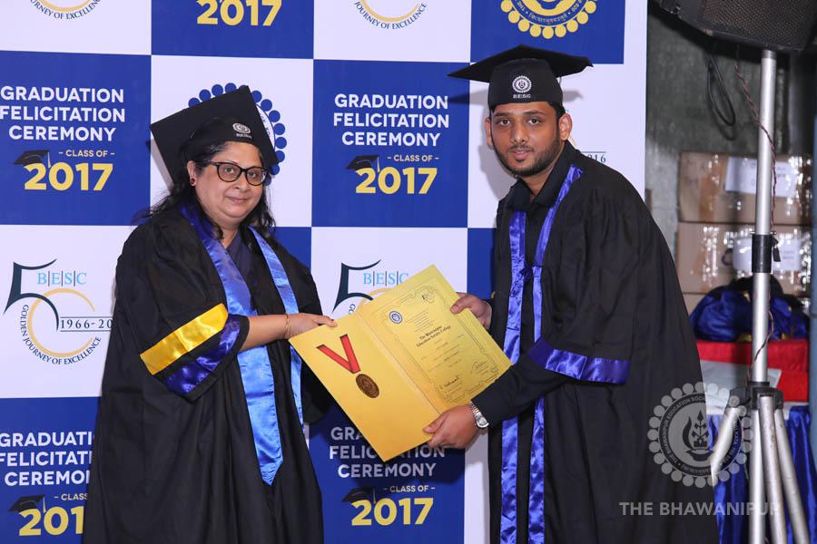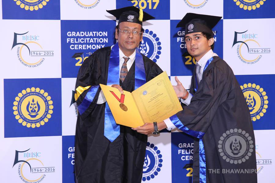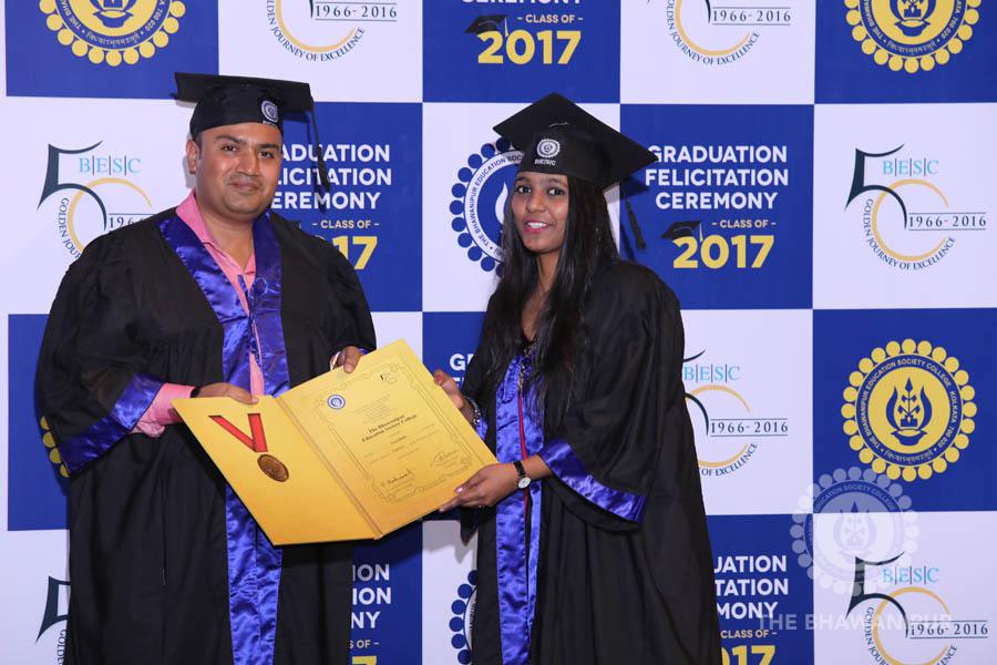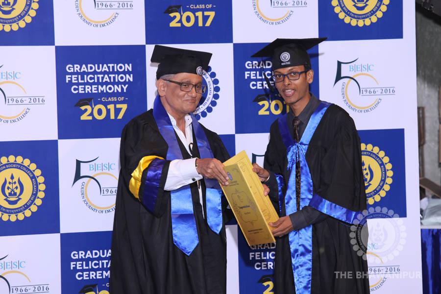 Gurudev Rabindra Nath Tagore’s immortal lines “Where the Mind is without Fear” played in the background as the Convocation procession – comprising of the Chairman of the Bhawanipur Education Society College, Champak Bhai Doshi; the Chief Guest Chetan Bhagat; the Vice Chairman Miraj D Shah; the Director General Prof Suman K Mukherjee; the Dean of Student Affairs Prof Dilip Shah; the Rector; the Teacher in Charge and senior members of the faculty moved on stage in full ceremonial regalia. The Guests were welcomed and the Ceremonial Lamp of Knowledge ignited to formally begin the proceedings of the solemn occasion – the Convocation of the Class of 2017.