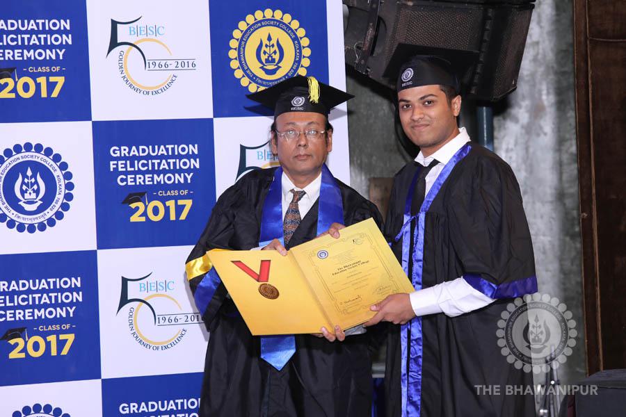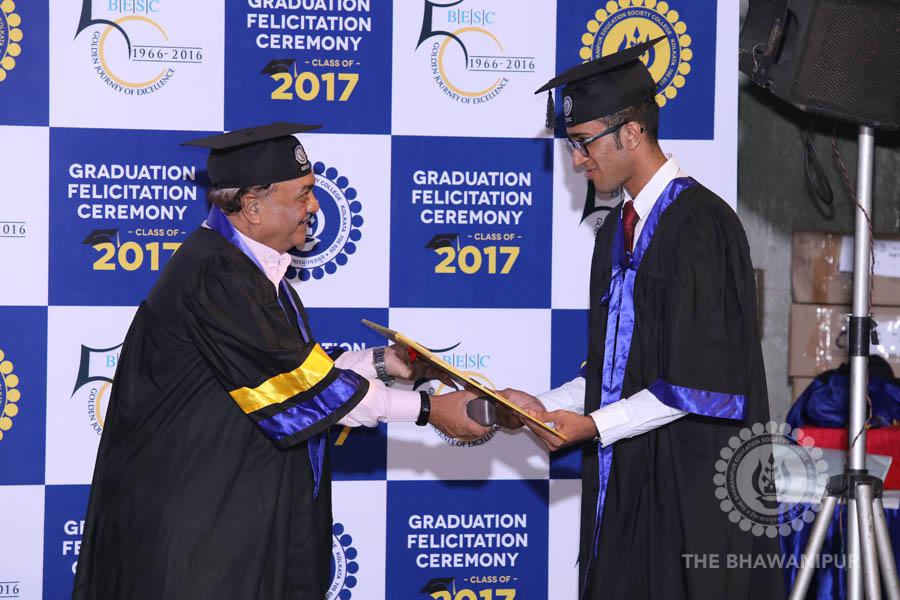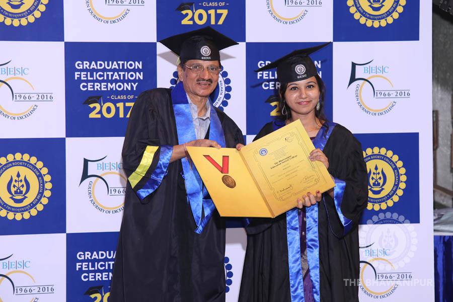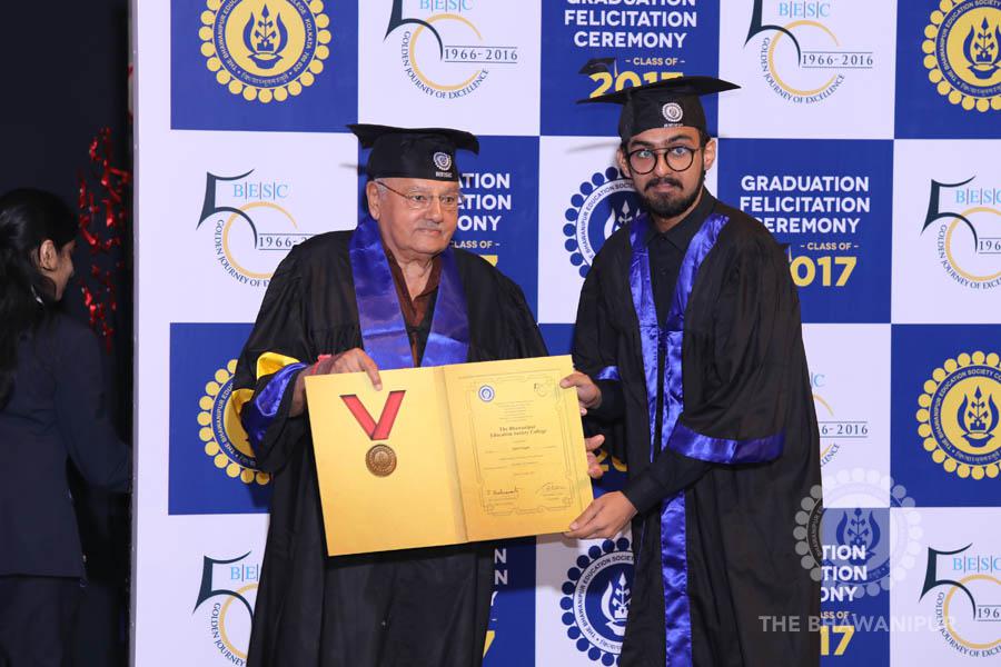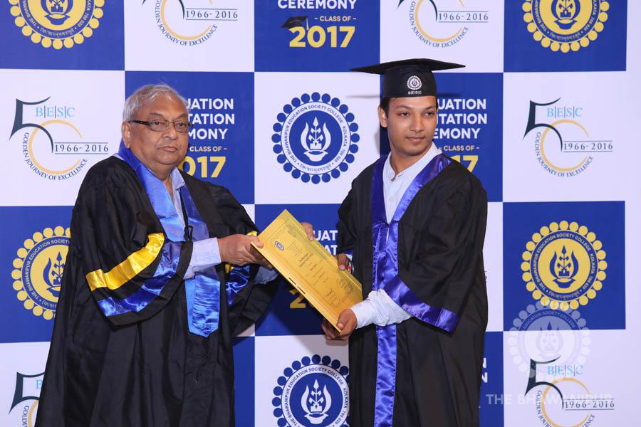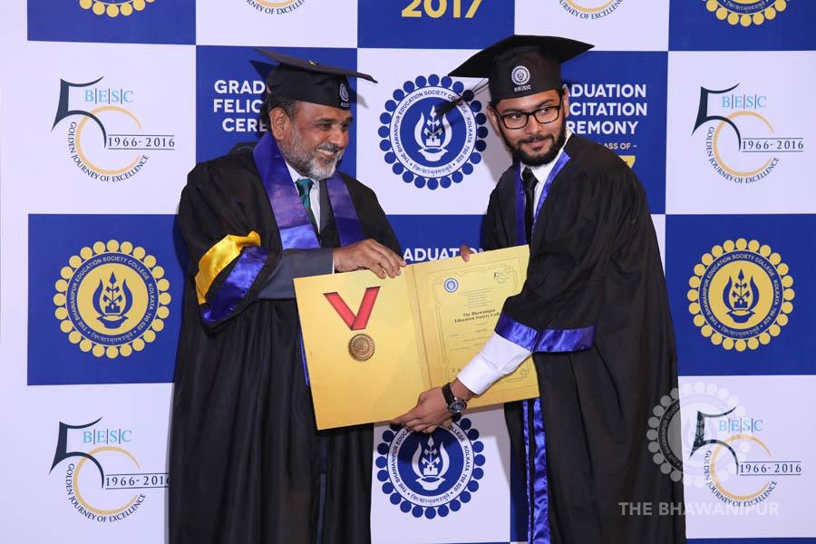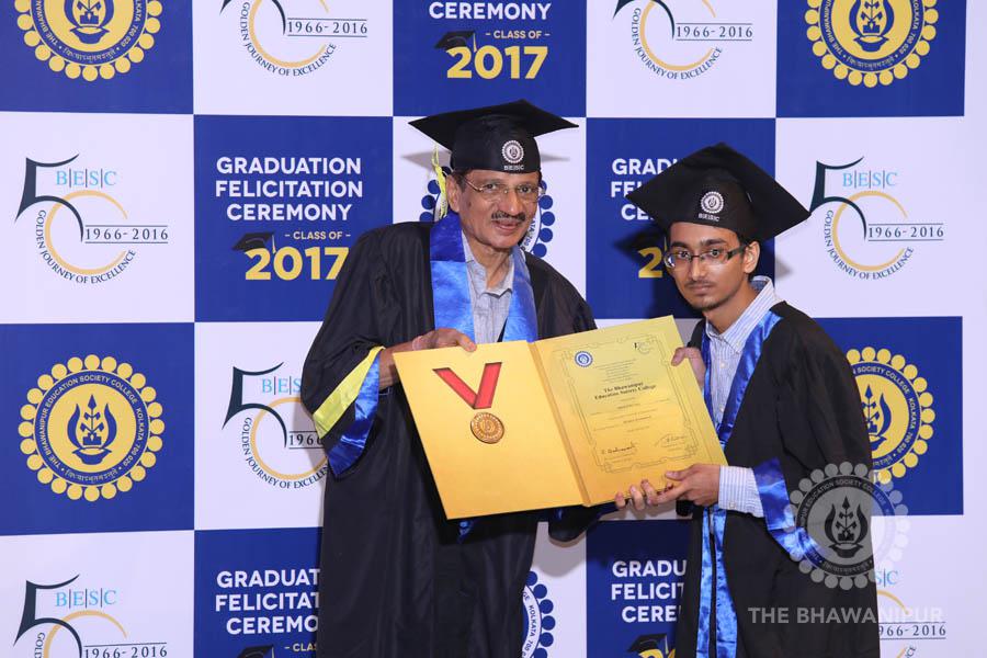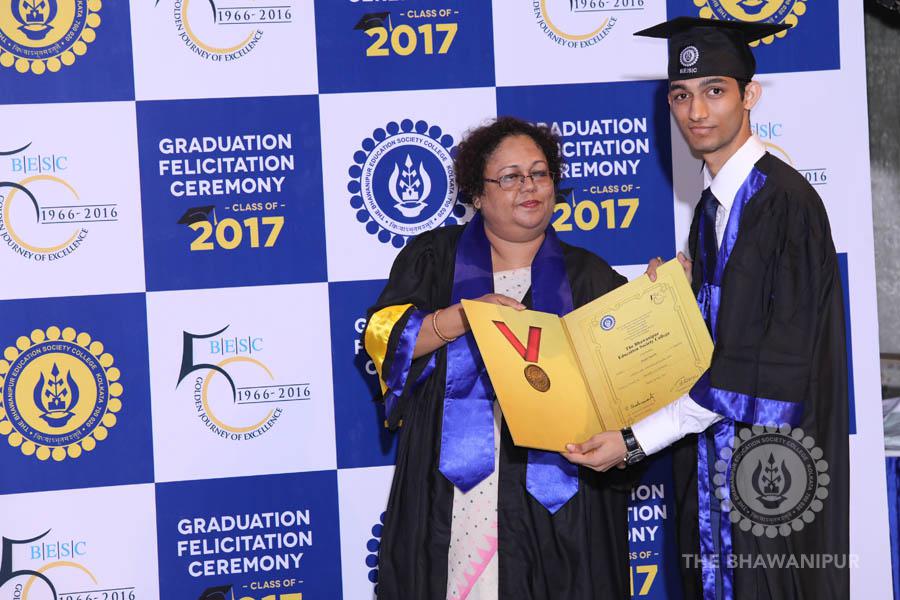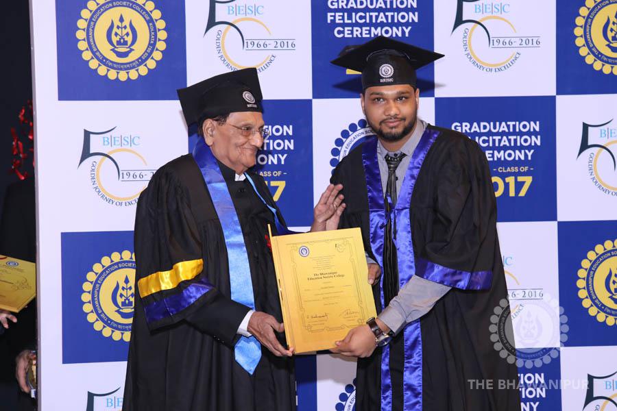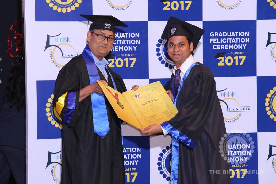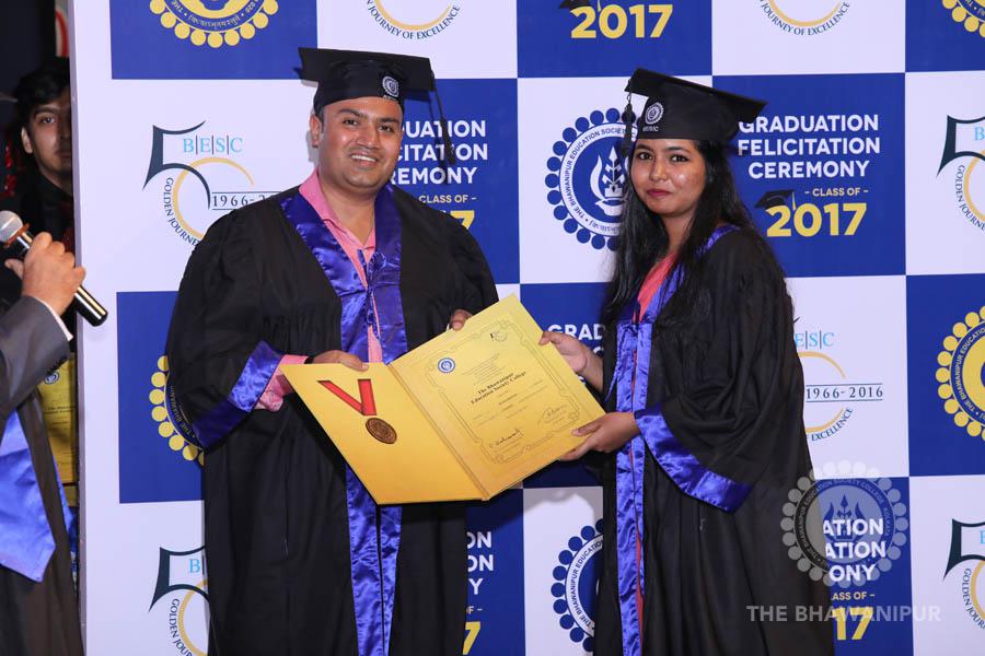 Gurudev Rabindra Nath Tagore’s immortal lines “Where the Mind is without Fear” played in the background as the Convocation procession – comprising of the Chairman of the Bhawanipur Education Society College, Champak Bhai Doshi; the Chief Guest Chetan Bhagat; the Vice Chairman Miraj D Shah; the Director General Prof Suman K Mukherjee; the Dean of Student Affairs Prof Dilip Shah; the Rector; the Teacher in Charge and senior members of the faculty moved on stage in full ceremonial regalia. The Guests were welcomed and the Ceremonial Lamp of Knowledge ignited to formally begin the proceedings of the solemn occasion – the Convocation of the Class of 2017.
