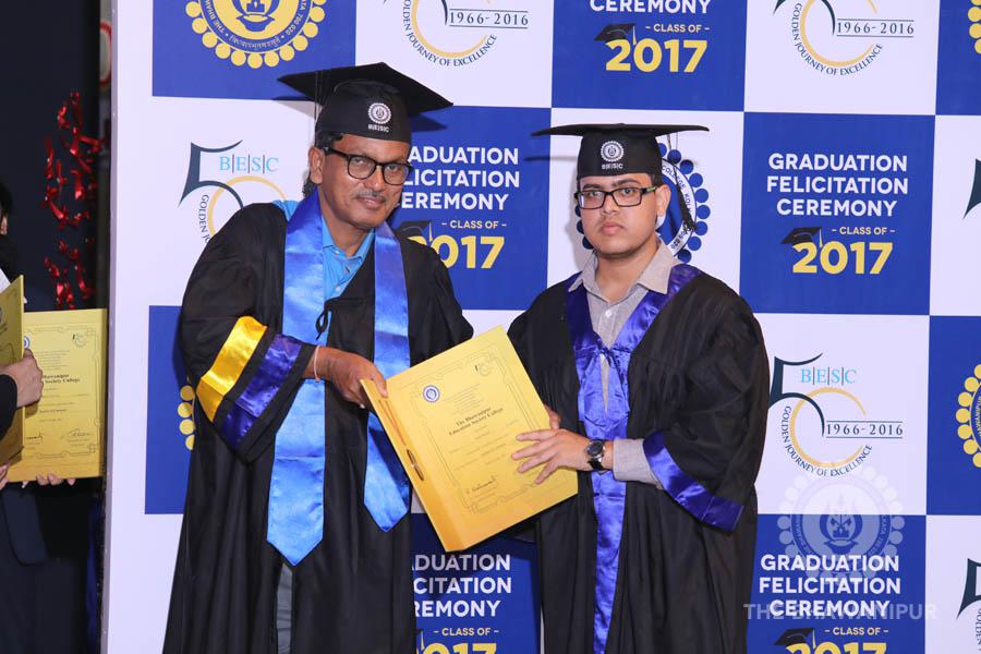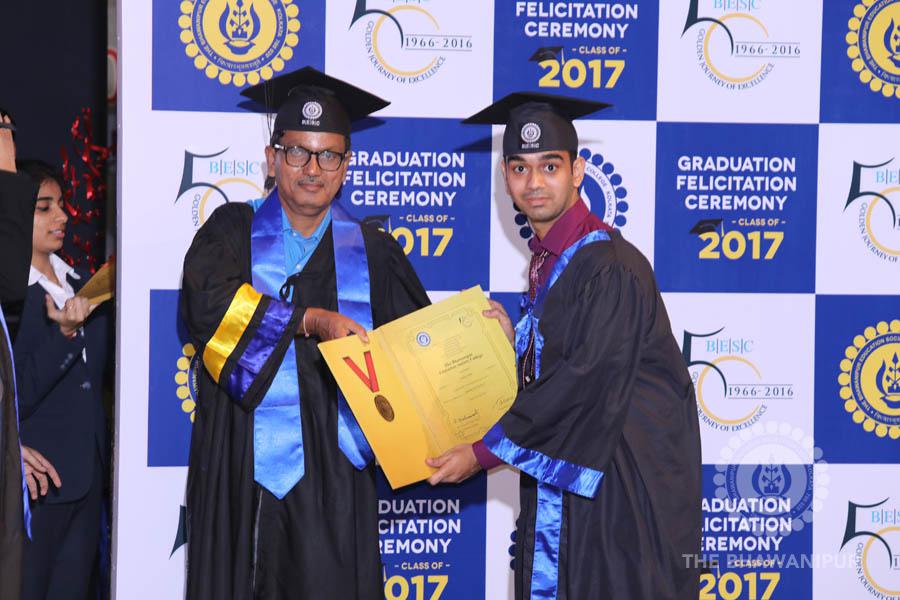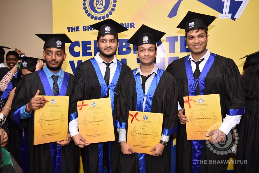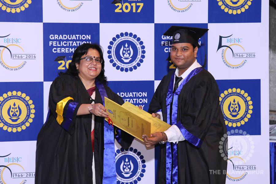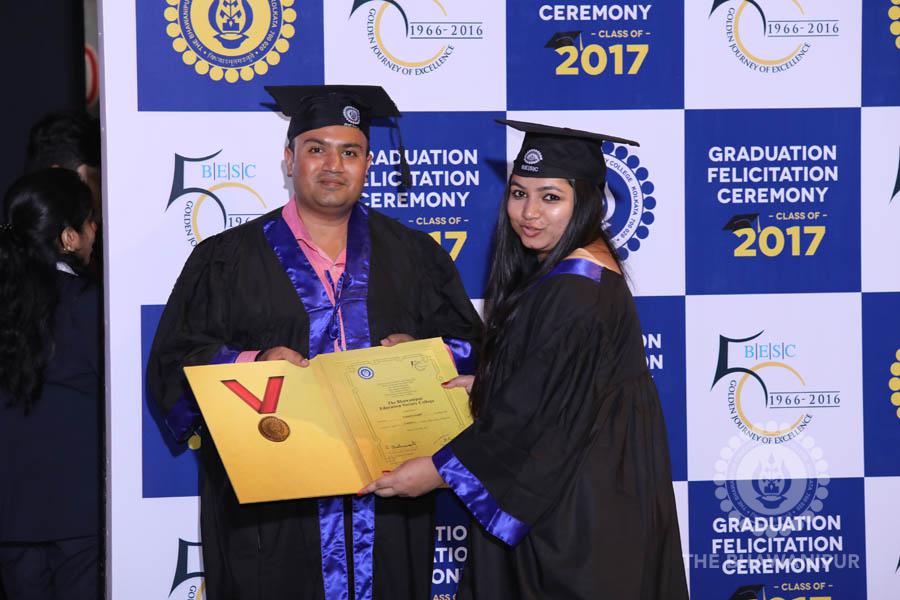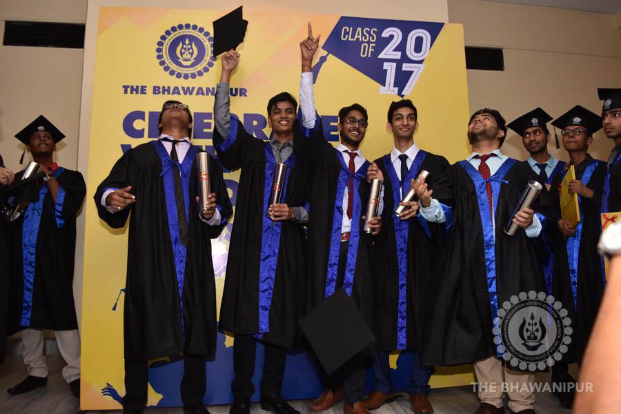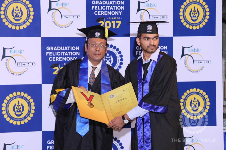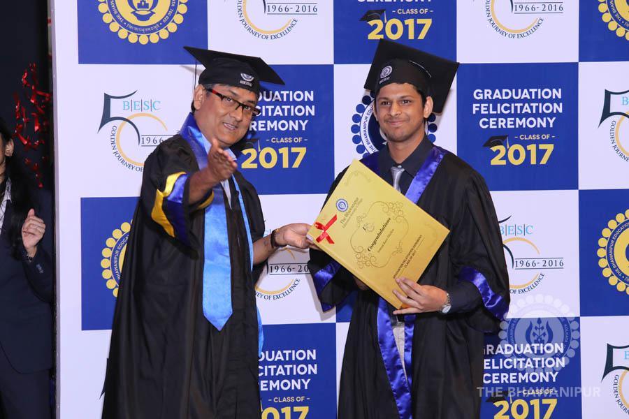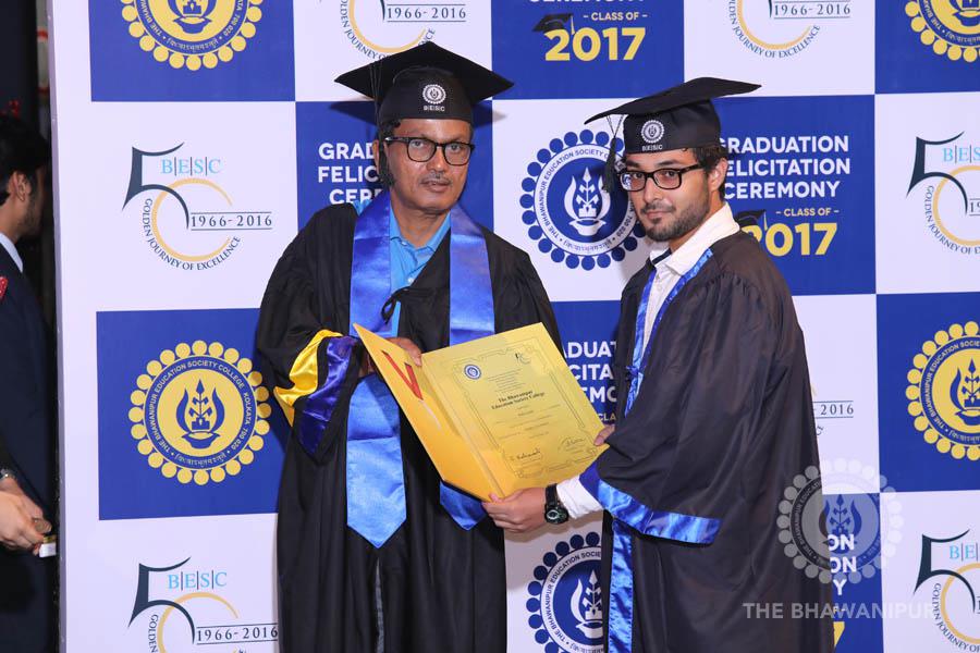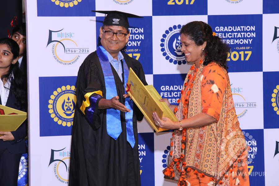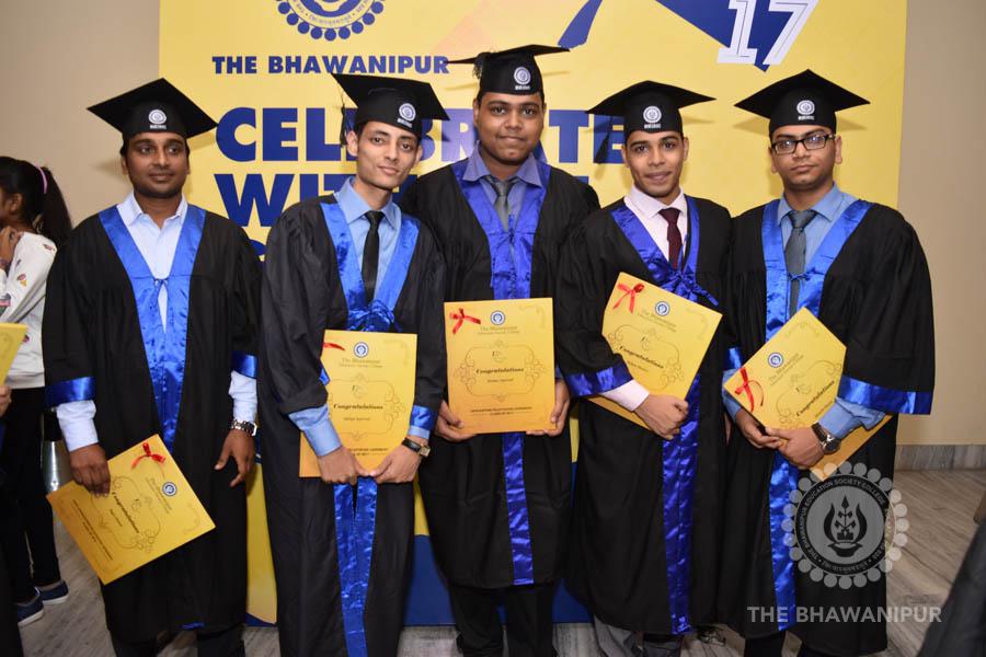 Gurudev Rabindra Nath Tagore’s immortal lines “Where the Mind is without Fear” played in the background as the Convocation procession – comprising of the Chairman of the Bhawanipur Education Society College, Champak Bhai Doshi; the Chief Guest Chetan Bhagat; the Vice Chairman Miraj D Shah; the Director General Prof Suman K Mukherjee; the Dean of Student Affairs Prof Dilip Shah; the Rector; the Teacher in Charge and senior members of the faculty moved on stage in full ceremonial regalia. The Guests were welcomed and the Ceremonial Lamp of Knowledge ignited to formally begin the proceedings of the solemn occasion – the Convocation of the Class of 2017.